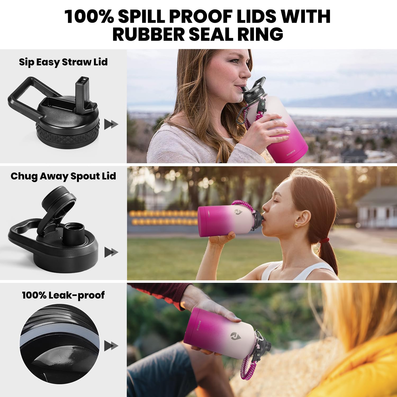 Full Seal Leak-proof Lids: All scenario spout and straw lid with rubber seal ring ensures not a single drop leaks no matter how bumpy your journey gets.Straw lid allows for a quick refreshment without stopping you, while spout lid is great for proper hydration whenever you feel like a boost.Keeps your drinks fresh and spill-resistant on the go