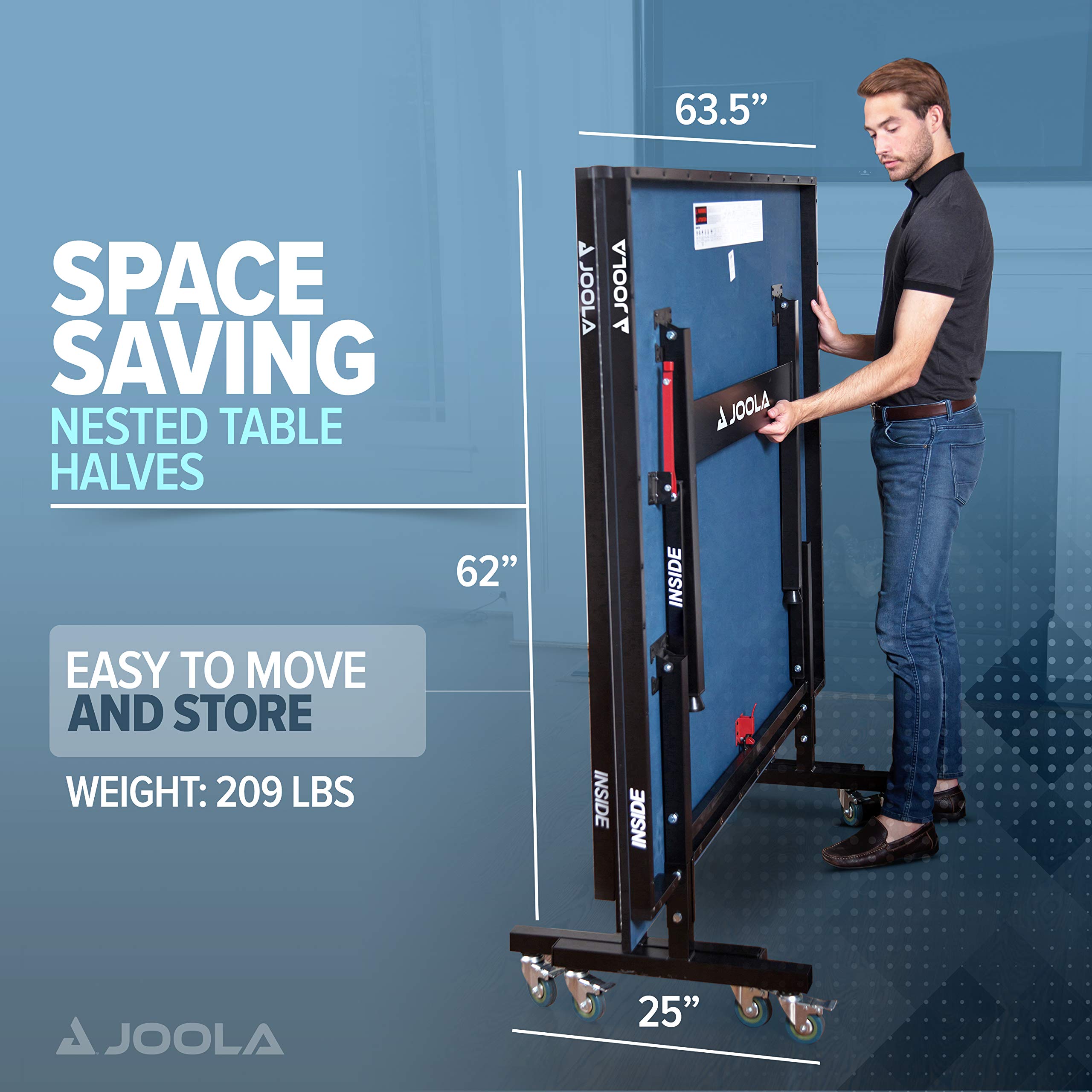 The JOOLA Inside 18 Table Tennis Table with Ping Pong Net Set has been JOOLA's best-selling table year after year! This is the perfect table for anyone looking for a fun-filled game of table tennis at an affordable price. This awesome ping pong table comes 95% pre-assembled and is ready to play in just 10 minutes! A sleek frame and separable nesting halves make this table tennis table perfect for compact storage. The professional-grade 3/4 inch (18 mm) wood composite surface creates a consistent ball bounce and durability. Additionally, the 1.5 inch apron and 1.5 inch diameter sturdy steel legs are used to create a durable table that lasts for years. The table legs feature adjustable height levelers to ensure a level playing surface and 3-inch locking caster wheels for added stability. The JOOLA Inside 18 Table Tennis Table features dual safety anti-tilting locking devices to ensure safety when the table is in both playing and storage positions. The included ping pong net and post set features a simple, sping activated removable clamp post and an adjustable net tension system. Start playing like a champion with equipment developed for champions! JOOLA is a proud sponsor of the US Open and the US National Team.