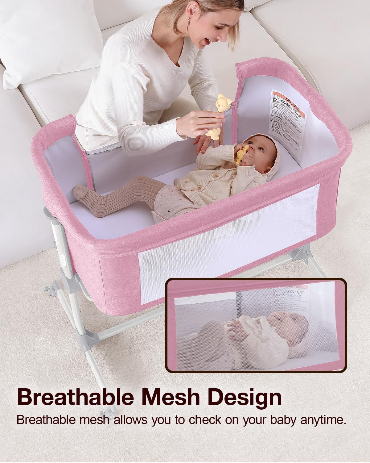 Comfy Mattress & Mesh : The mesh sides of the bedside crib provide good breathability and visibility, allowing you to keep an eye on your baby at all times. The soft mattress ensures your baby's comfortable sleep.