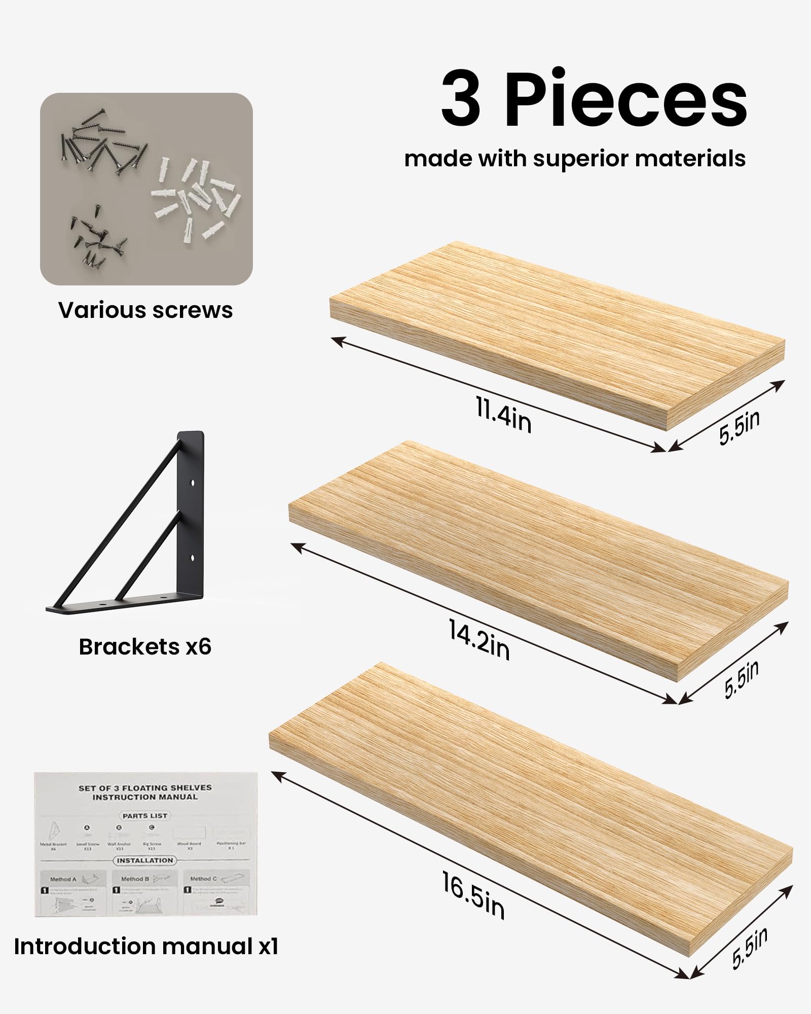 【Sturdier and Easy to Install】Large: 16.5 × 5.5 × 4.6 inches; Medium: 14.2 × 5.5 × 4.6 inches; Small: 11.4 × 5.5 × 4.6 inches. These floating shelves are wider and sturdier than others to safely hold collectibles, photos, small plants and showcase favorite dishes or build your own coffee bar. Easy to assemble with all necessary hardware included according to the instruction steps.