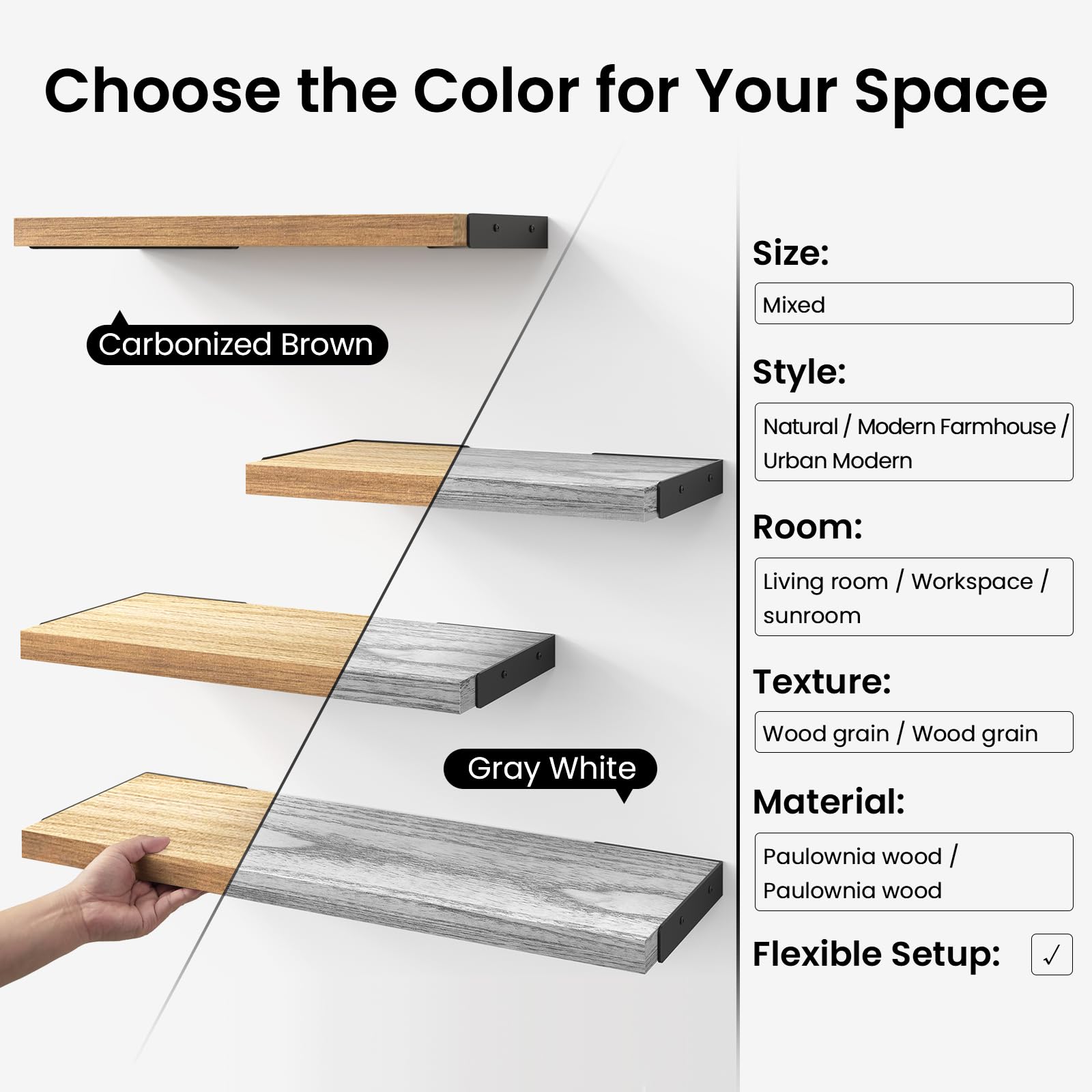【Three different size Floating Shelves for All】Simply designed with solid paulownia wood and industrial matte metal brackets that fit both styles of rustic and contemporary. Because of the magic of "floating", these floating shelves are suitable for almost any room of the home – from displaying living room decorations to storing children's room items, or making simple bookshelves in the study.