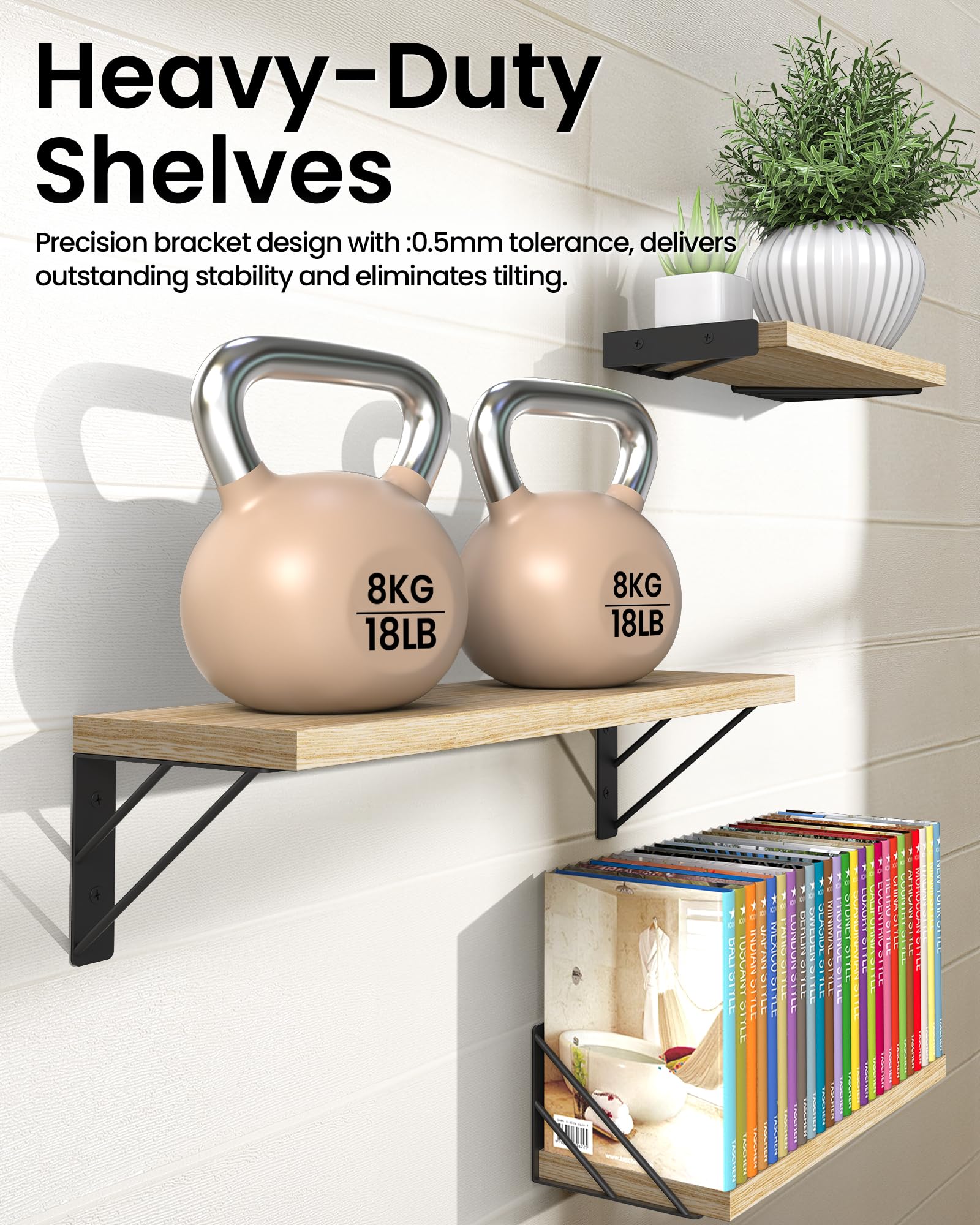 【Simple Combinations, More Creativity】 Added triangle design elements to provide two different display methods. Install these shelves with the board on top of the brackets or below to provide more choices for your layout. Choose your favorite look and create your own personal style. Natural Wood boards can be DIY stained.
