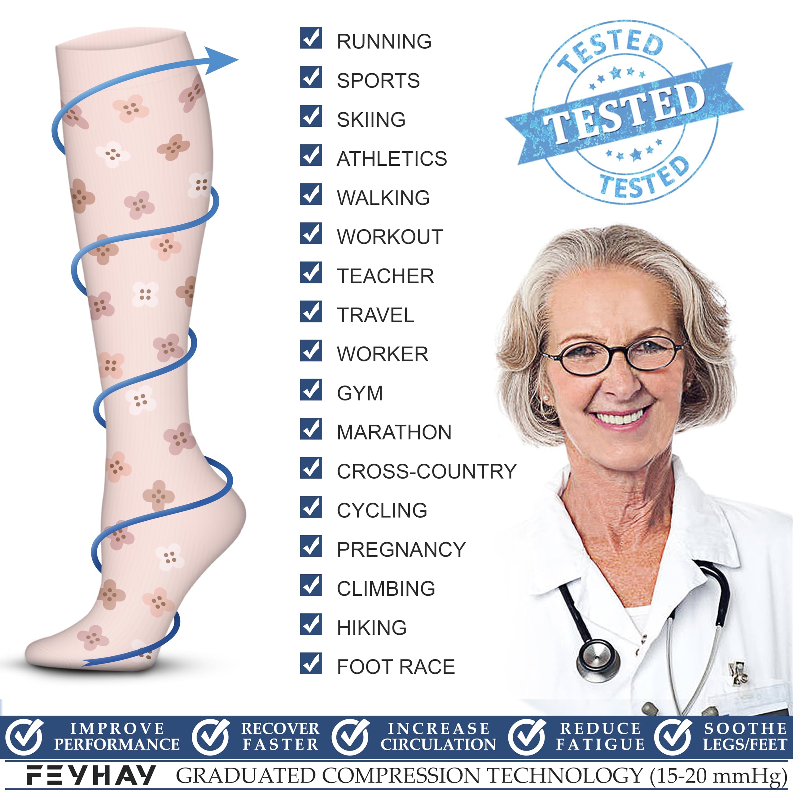 COPPER FIBERS - Copper is a great conductor of electricity, we extended its natural property to rejuvenate blood circulation in your legs through copper fibers capable reviving blood circulation along with providing a 15-20 mmHg compression. Socks are designed according to the structure of the legs and soles of the feet, and have a good effect of relieving fatigue of legs. It offers the most perfect settlement scheme for those who sit for long period during travel or at work.