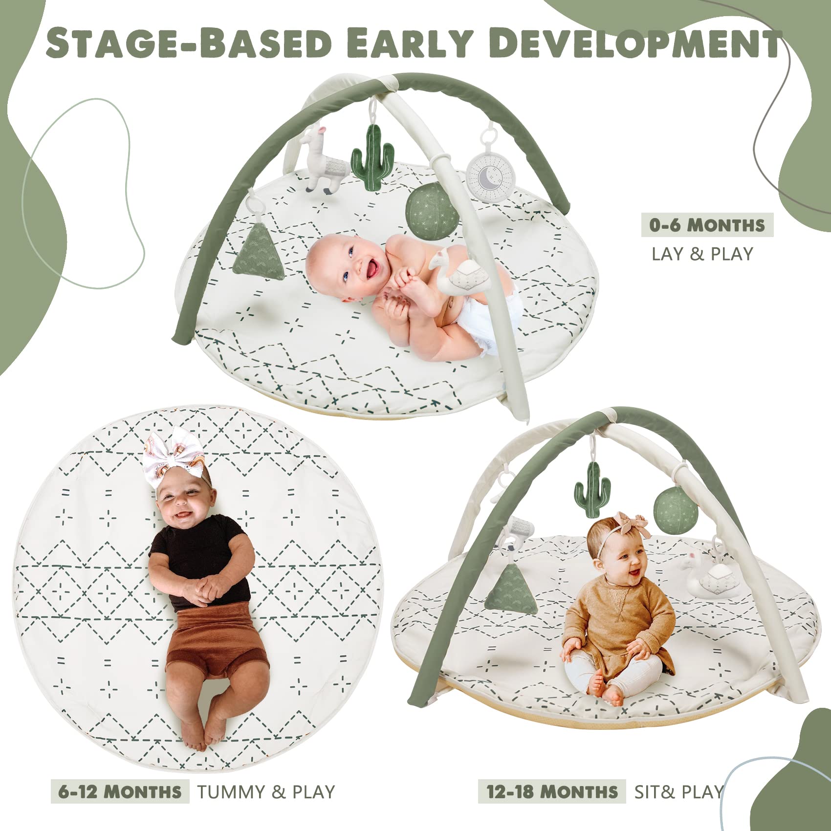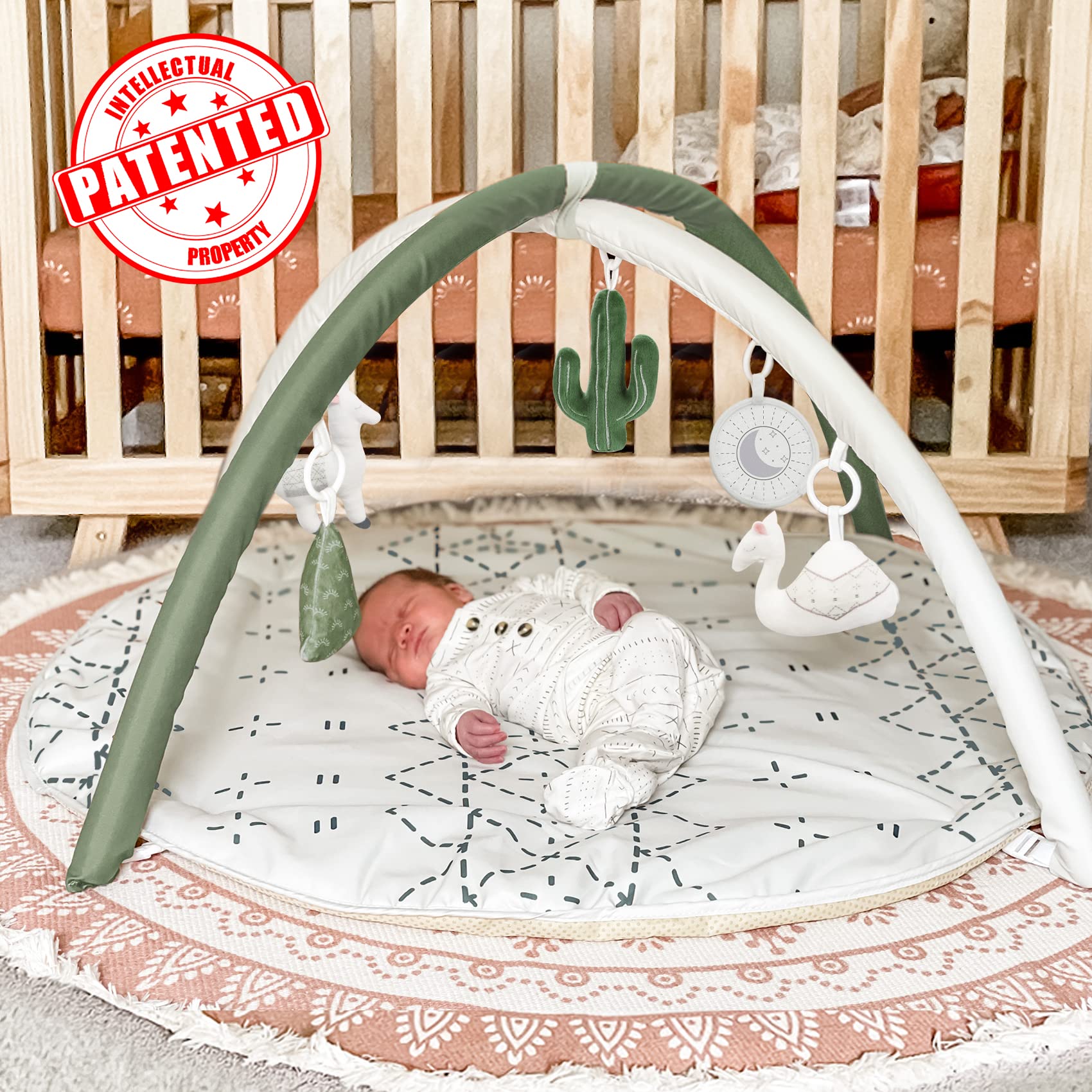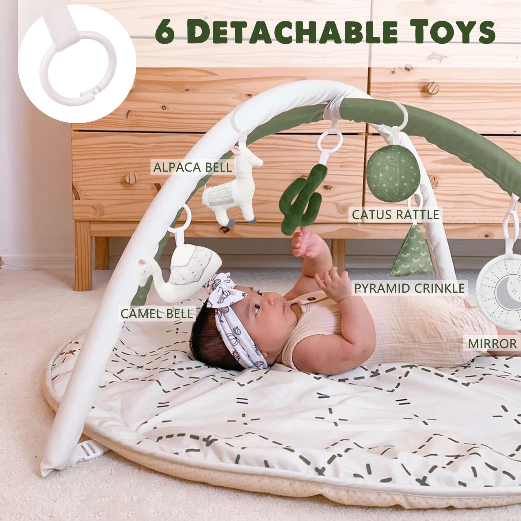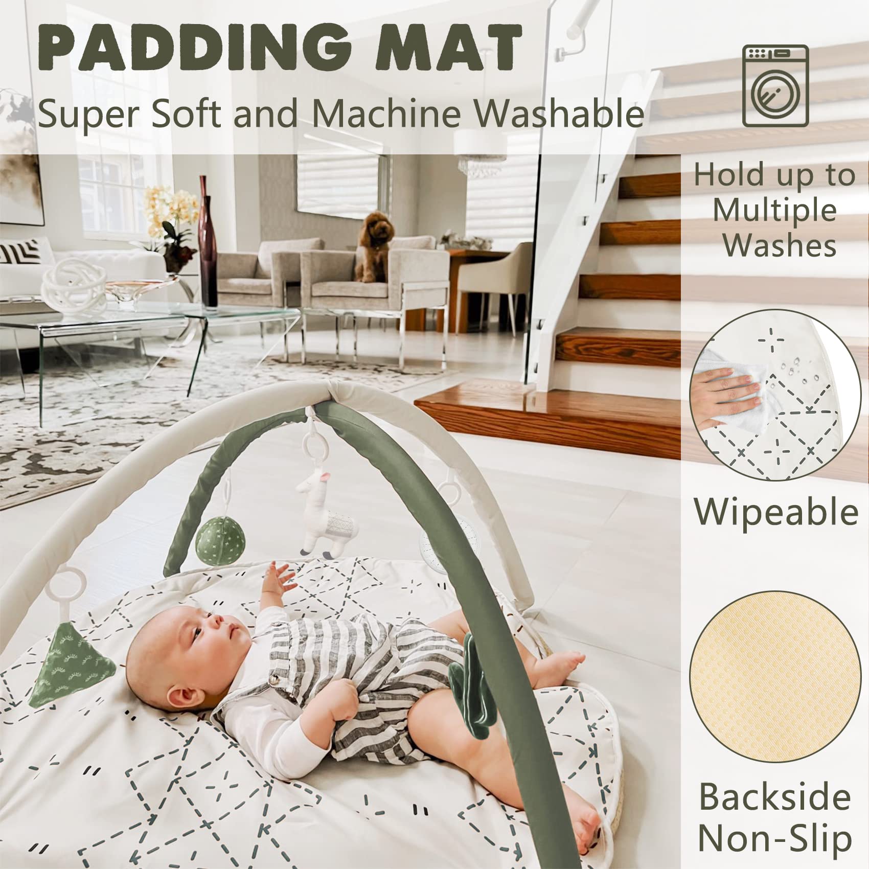 MACHINE-WASHABLE & NON-SLIP: Crafted from polyester cotton, this baby gym is PVC-free & phthalate-free, and the back is non-slip, preventing sliding on floors. The play mat is machine washable and wipeable, making it easy to clean after playtime.