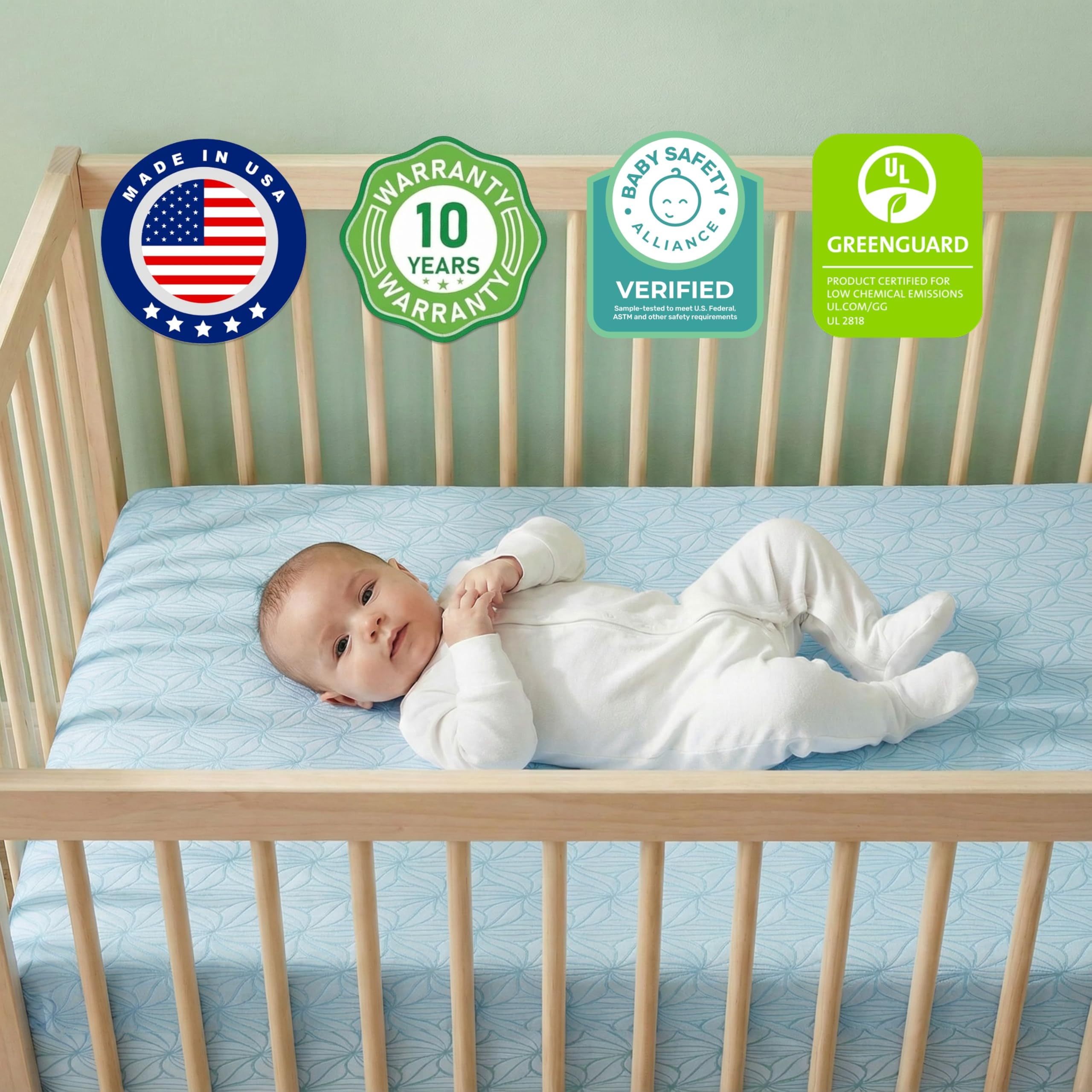 Certified Safe for Your Baby – GREENGUARD Gold and Baby Safety Alliance Certified, rigorously tested for over 10,000 chemicals and VOCs to ensure cleaner indoor air and a healthier sleeping environment for your little one.