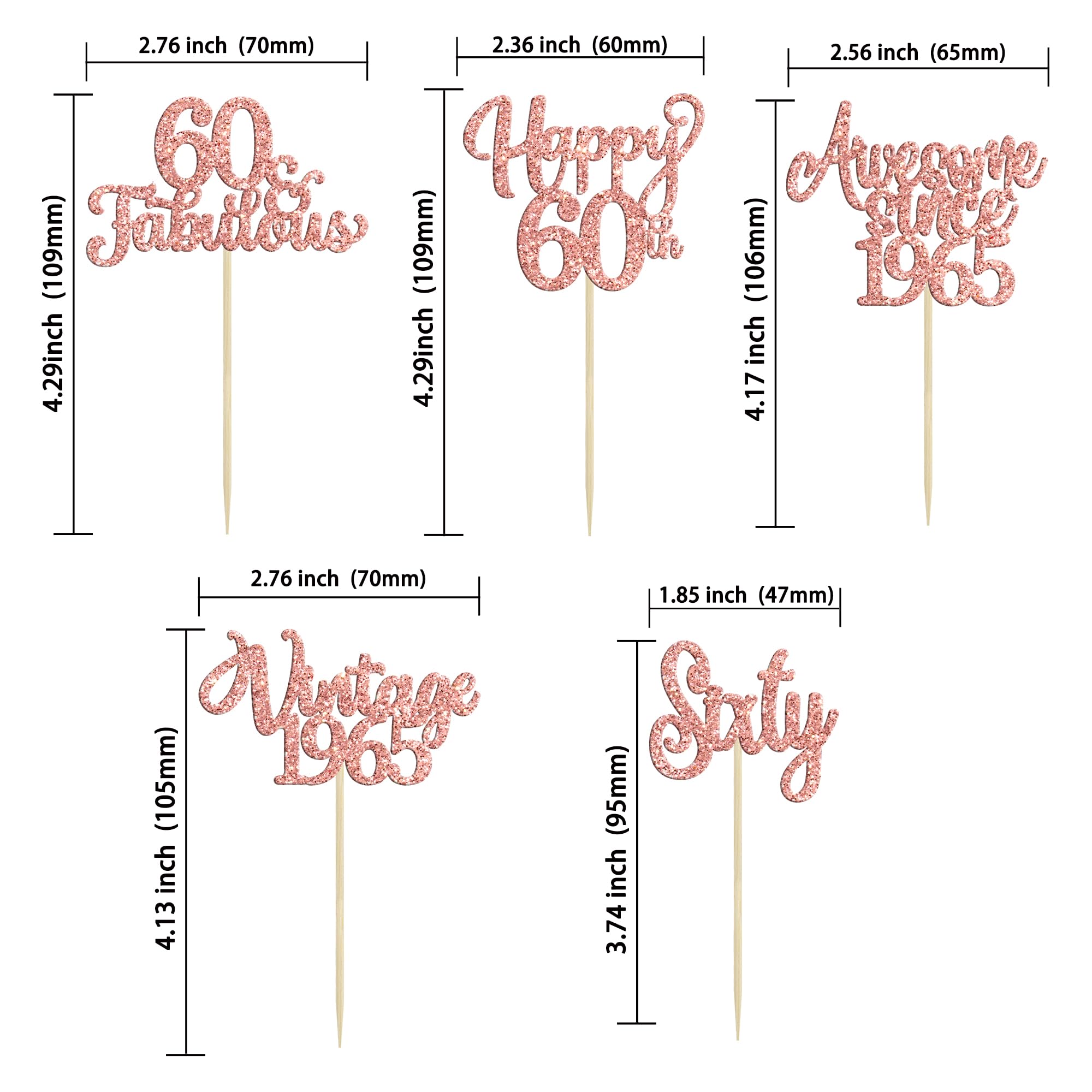 Material and Usage - Usage: They are perfect for vintage 1965 theme party, 60th birthday theme party, 60th wedding anniversary theme party,cheers to 60 years theme party cupcake decorations, which make the cupcake look tastier and more attractive. - Material: Made of paper material, solid, not easy to deform and fade and can reuse for many times; Please don't put them into oven for they are only decorative and not edible. Package and Size - Package: Pack of 30Pcs. Size: W 2.4"*H 3.9"/W 6*H 10cm(Include Stick). Comes with assembled, so you can insert into your cake directly, which make your cake more interesting. - If you want to return the item, please kindly contact us first, then we will deal with it until you are satisfied. Note 1.The cupcake topper picks have pointed end, please keep away from children when using. 2. These cupcake toppers are for decoration purposes only, not edible and do not place in oven or use for baking. 3. Due to the light and screen difference, the item's color may be slightly different from the pictures.