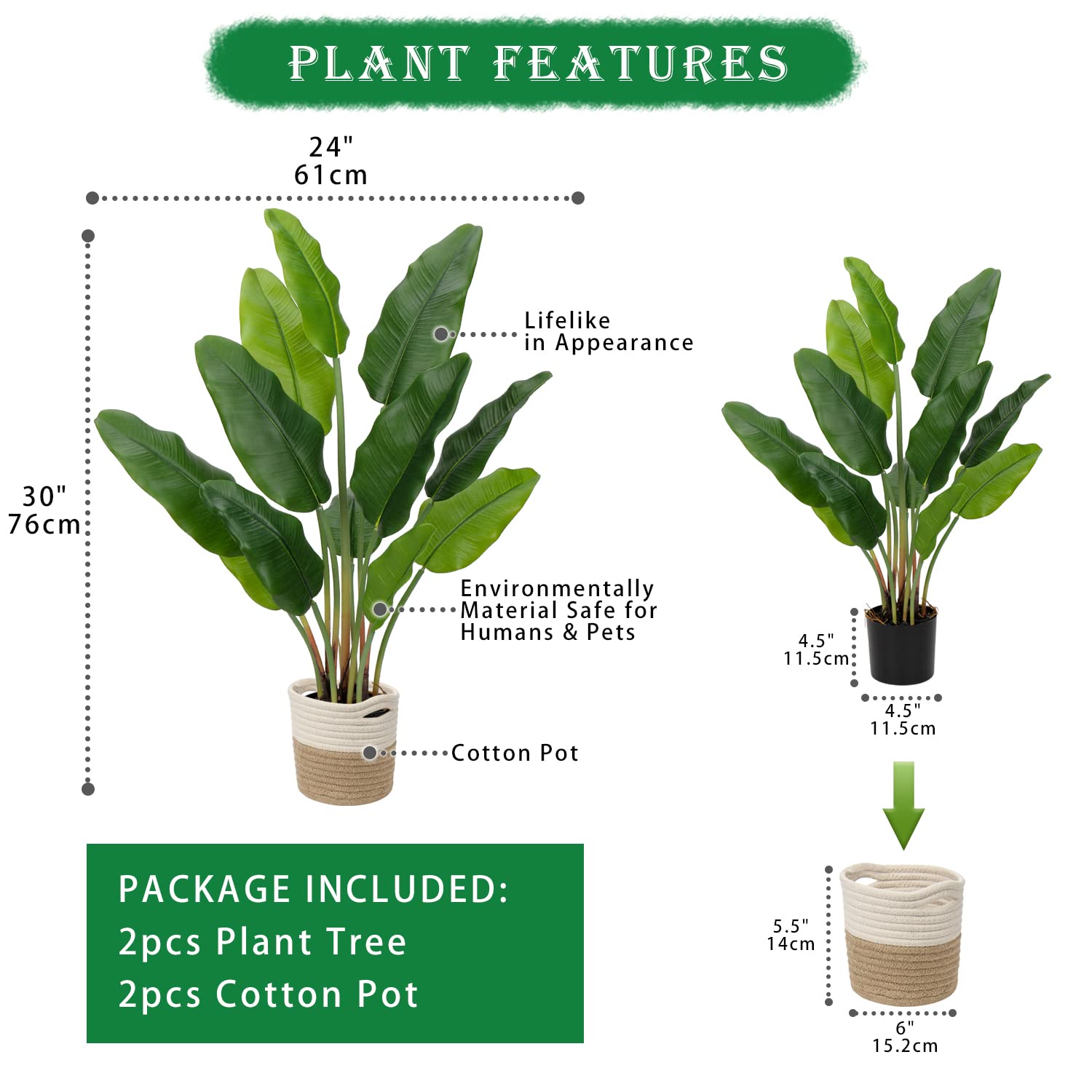 Packaging and Size: The package comes in 2pcs Artificial Bird of Paradise Tree, 2pcs cotton pot; Each large artificial plant tree measures about 30”x24“.