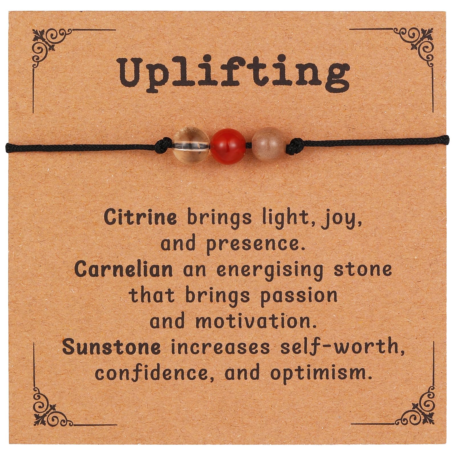UPLIFTING BRACELET: This uplifting bracelet contains 3 natural healing stones: Citrine brings light, joy, and presence. Carnelian an energising stone that brings passion and motivation. Sunstone increasesself-worth, confidence, and optimism.