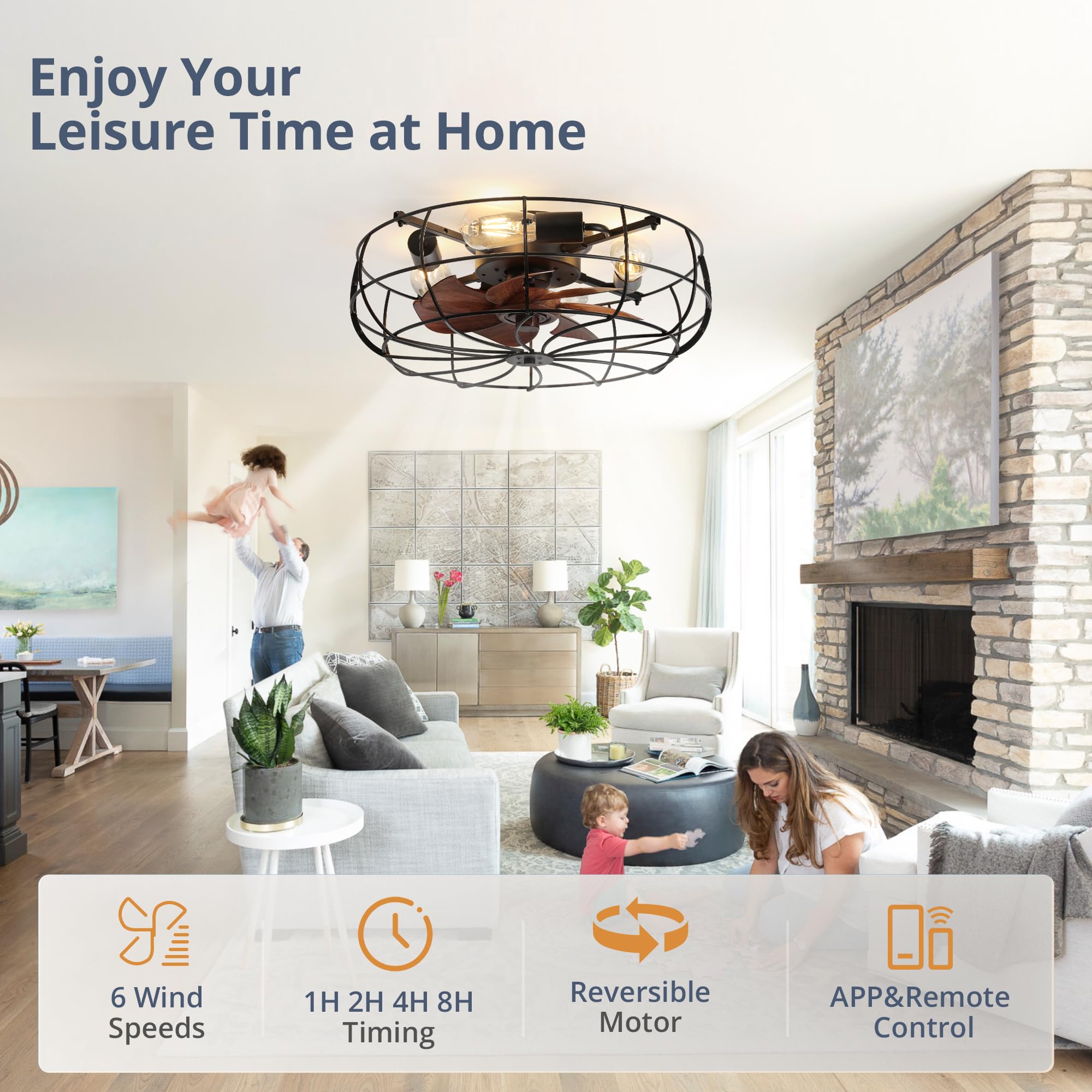 App&Remote Dual Control: Operate your fan and light using the included remote or the phone app. Effortlessly adjust 6 wind speeds, set a 1/2/4/8H timer, and switch the reversible function—all with no-beep operation. The fan and light can be independently controlled for maximum flexibility