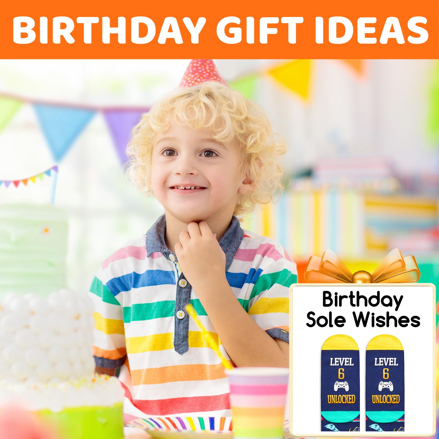 GIFTS FOR CHILDREN: These festive socks feature birthday gifts, balloons and game machines on top, with a fun secret message on the bottom: "LEVEL 6 UNLOCKED." Perfect for holiday gifts like Birthdays, Christmas or White Elephant exchanges.
