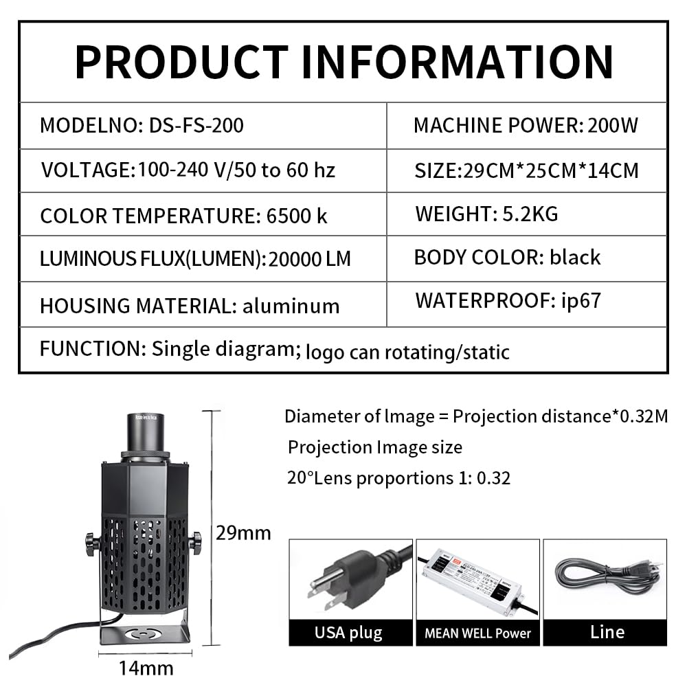 model :DS-FS-200 Power :200W Luminous Lux:20000LM CRI: Ra>80 Color temperature:7000K optional Shell material: High quality aluminum alloy Cooling: Natural heat dissipation + fan heat dissipation Light source :Superbright LED chip Power supply type: plug-in power supply Input voltage: AC :110-240V Output voltage: DC :21V 9A Ambient Temp. Range: -22°F to 122°F (-30°C to 50°C) Lens: Manual focus Optical Lens: 20° (1:0.32) Gobo size:52/26mm Function: Single Logo Projection distance: 15-30m (in the dark) Weight: 5.0KG Product size :29*25*14 cm Standard Compliance: CE,FCC,ROHS package size:40.5*26*18.5cm