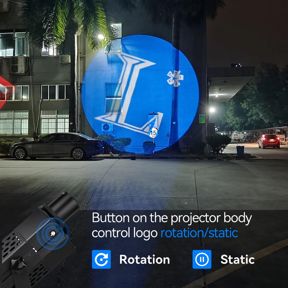 Button control:COLIFINE Gobo projector ,there with a button on the lamp body that can control logo images static or rotating ,Easy to control the status of logo pattern