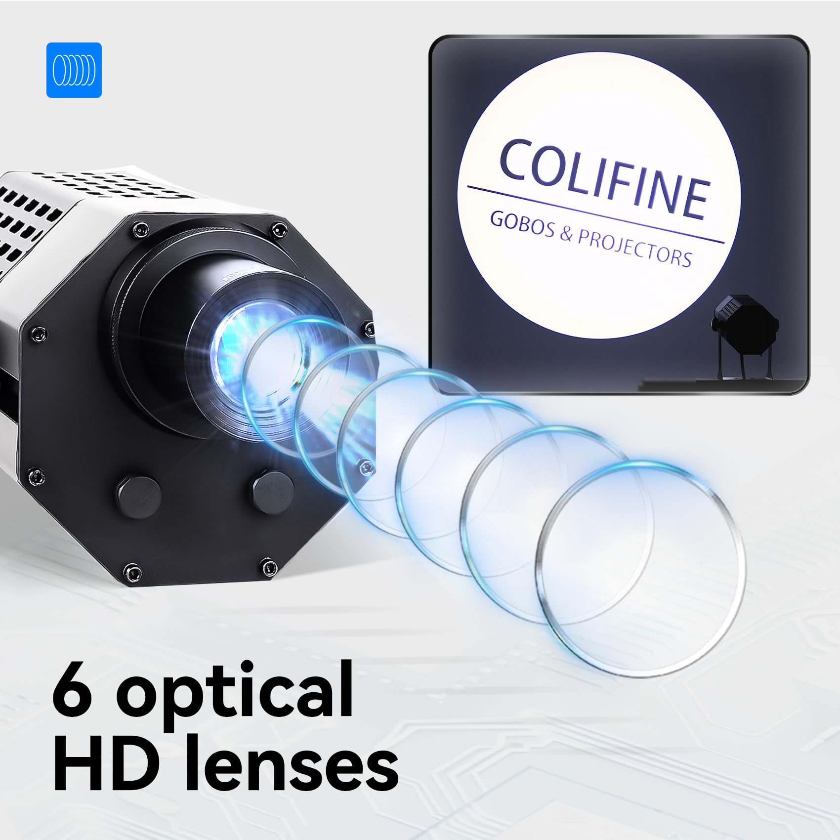 Super Bright: COLIFINE logo projector Equipped with 200W Superbright LED chip with strong power supply to provide a bright beam to promote your brand, ideal for any application, suitable for large advertising, corporate events and weddings.
