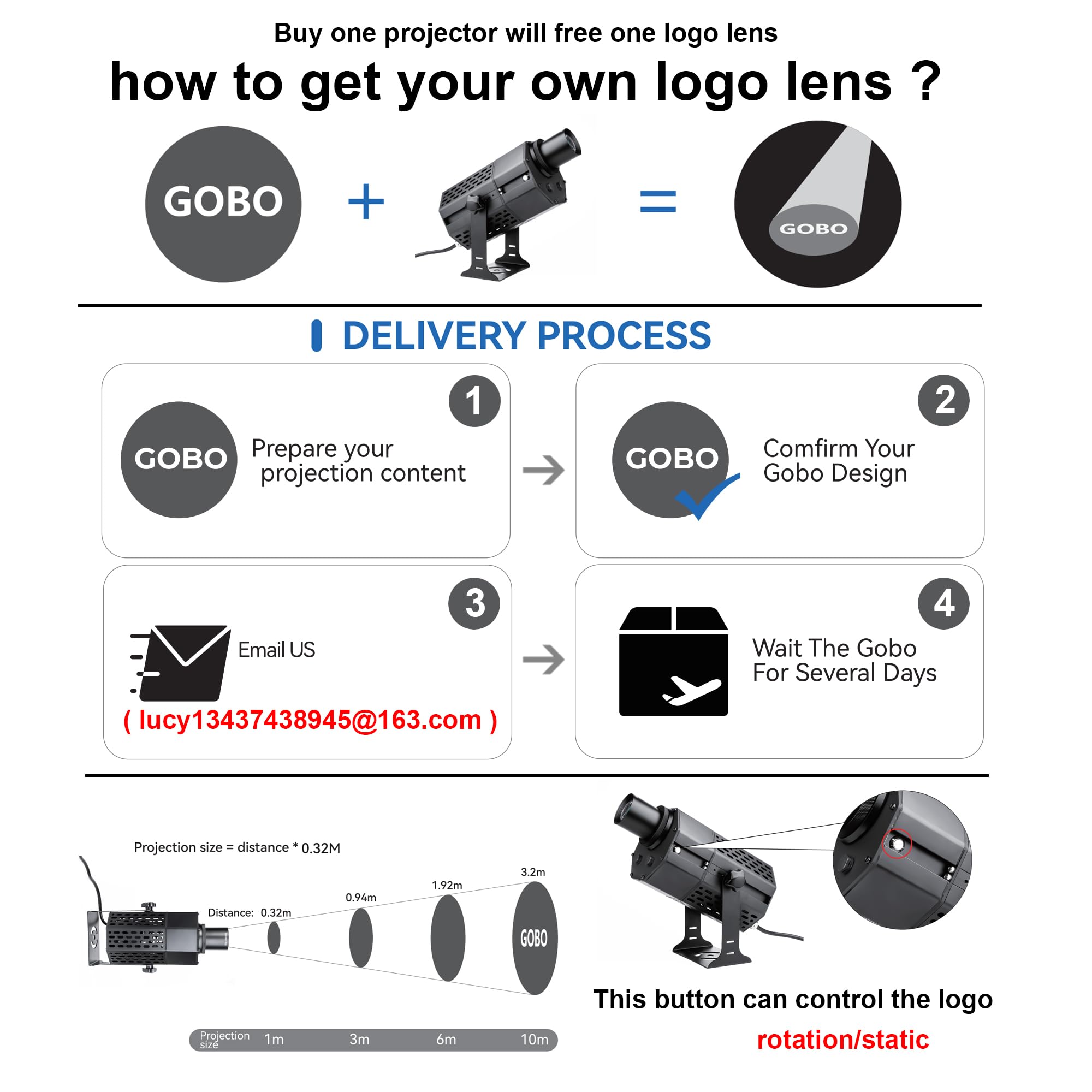[How to get GOBOS]: please send your logo picture/file to ([email protected] ) by email. We will customize the LOGO lens and send it to you with you gobo projector. we will install the logo lens well and you can use it directly. Please send hd JPG, AI,CDR,PSD,PNG,PDF...