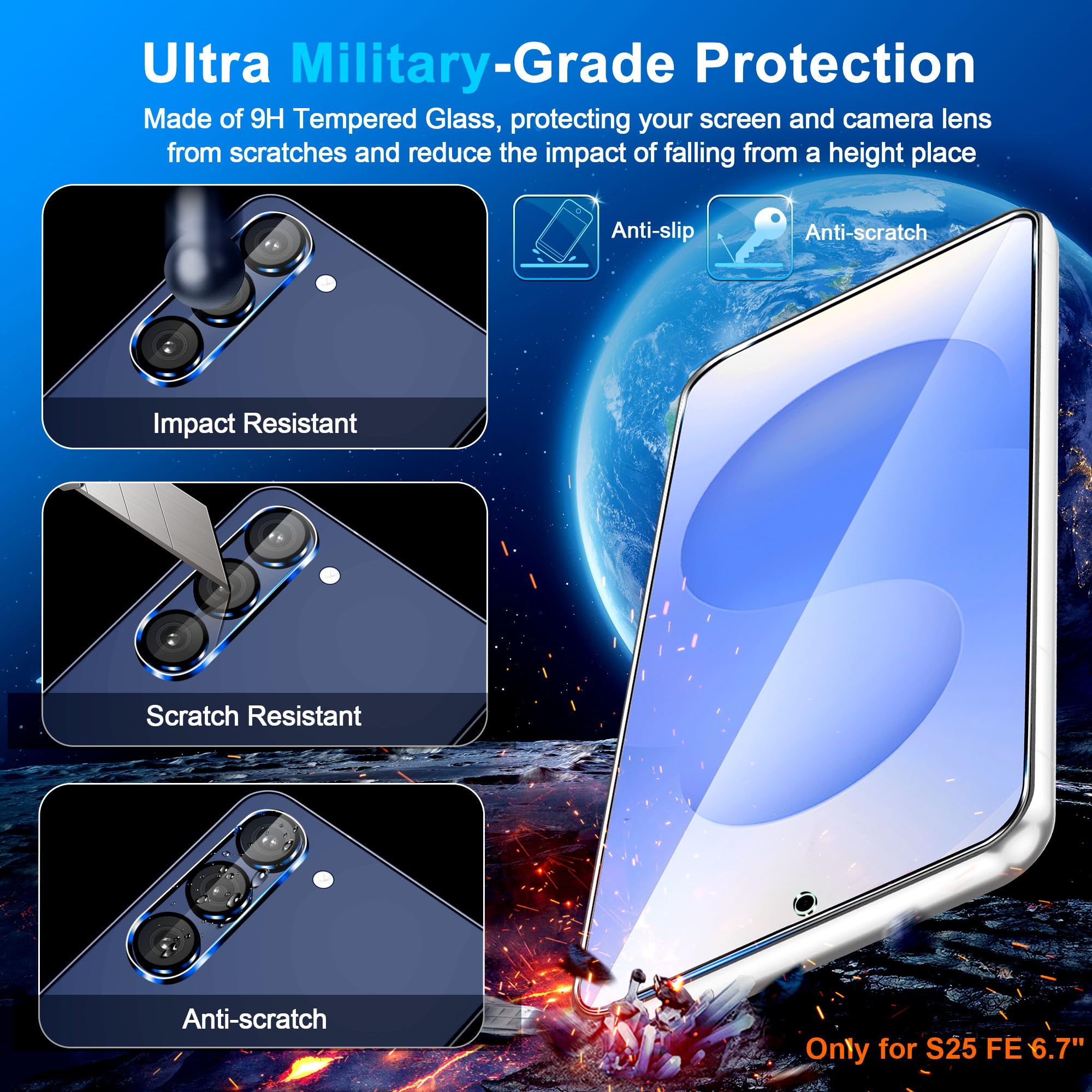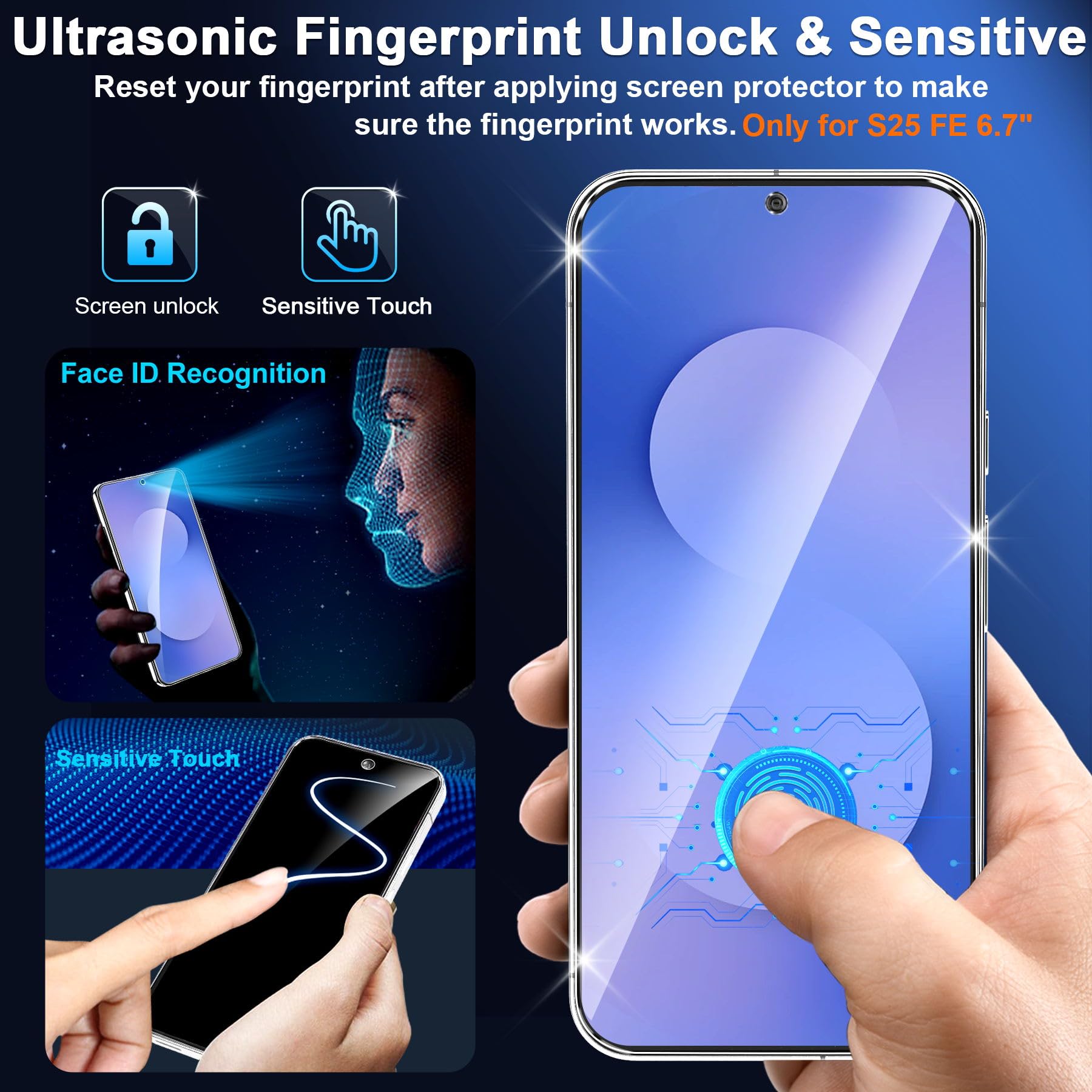 6 Pack: You will get 3 pack screen protectors and 3 pack camera lens protectors are both made of High-quality Tempered Glass for Samsung Galaxy S25 FE(6.7"). Unlock with ease using either Fingerprint or Face Recognition technology. Enjoy a natural, "True Touch" experience thanks to superior sensitivity