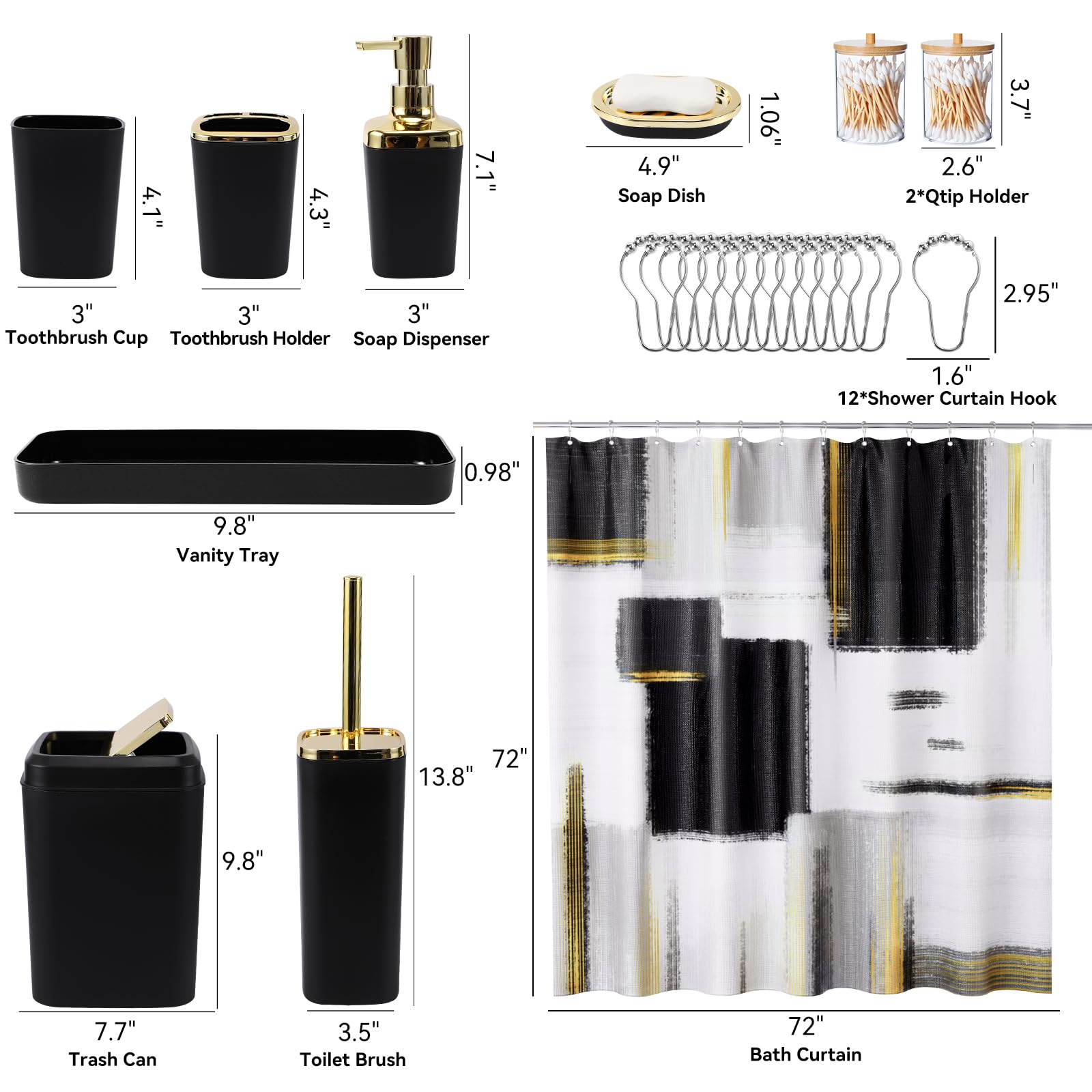 ใ๐๐๐ญ๐ก๐ซ๐จ๐จ๐ฆ ๐๐๐ญ๐ฌ ๐ฐ๐ข๐ญ๐ก ๐๐ก๐จ๐ฐ๐๐ซ ๐๐ฎ๐ซ๐ญ๐๐ข๐งใIncludes soap dispenser, toothbrush holder, tumbler, soap dish, bathroom trash can, toilet brush and holder set, bathroom tray, 2 qtip holders, 12 shower curtain hooks, and printed shower curtain set.