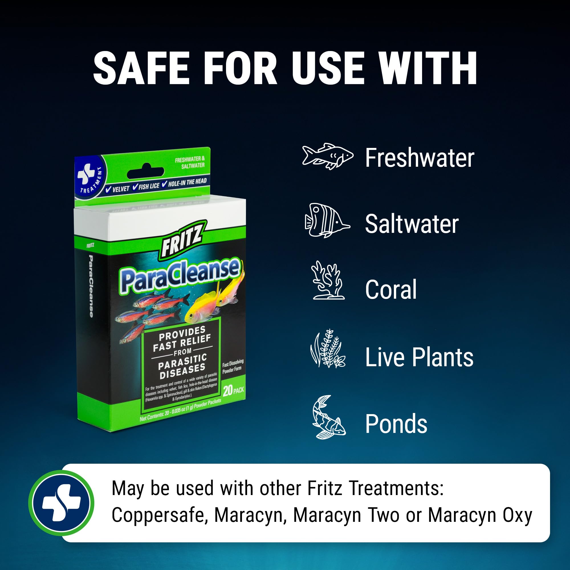 Safe for both freshwater and saltwater systems, this treatment does not, harm plants, invertebrates, or uninfected fish