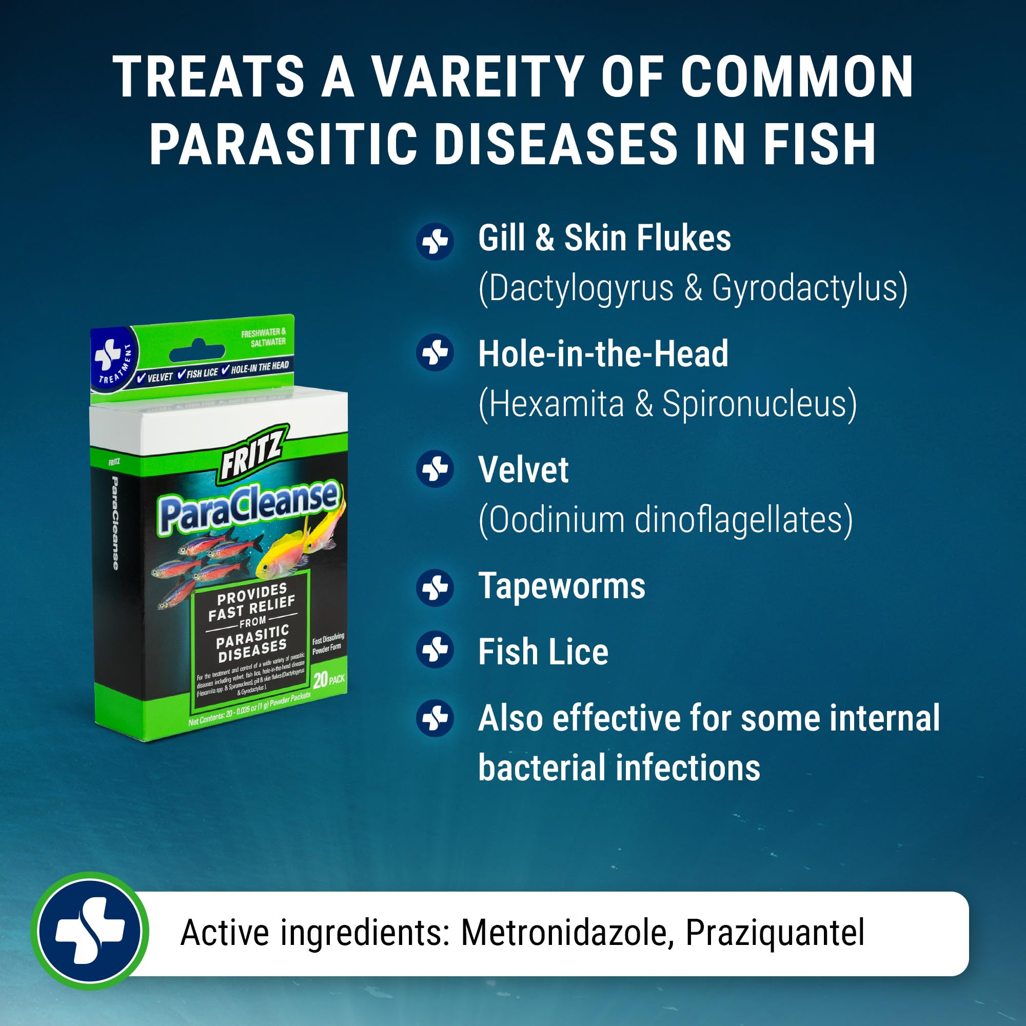 Dual Active Ingredients: Containing Metronidazole and Praziquantel, Fritz ParaCleanse is effective against a variety of common parasites in fish but also some internal bacterial infections