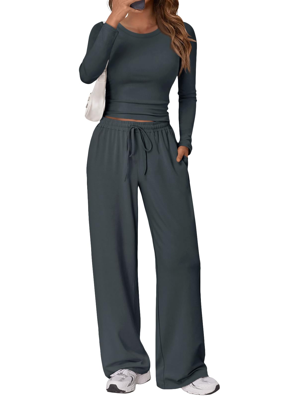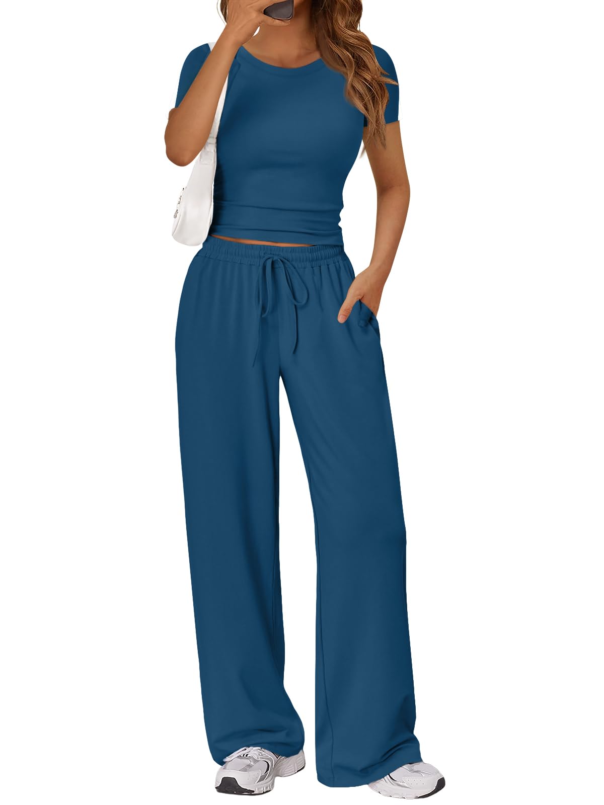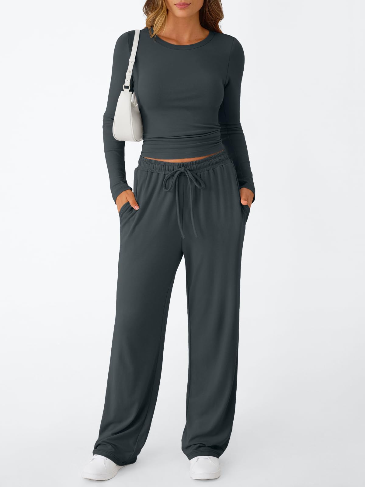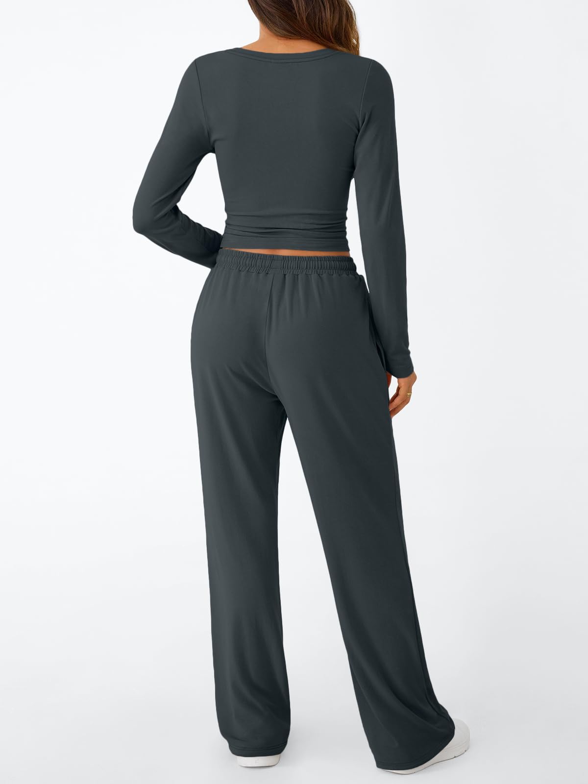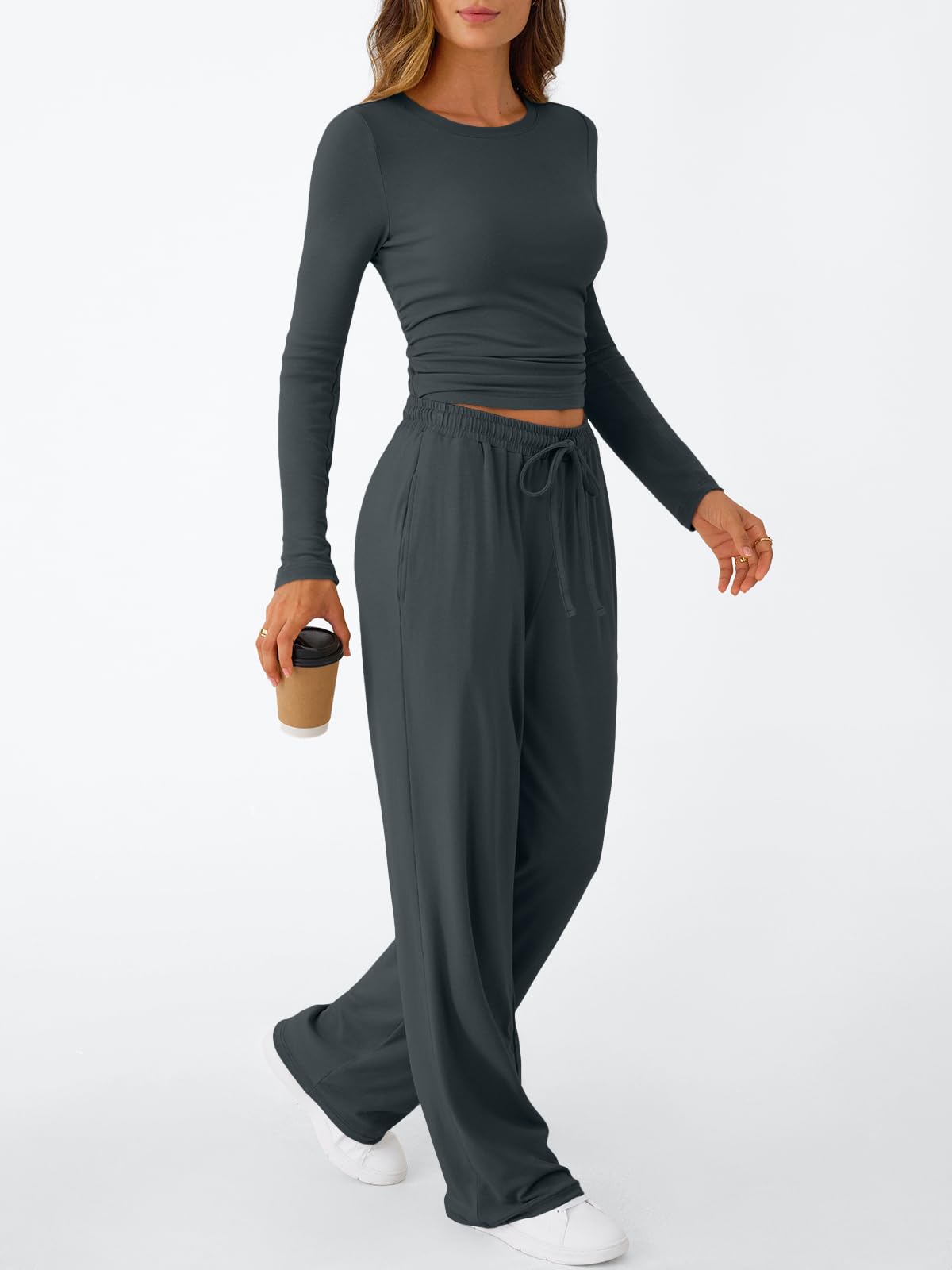 Confident & Practical Fit—Designed to celebrate your shape. The top features feminine side ruching and a slightly cropped length that pairs seamlessly with high-waist pants—elevating your silhouette without being overly revealing. The wide-leg pants complete the look with a chic adjustable drawstring waist and convenient side pockets, perfect for carrying your phone and essentials hands-free.