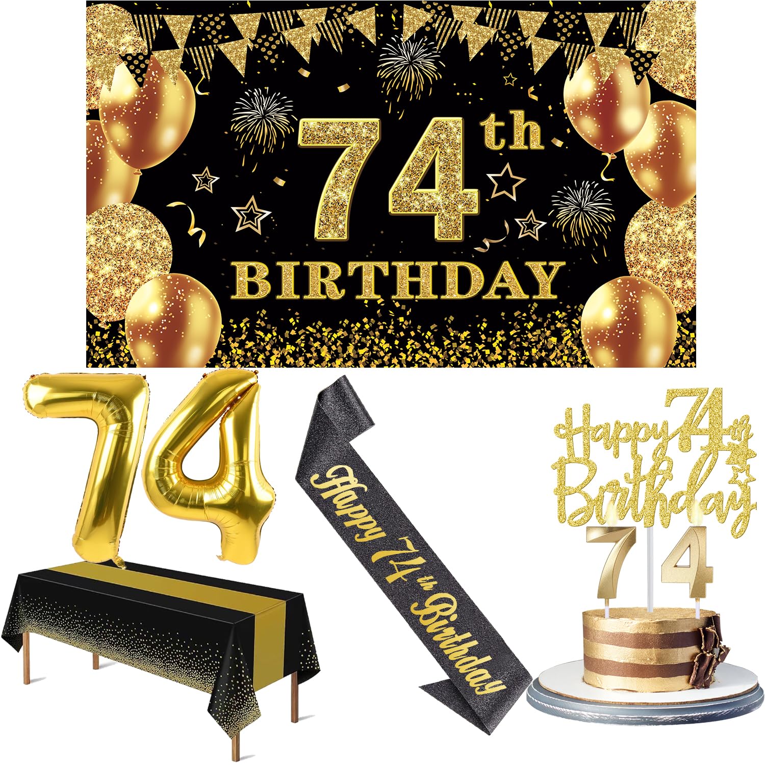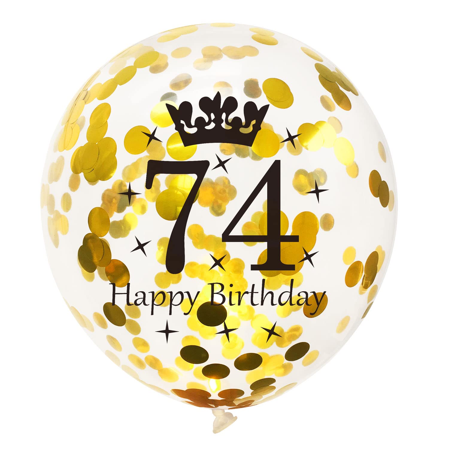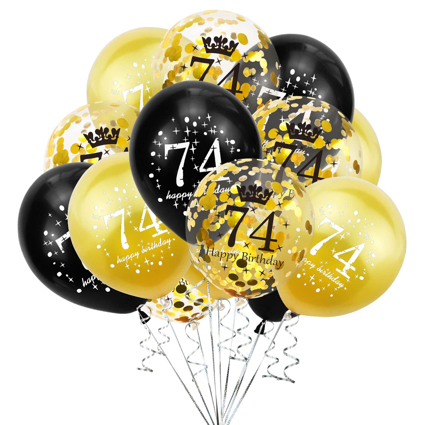 Package:5 pieces 12 inch black latex balloon printed with the words "74 Happy Birthday",5 pieces 12 inch gold latex balloon printed with the words"74 Happy Birthday",5 piece 12 inch gold confetti balloons printed with the words"74 Happy Birthday", very suitable for women men 74th birthday party decorations