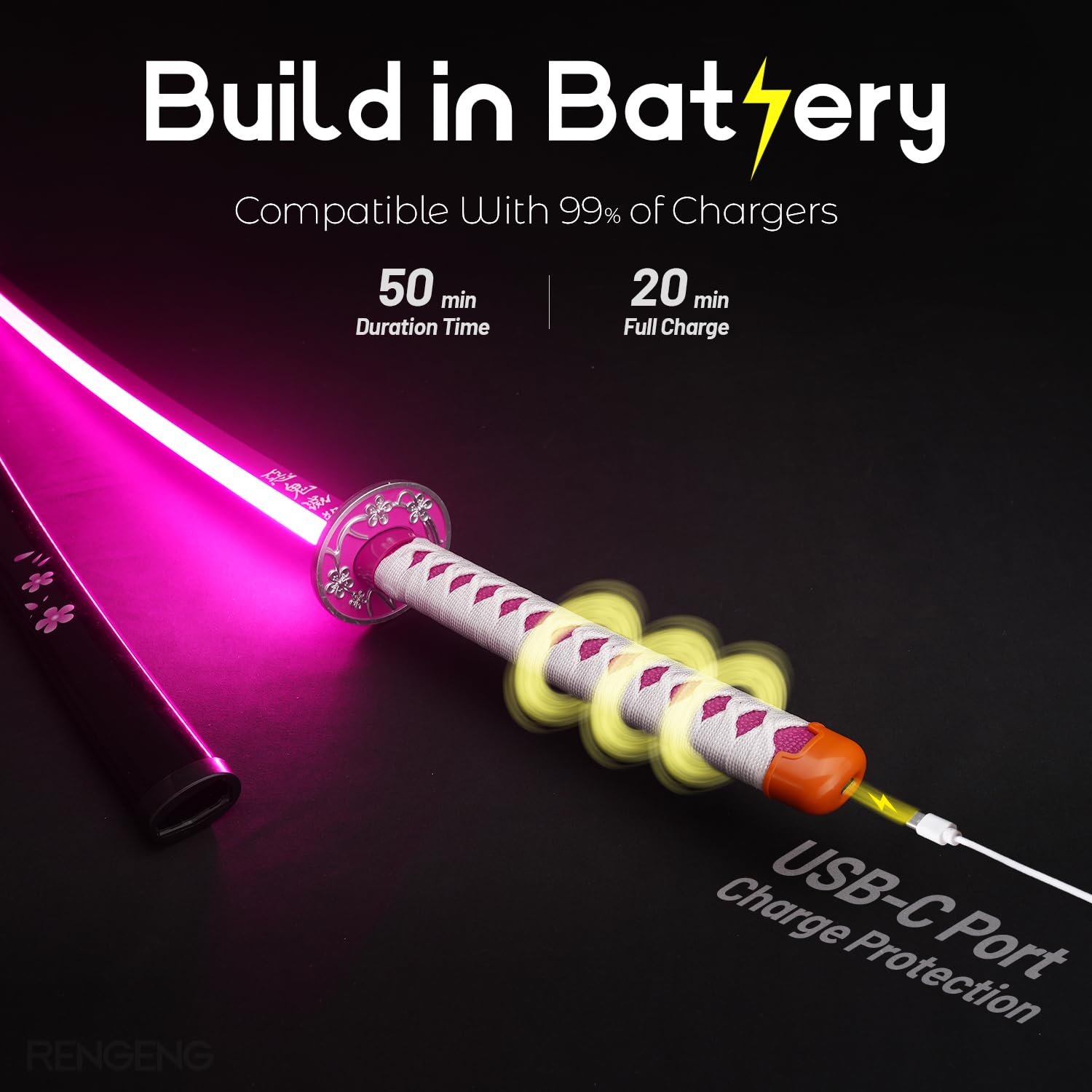 [Rechargeable] The light-up sword is powered by a rechargeable battery that lasts up to 50 minutes on a full charge, which takes about 20 minutes. Turning the light on or off is as simple as tapping the charging port on the handle twice