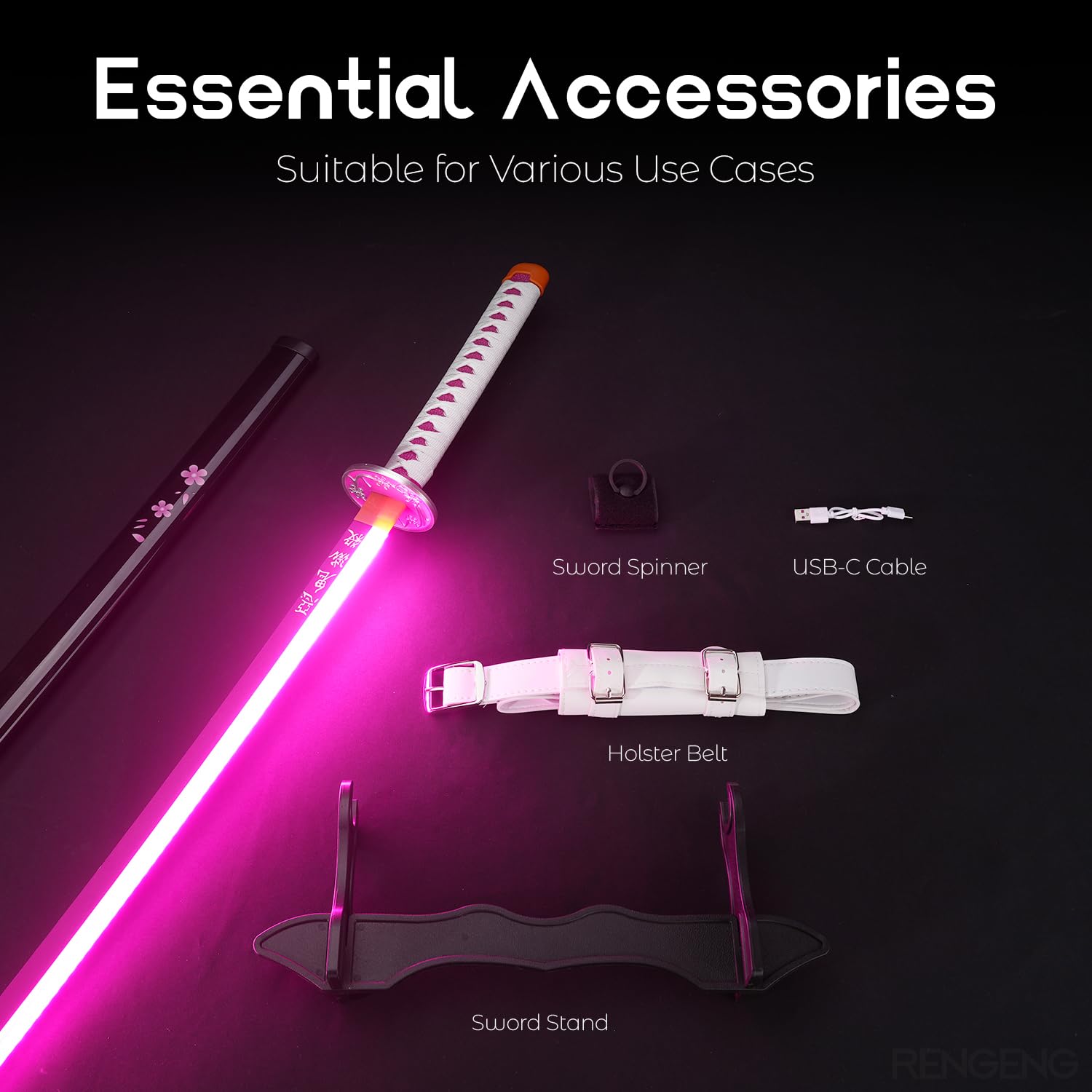 [Packaging Includes] This package contains: Light Up Sword x1, Holster Belt x1, Sword Stand x1, Sword Spinner x1, and USB-C Cable x1
