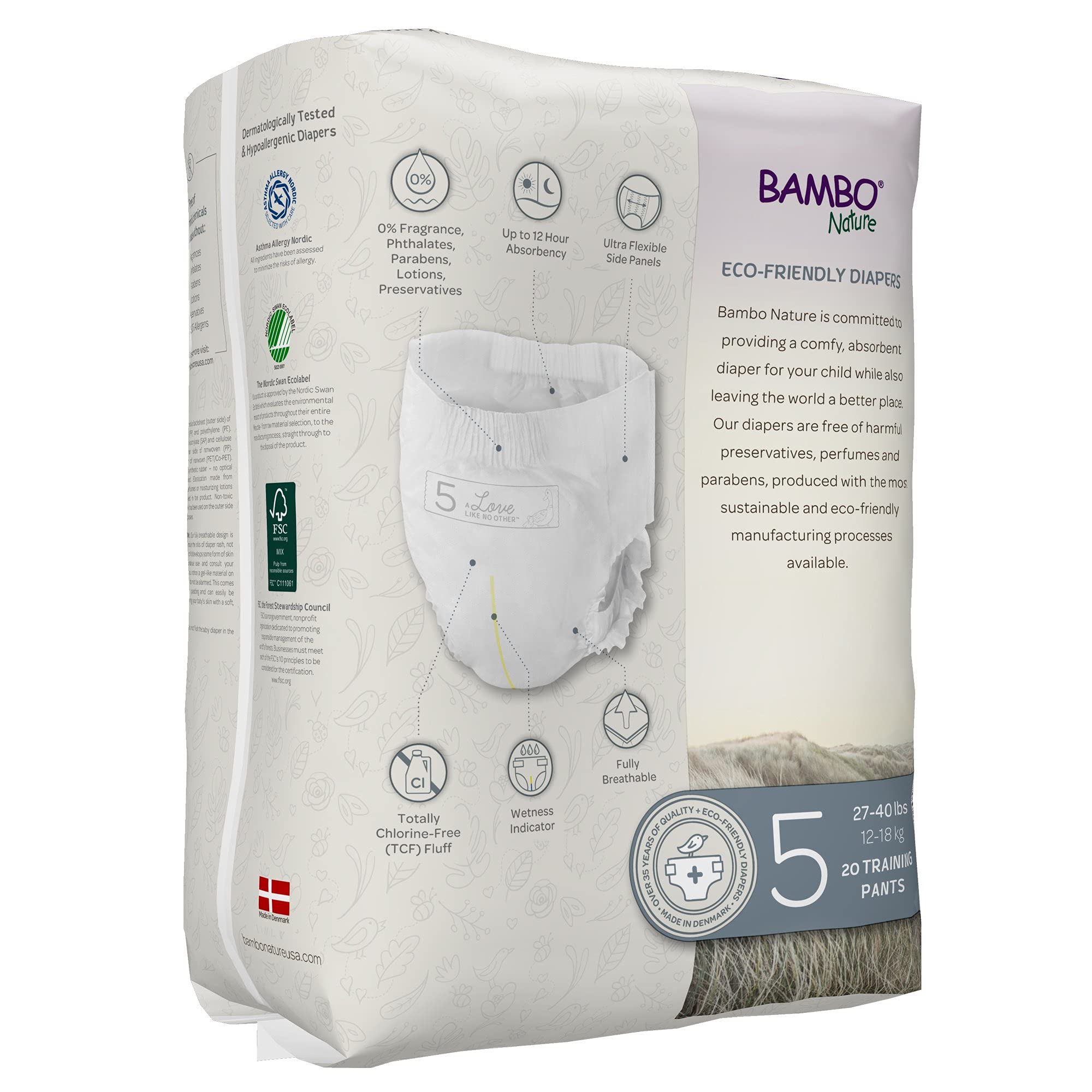 Bambo Natureβs disposable training pants are free of over 2500 harmful chemicals and known allergens. Now the fluff pulp is made TCF (totally chlorine-free). These training pants are designed to make potty training easy. Your toddler will feel like a big kid with our flexible, thin and easy to pull up and down design. Our training pants feature a three-layer design with a super absorbent core that can stand up to multiple wettingsβeven overnight. And just like our diapers, Bambo Nature Training Pants have a fully breathable backsheet to keep delicate skin dry. Now available in sizes 4-6!