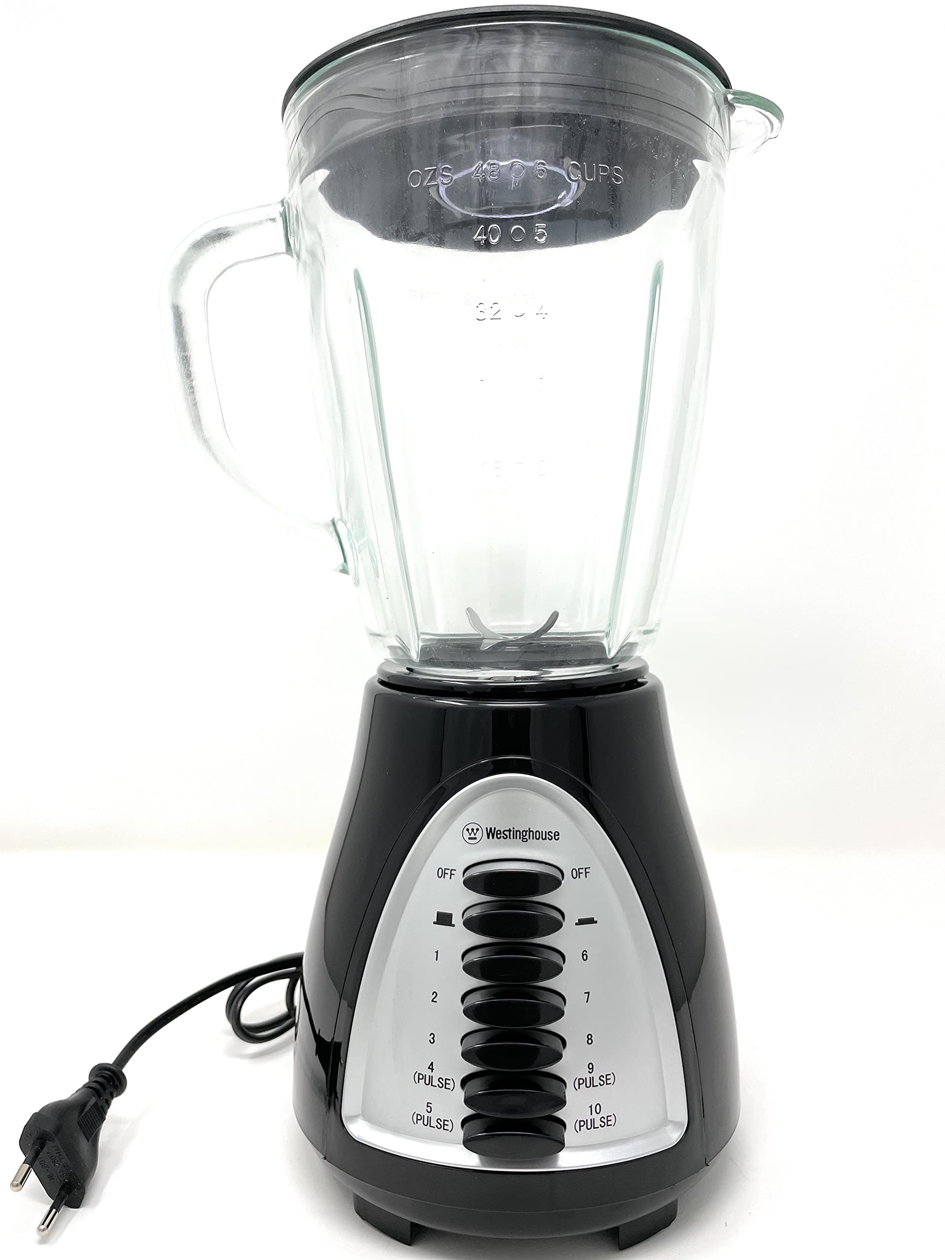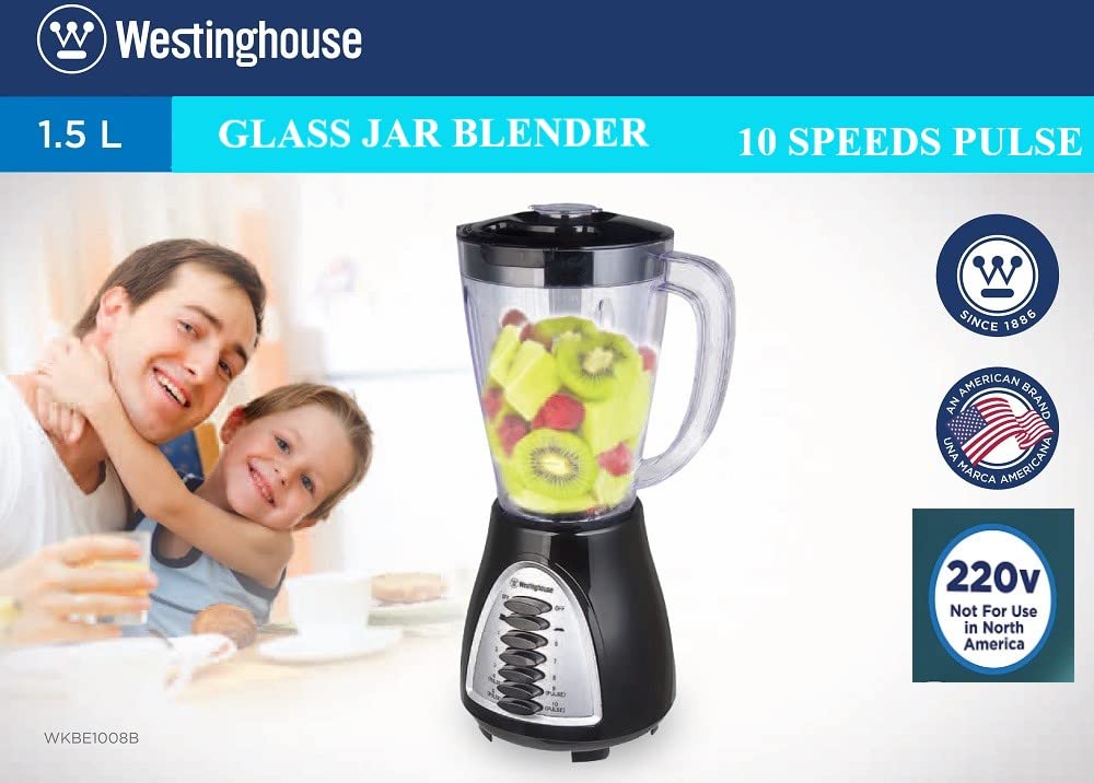 Westinghouse 220 Volts Blender With Glass Jar and 10 Speeds Pluse Function ( NOT FOR USE IN USA ) Modern Blender with Glass Jar and 400 Watts of Power, Large Capacity Jar of 1.5 Liters. Base with Stainless Steel Decoration. Always Versatile and Practical, with 10 Speeds and a PULSE Function, which allows you to make the Healthy Shakes you like. Easy to Clean, with its Detachable Stainless Steel Blade and Safe Non-Slip Base.