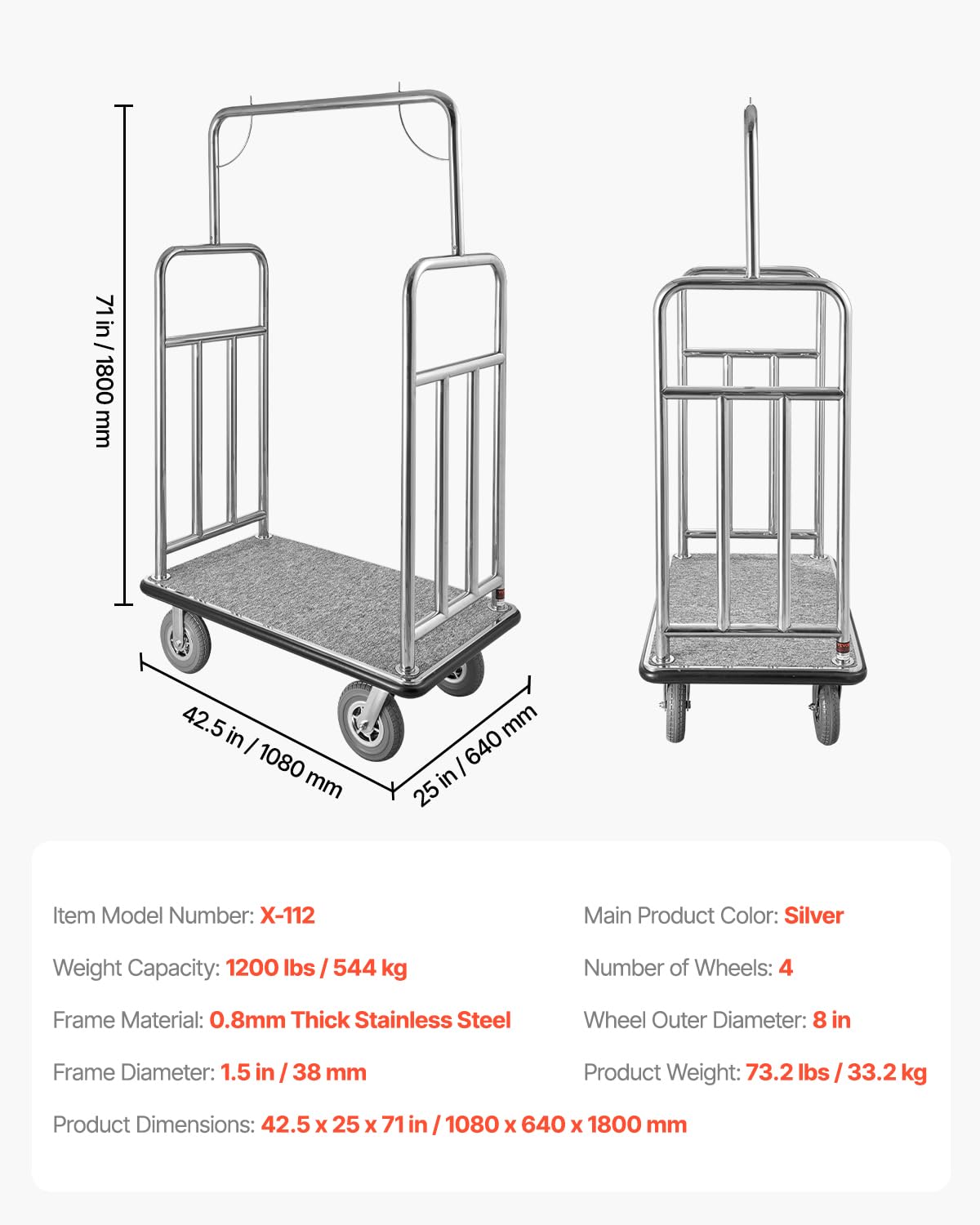 Heavy-Duty Capacity: This luggage cart is built for efficiency with a solid 1200lbs capacity! Measuring 42.5 x 25 x 71 inches, it's ideal for hotels and resorts to quickly transport luggage. With a spacious base and stainless steel hanging rods, handling multiple pieces of luggage is a breeze.