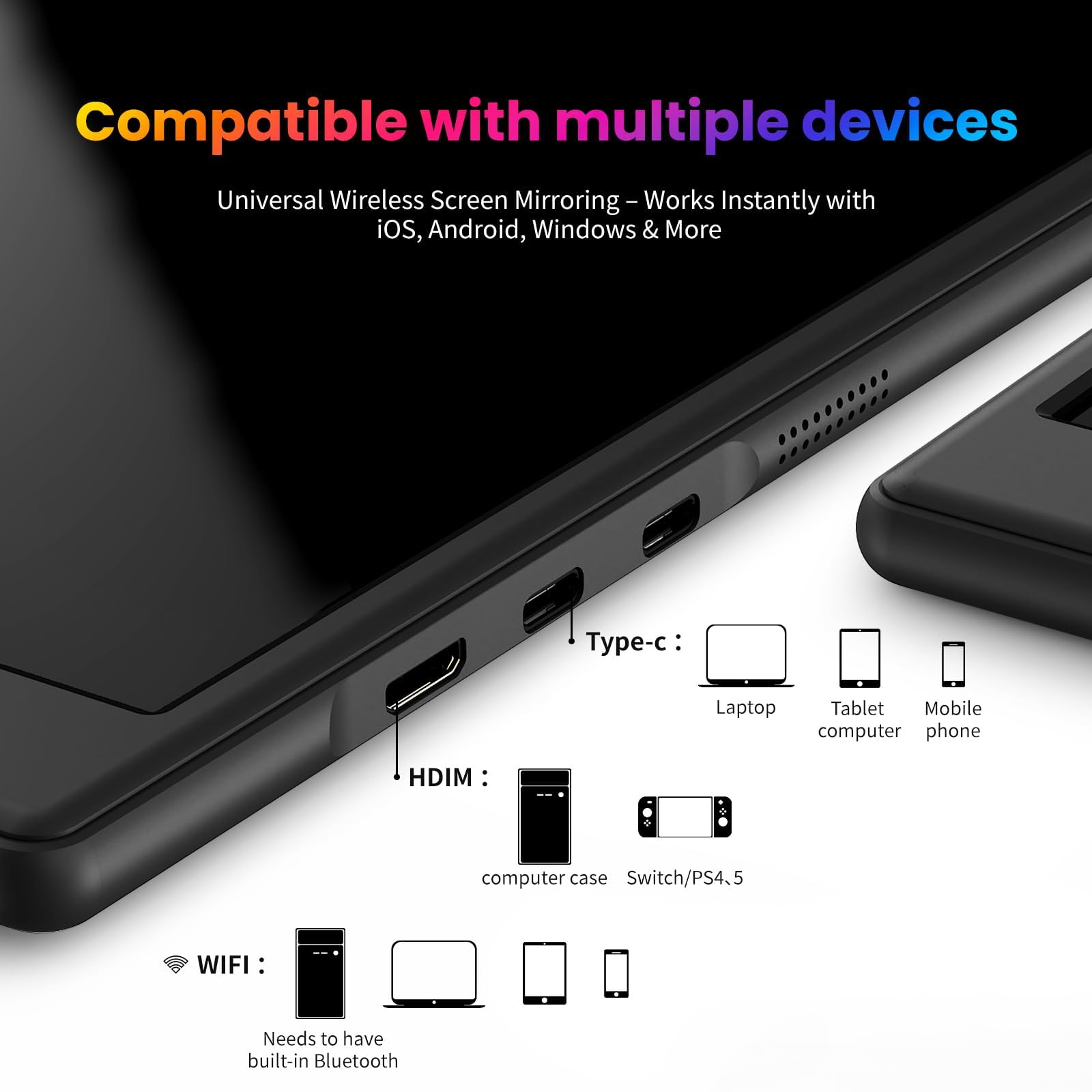 【Universal Compatibility】This wireless monitor seamlessly connects to phones, laptops, and gaming consoles like Xbox, Switch, and PS4/5 via both wireless screen projection and wired interfaces. Perfect for work, entertainment, or travel. *Note: Ensure your device supports Miracast/AirPlay for wireless connectivity.