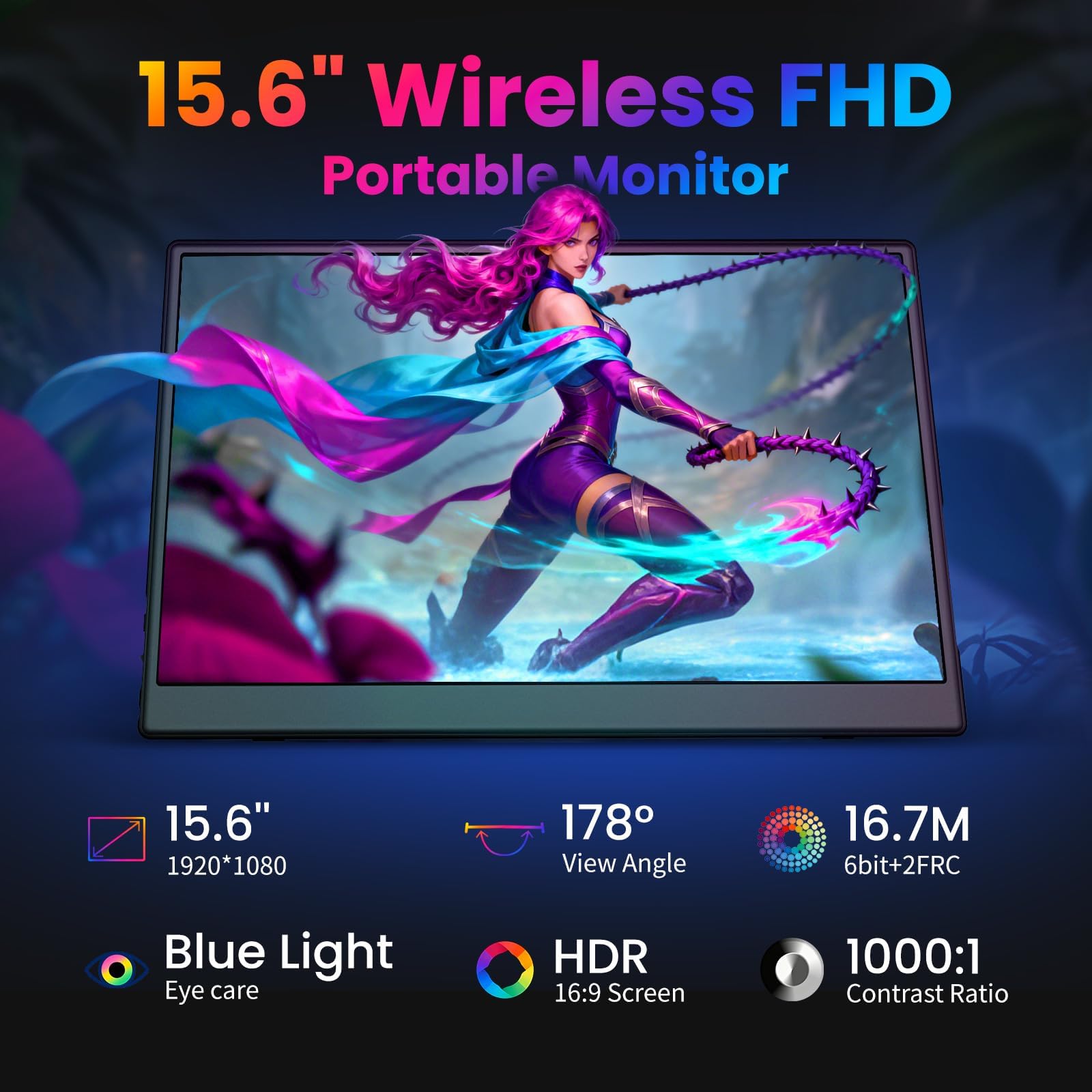 【Wireless Portable Dual-Mode Display】IPRODA 15.6-inch wireless portable monitor connects effortlessly to smartphones, Windows, and macOS devices—This product requires a power connection to operate. Stream content wirelessly or use HDMI/USB-C for a stable wired display. Note: This product does not include batteries.