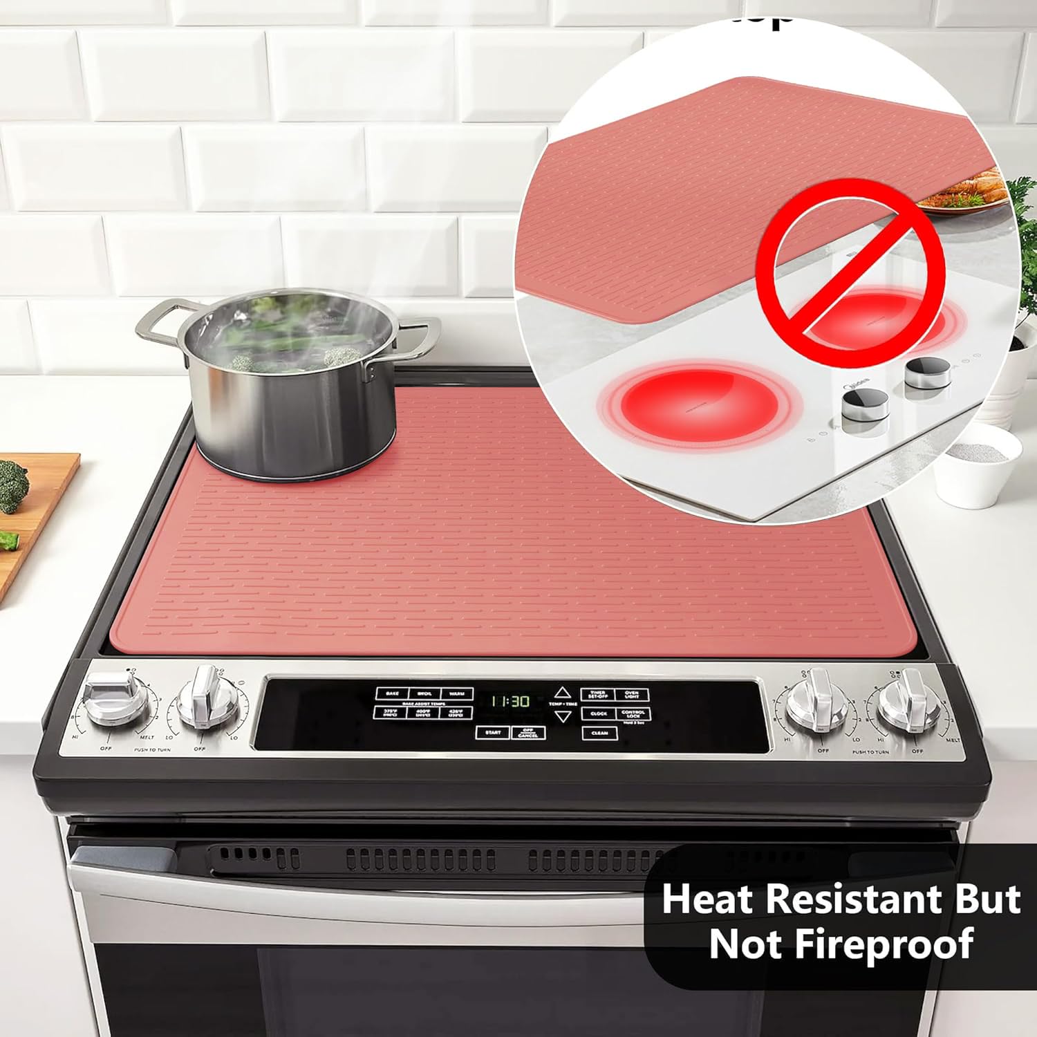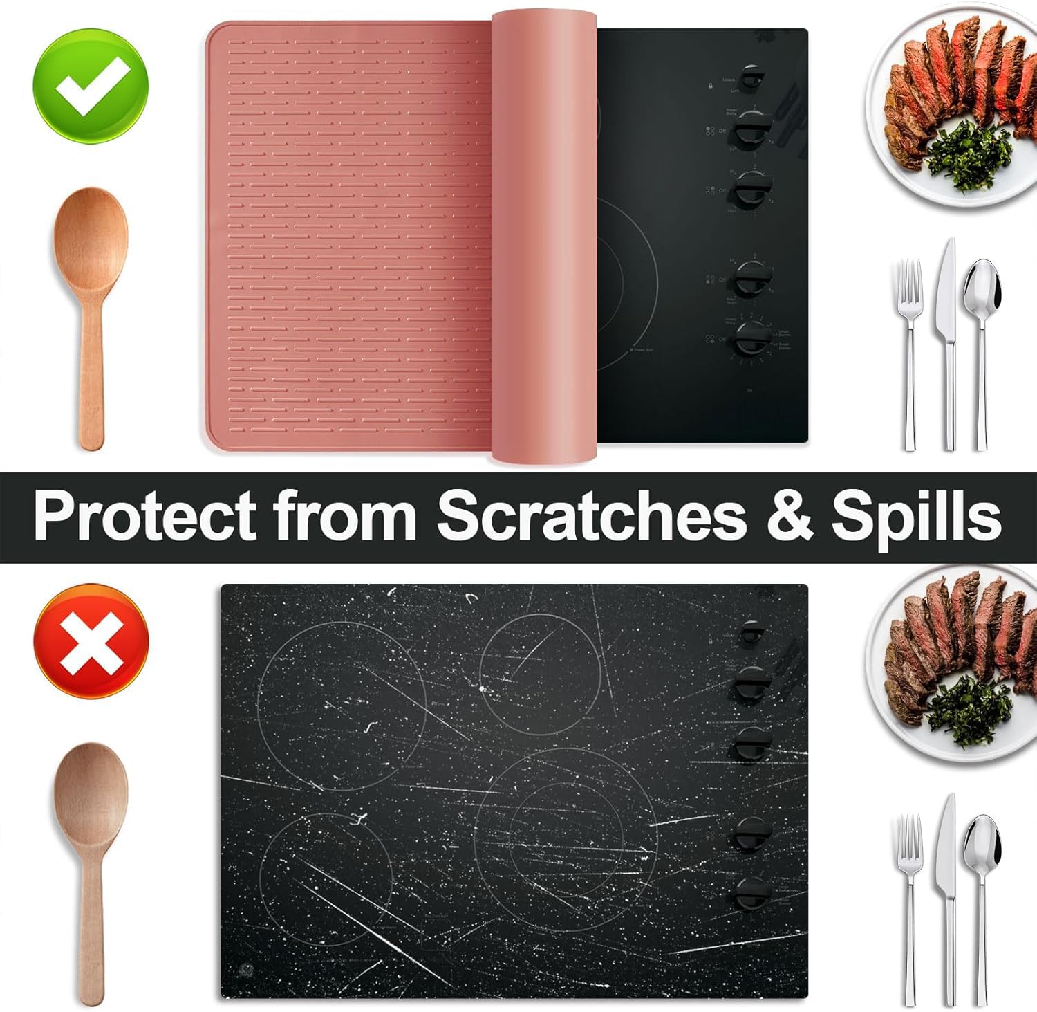 Anti Scalding Silicone Mat: Our glass-top stove cover doubles as a silicone trivet mat that can hold hot pots and pans. Heat resistant up to 400°F, its raised wide ridges separate the hot pot from the table and protect your kitchen surfaces from scalding. Attention!*Do NOT put the electric cooktop cover on the electric range while it's ON to prevent damage.