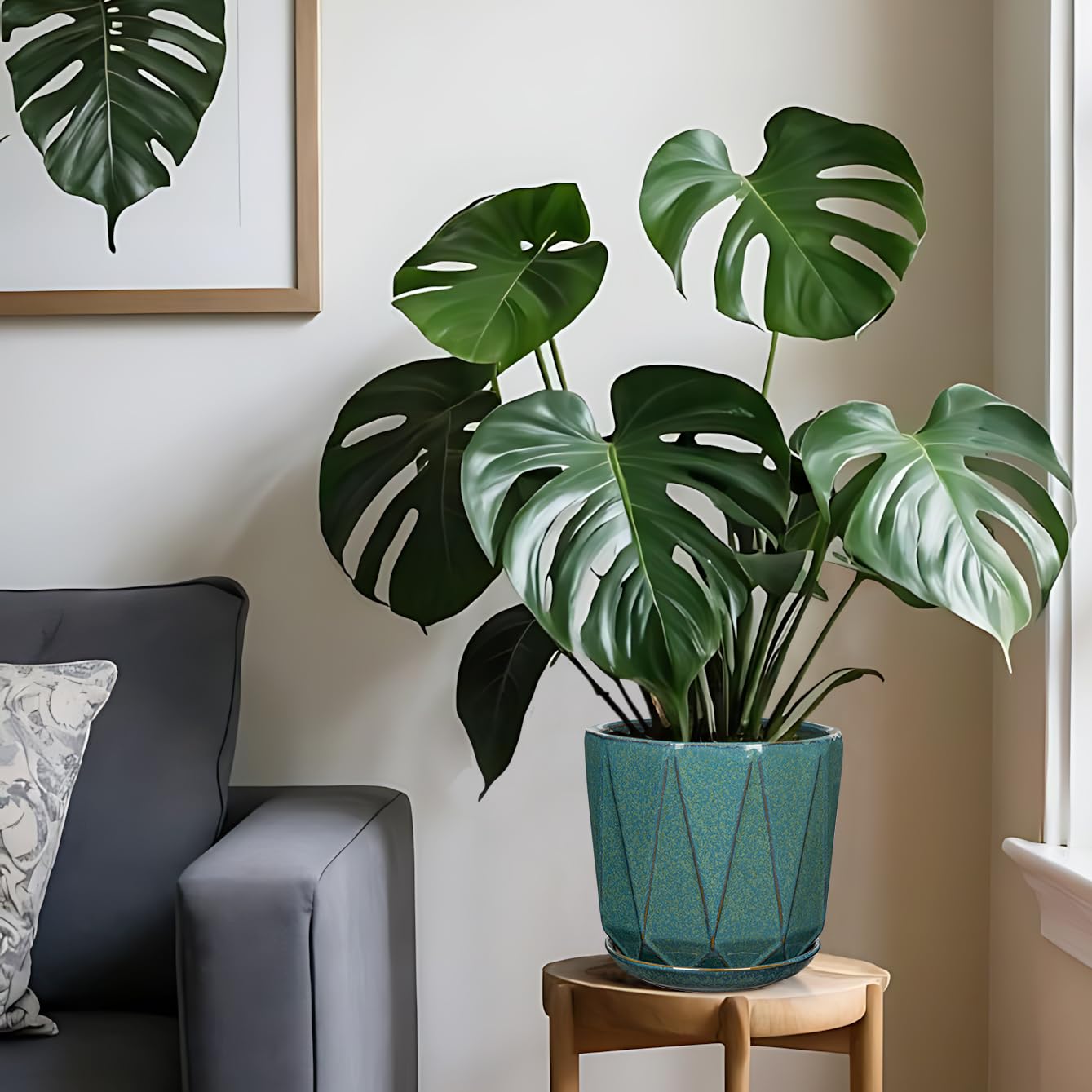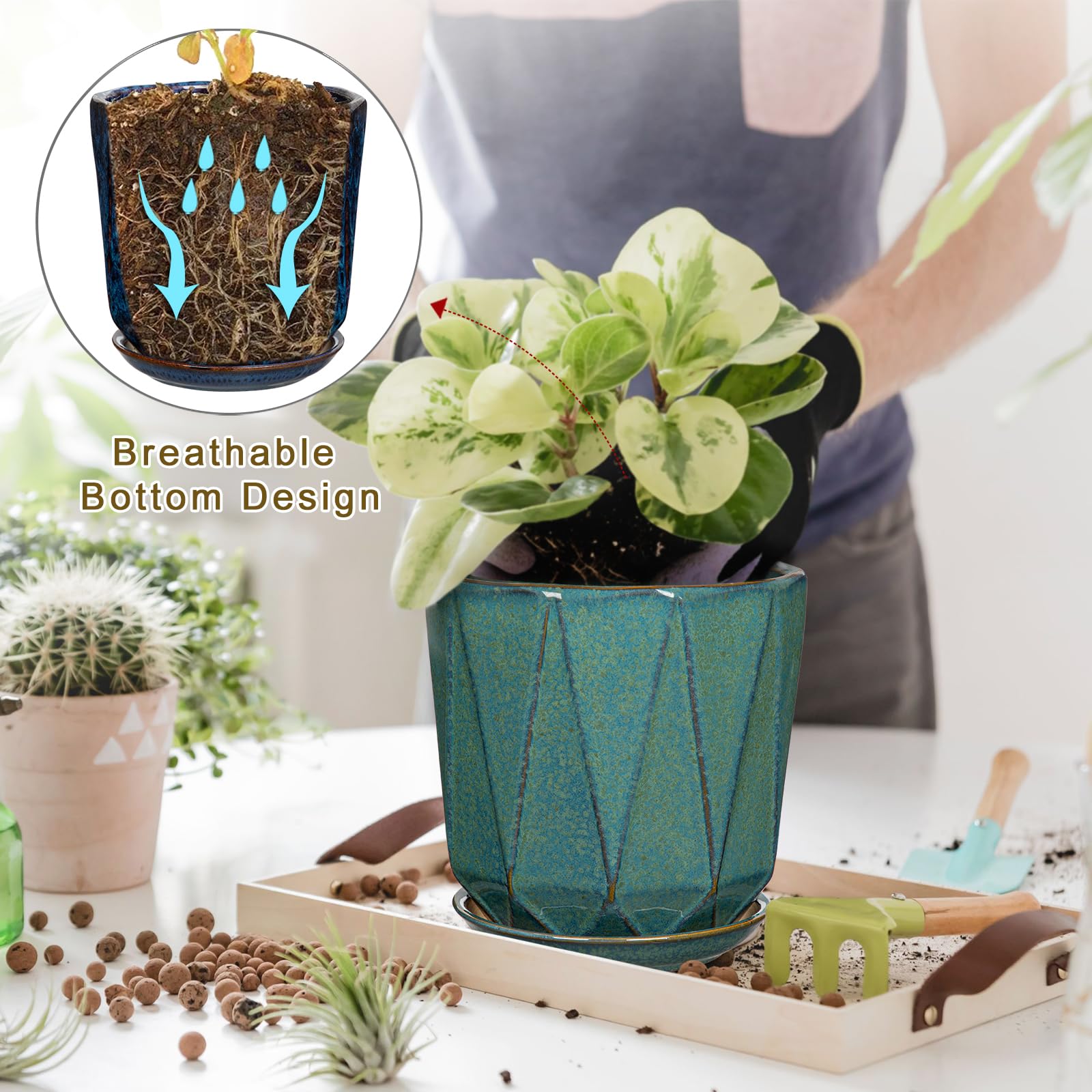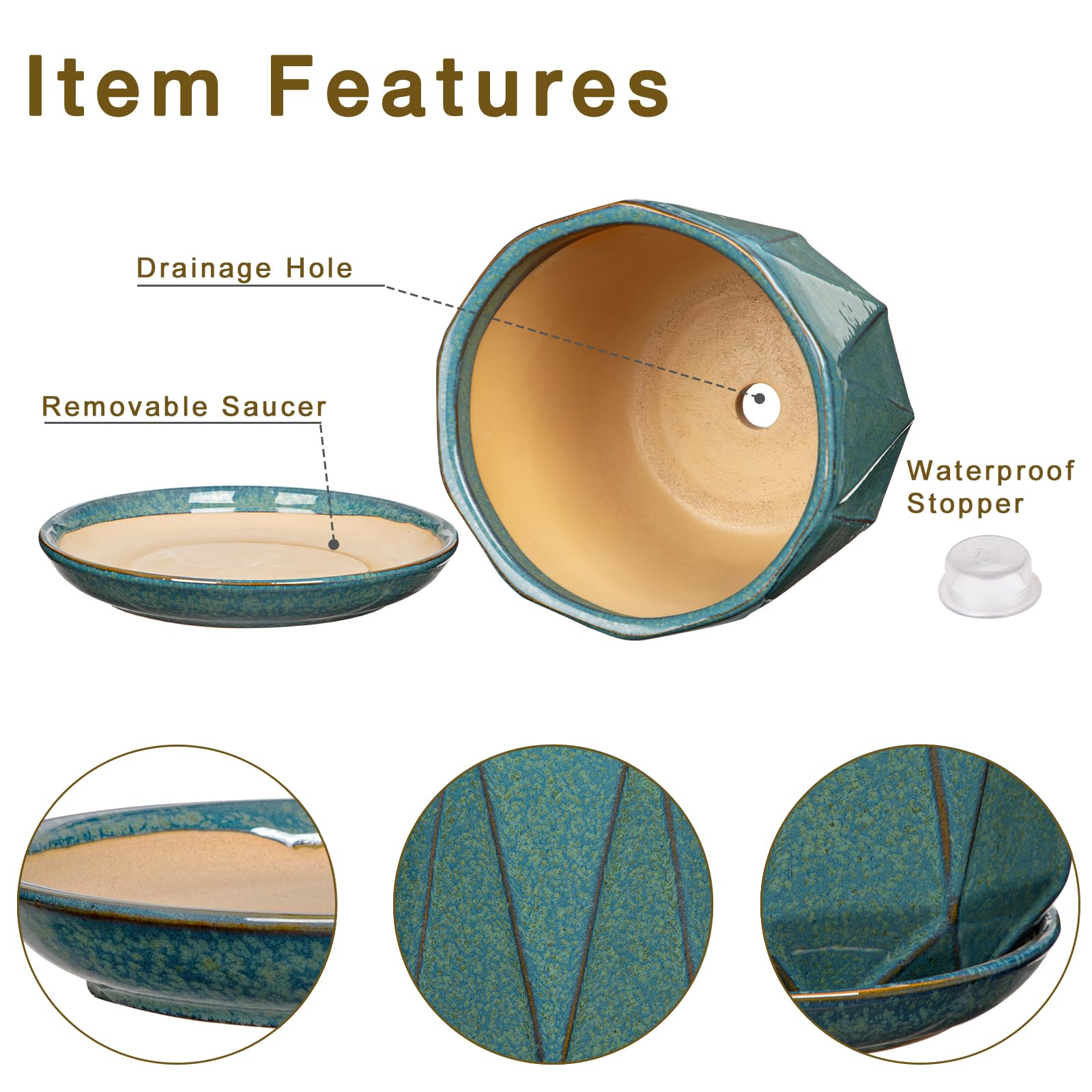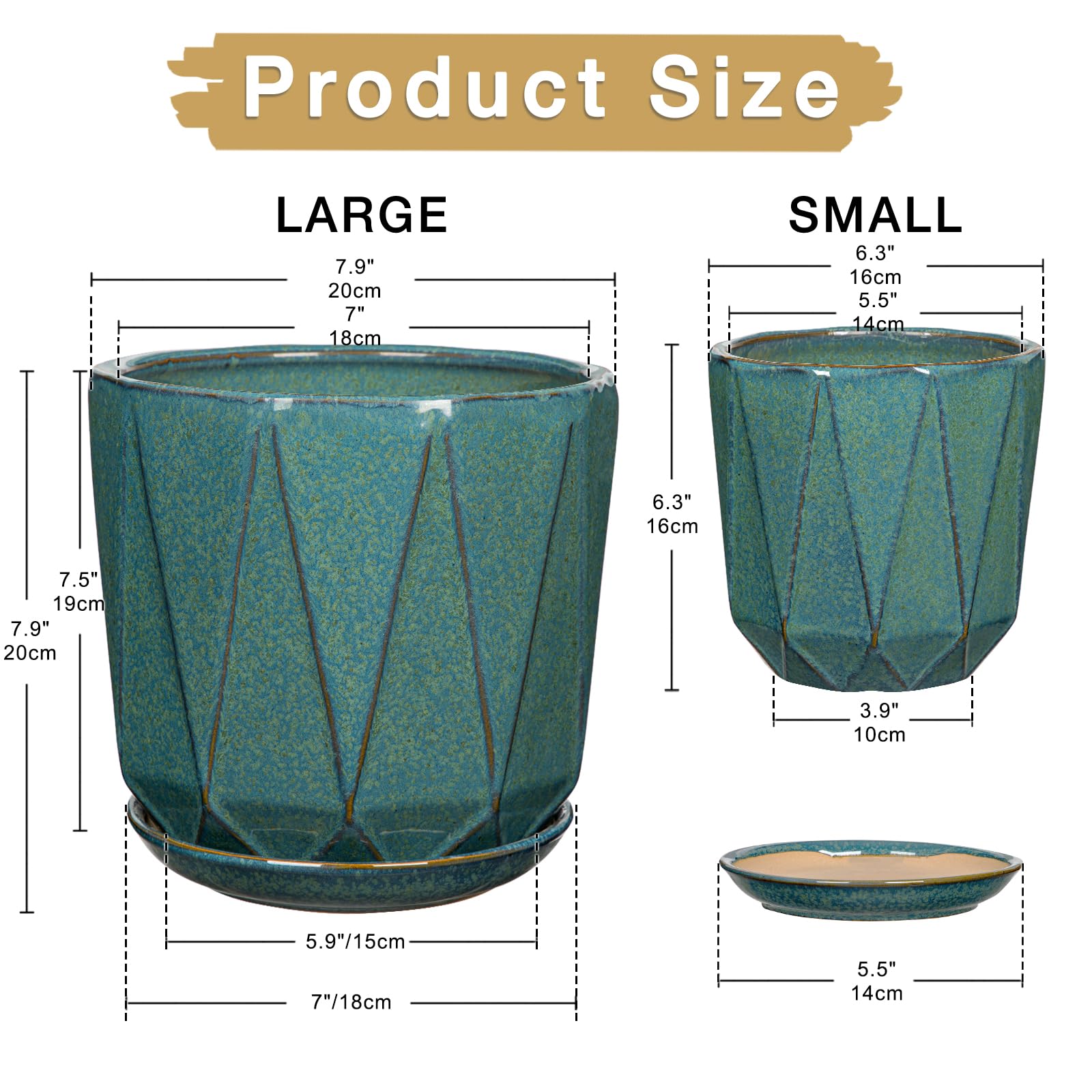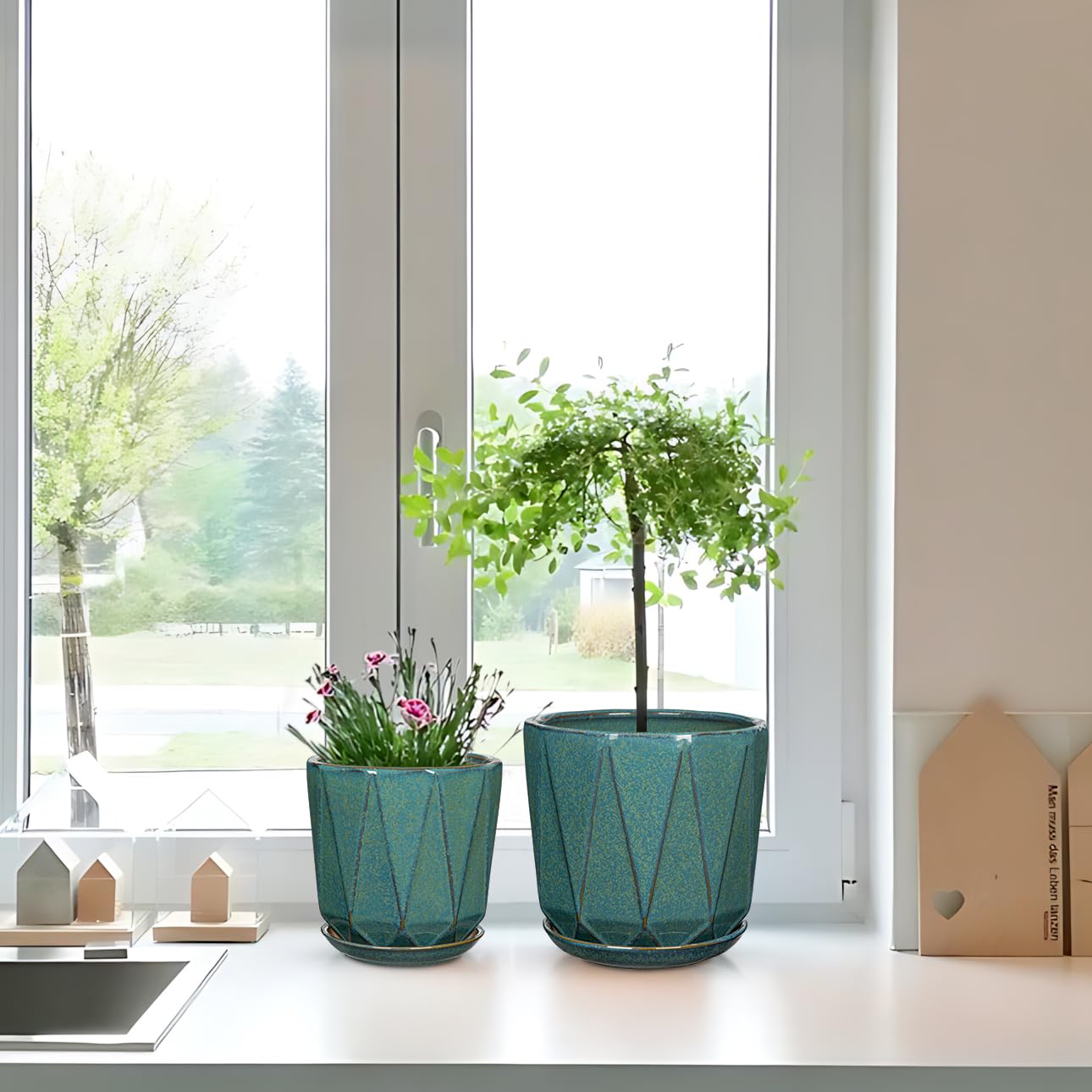 Elevate your space with our artisan crafted big plant pot, where modern design meets timeless elegance. These indoor plant pots are more than just containers; they are striking decorative pieces that blend artistry with functionality for your favorite plants. Featuring a captivating faceted silhouette and elegant vertical lines, each indoor planter makes a bold style statement. The eye-catching glaze is a true highlight. Achieved through a specialized kiln-firing process, it creates beautiful, organic color variations—from deep, transmuting blue-blacks to serene mineral-inspired greens—with a sophisticated mottled texture that mimics natural stone. Paired with matching saucers adorned with a contrasting accent line, the indoor flower pots offers a complete, polished look. Designed for versatility, these planters with saucers seamlessly transition from indoor to outdoor settings. These decorative flower pots are the perfect complement to a wide range of decor styles, whether you prefer modern minimalist, contemporary farmhouse, or classic chic. Use them to create a stunning focal point in your living room, add a touch of greenery to your home office, or enhance the ambiance on your patio or porch. Crafted for the plant enthusiast who values both form and function, this large plant pots set includes two sizes for creative staging. Mix and match with different plants to build your own indoor garden oasis. They also make a thoughtful and impressive gift for housewarmings, birthdays, or any special occasion, offering a touch of curated style that friends and family will love. Note: Plant are not included. Please allow 1.5"-2" differs due to manual measurements. Due to different light settings the actual color might vary a bit from the pictures. Since plant pots indoor are fragile products, you will receive a satisfactory solution if you receive an unsatisfactory product.