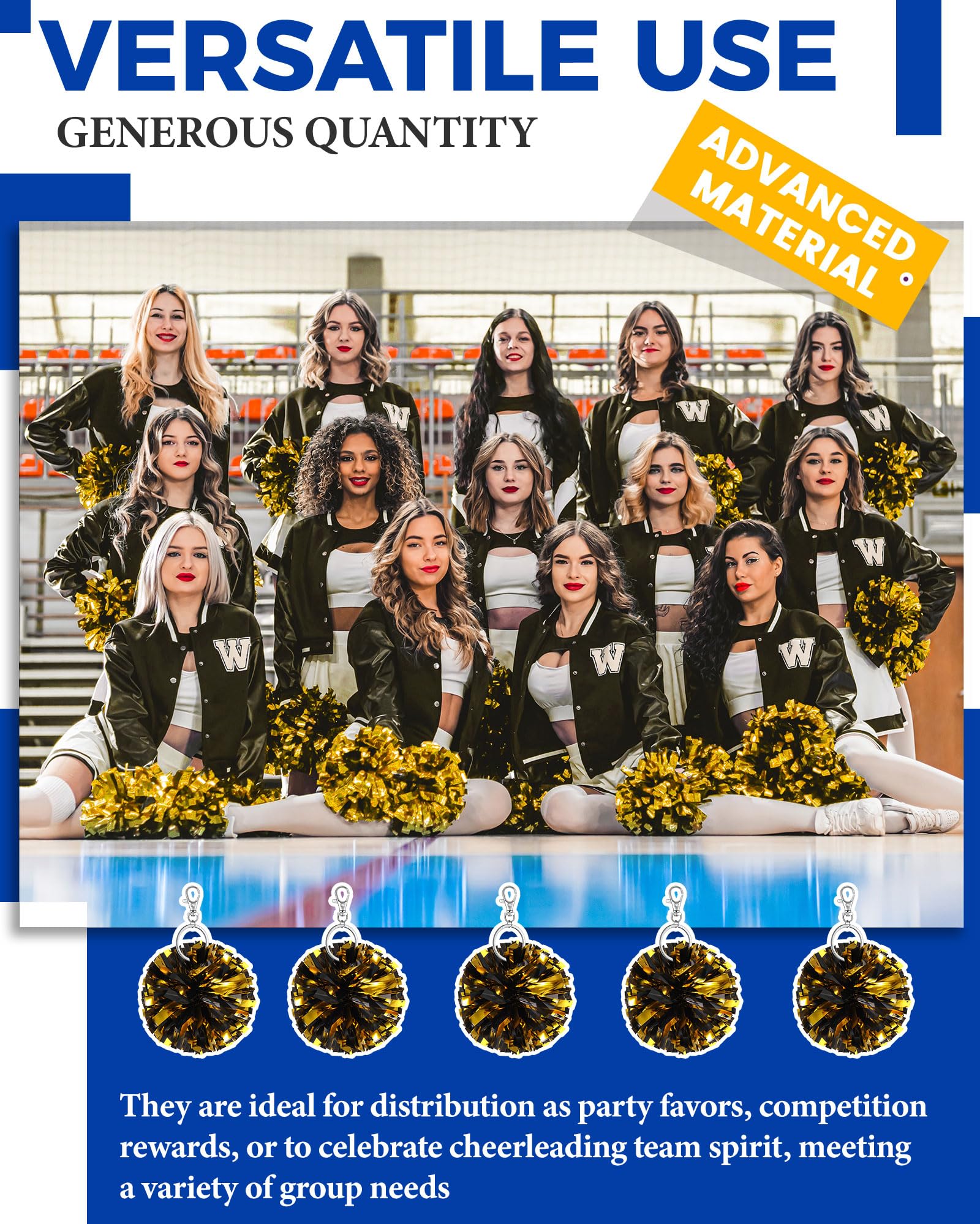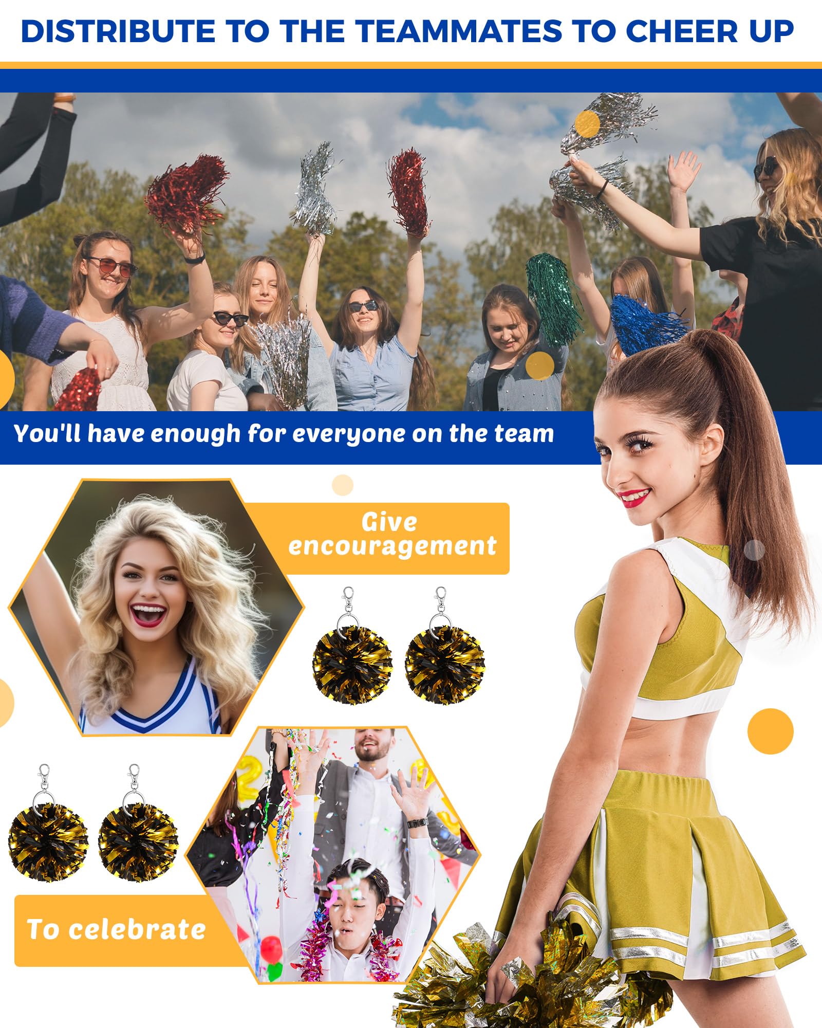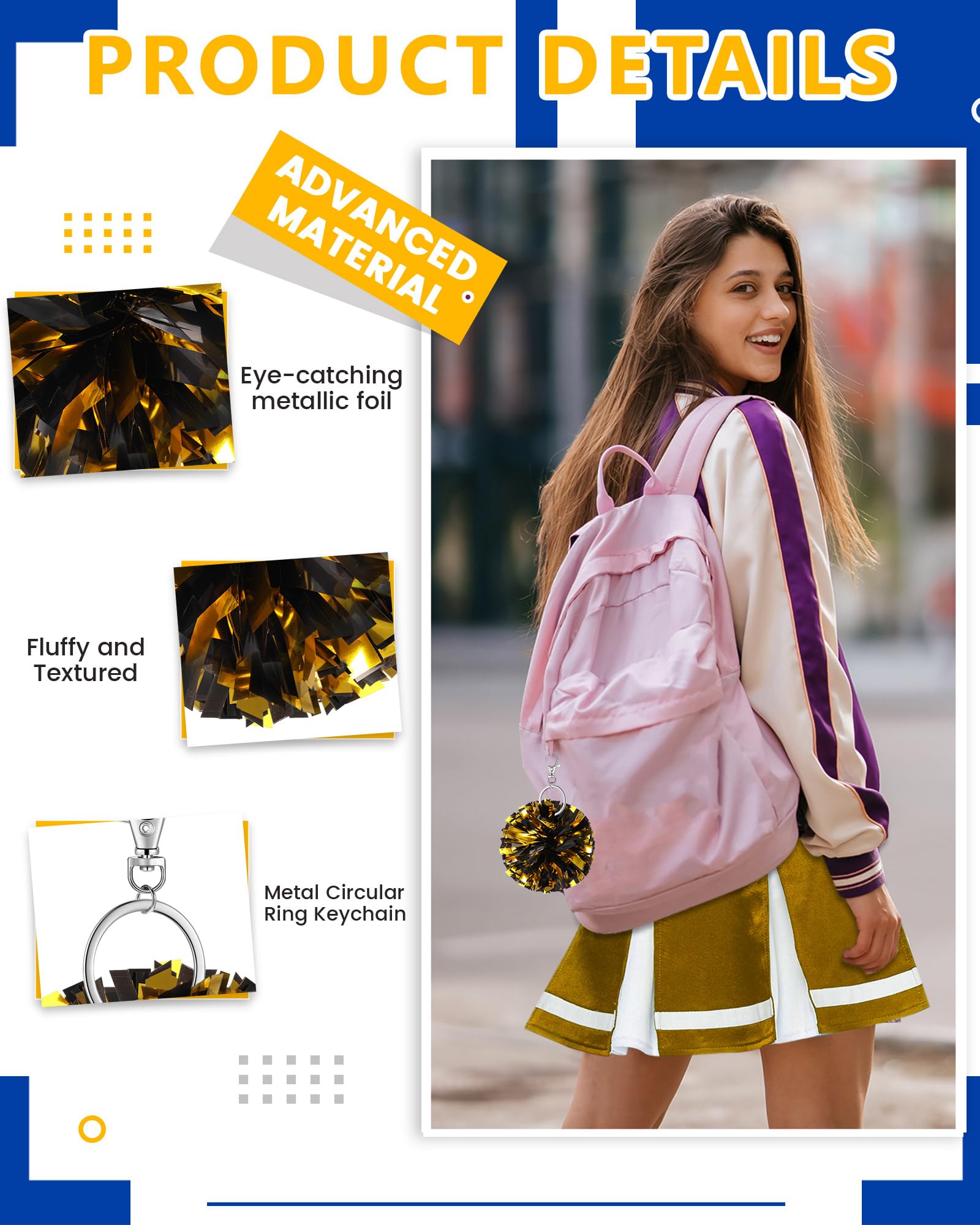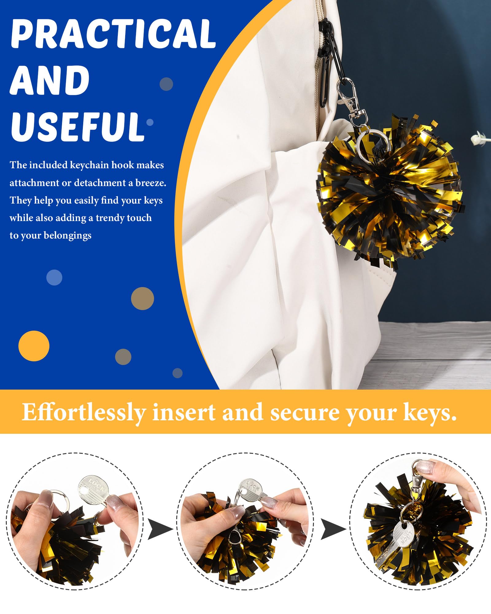 Sturdy Material and Vibrant Colors: these pom pom keychains are made of quality plastic and metal for durability, and feature nonfading, shimmering metallic black gold foil; They catch the eye, boost cheerleading spirit, and show your strong support for the team