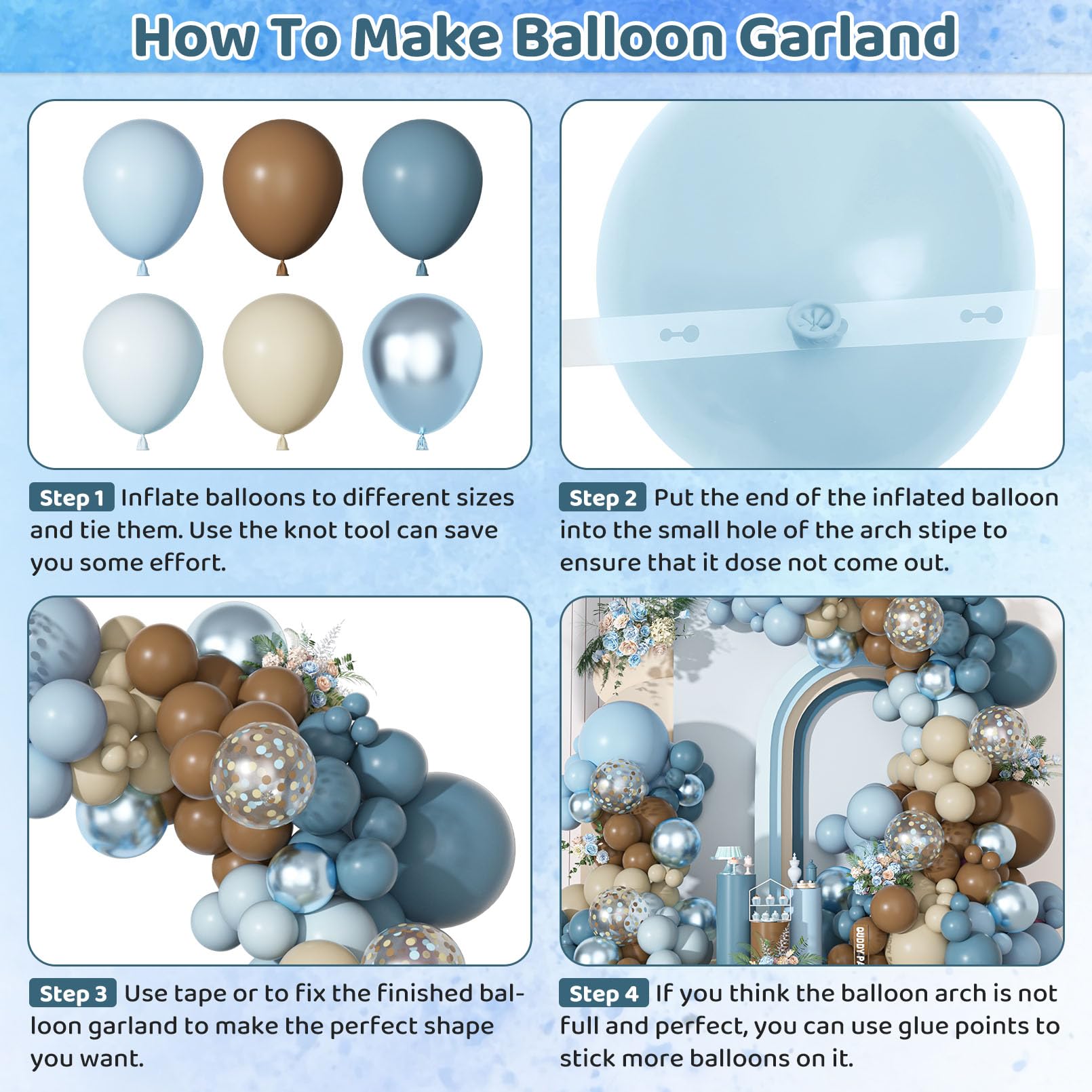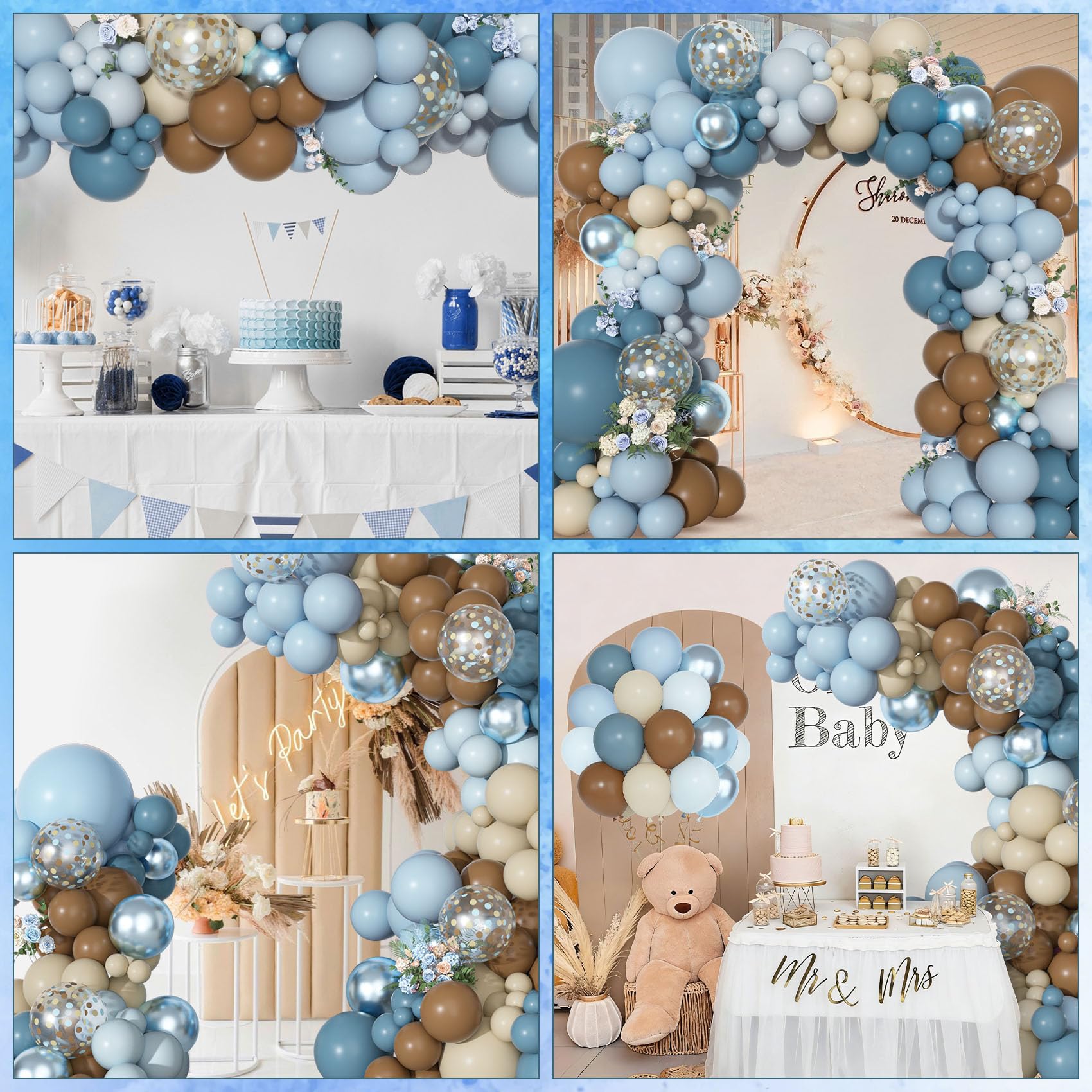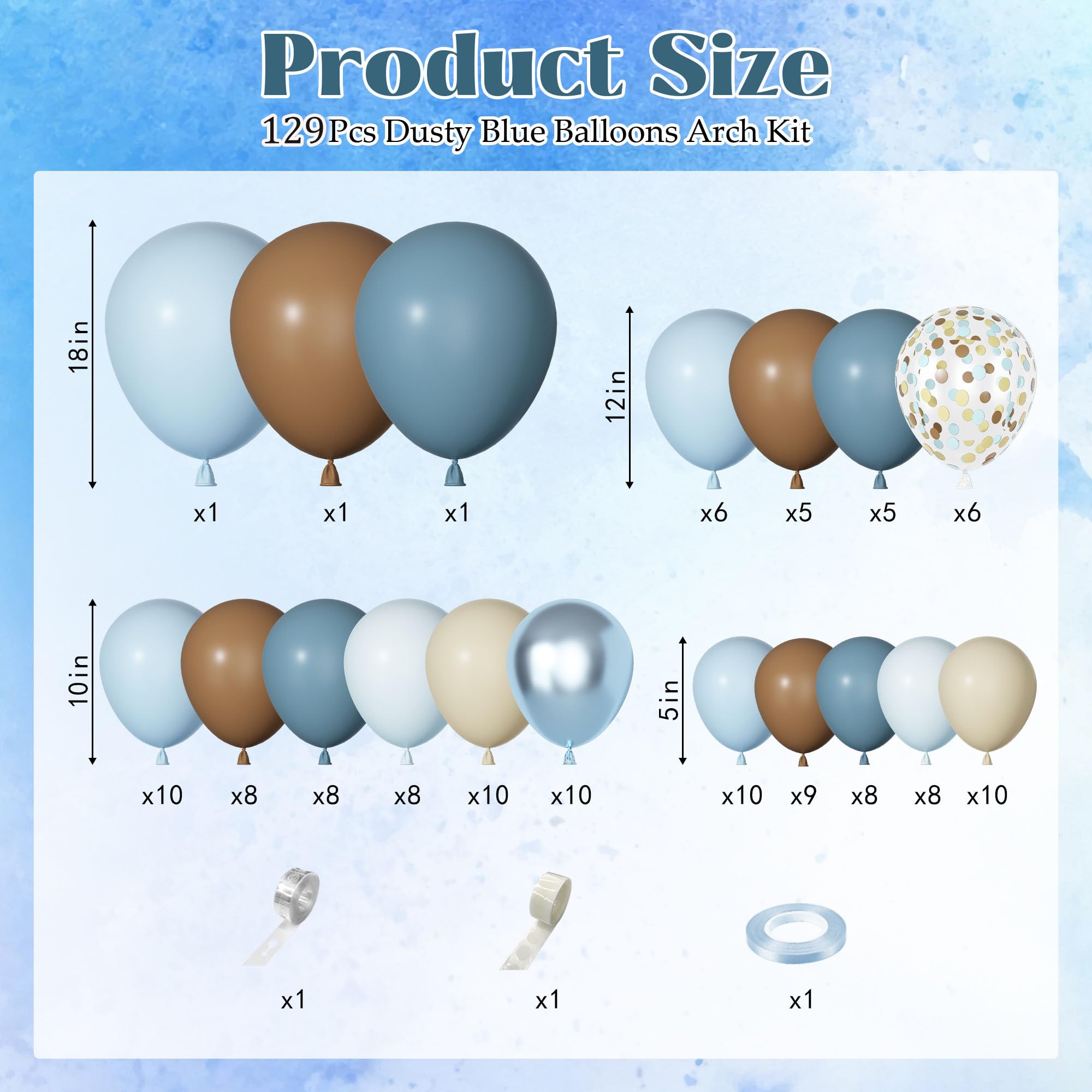 Dusty Blue Brown Balloon Arch Kit: Includes 3pcs 18in balloons(light blue/brown/dusty blue), 22pcs 12in latex/confetti balloons(light blue/brown/dusty blue), 99pcs 10/5in balloons(light blue/brown/dusty blue/pale blue/sand white), 5pcs balloon tools
