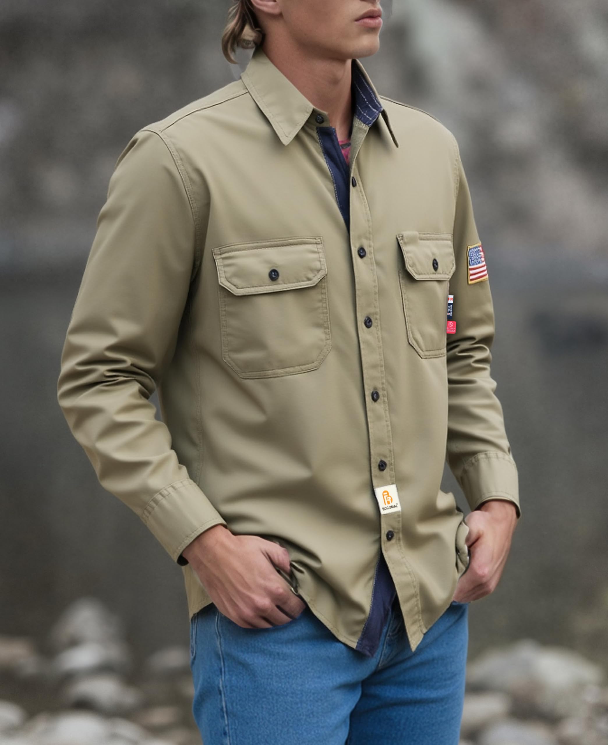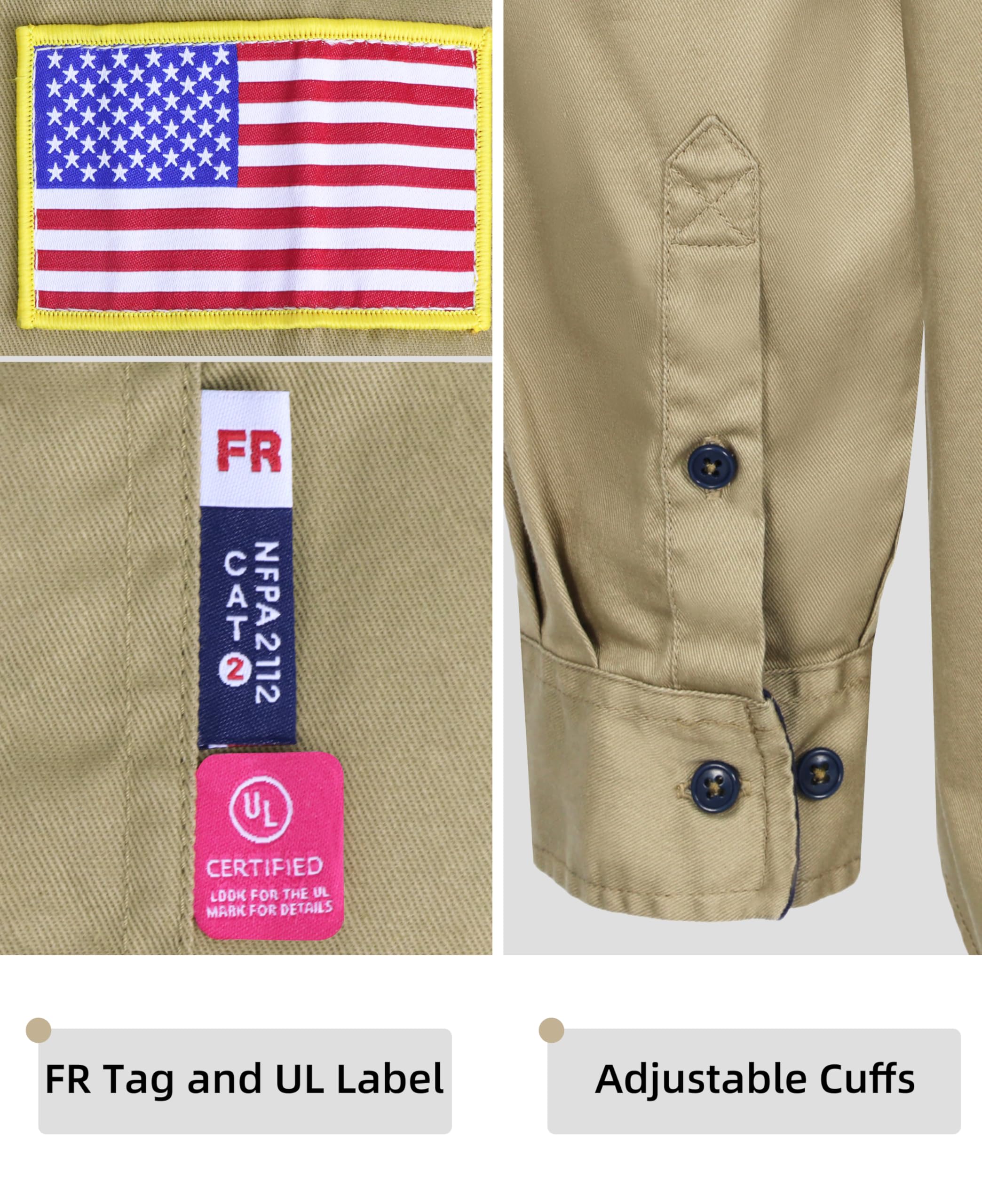 Functional FR MATRIALS:Water & Oil Repellent Finish.6.5OZ Light weight Cotton Twill FR Treated,FR Buttons,FR Sewing Threads!Flame Resistant 100%C NFPA2112 Fire Retardant welding Shirt .Clear FR Tag on front.UL NFPA2112 Classifeid,More FR info On Neck Tag About UL Certification.We Attached A Small Sample Inside Package For Cunstomers Simple FR Try