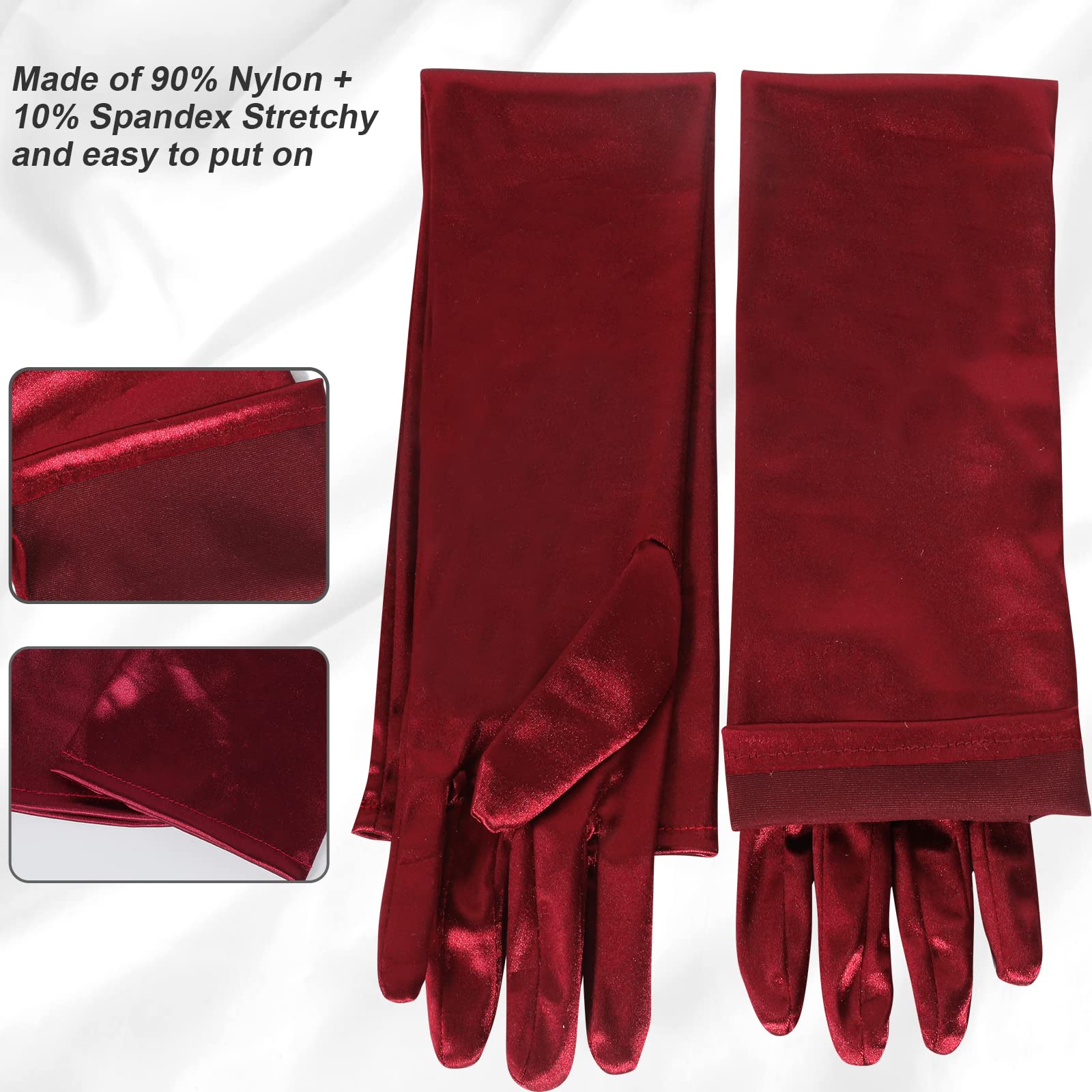 Description Women's White Long Satin Gloves Bridal Dance Gloves For Special Occasion Evening Party, Black, White, Pink, Red Material: Made of 90% Nylon + 10% Spandex, stretchy and easy to put on. Stretch ,soft, smooth, sleek, comfortable to wear The best to hand wash and air dry. Package include: 1 Pair Gloves.