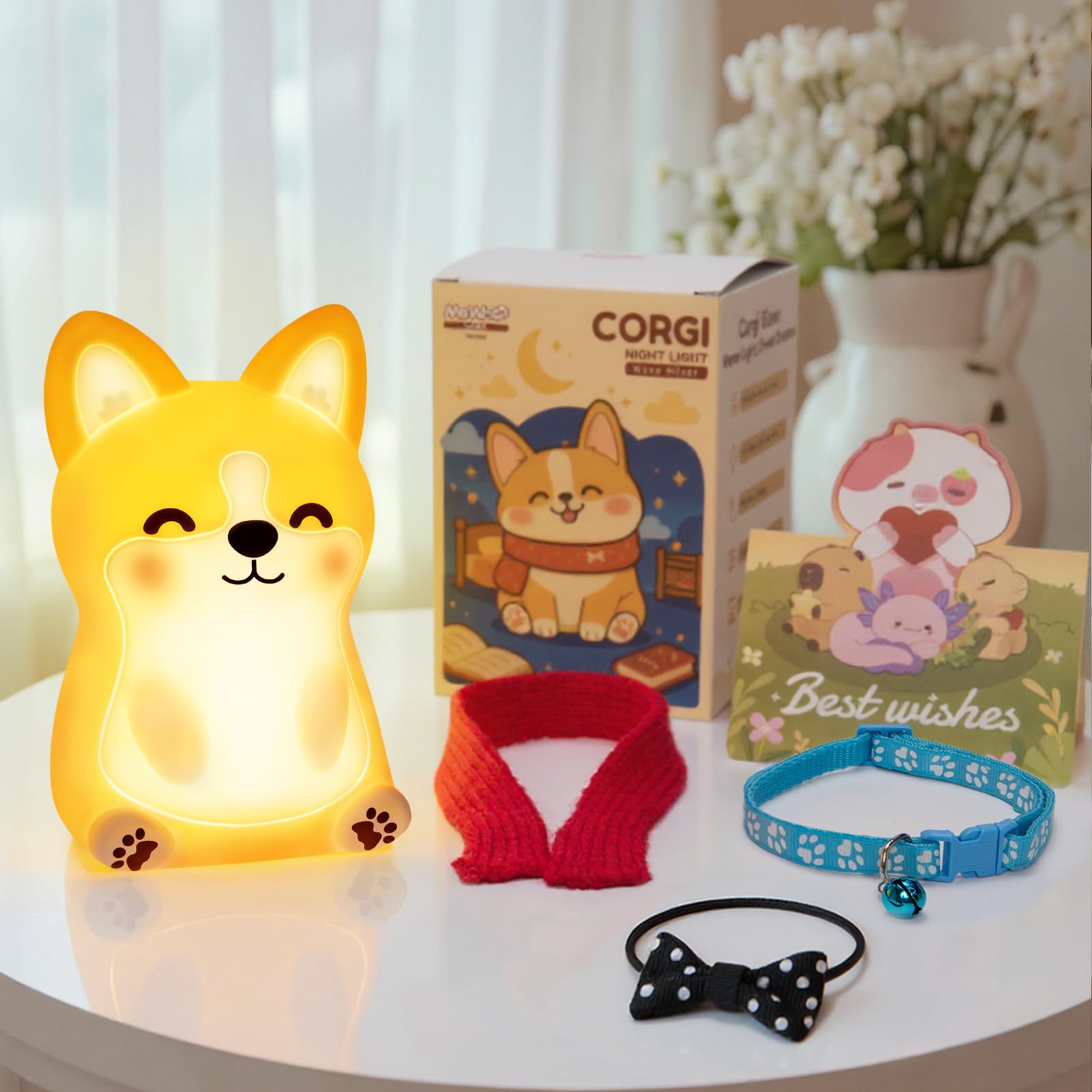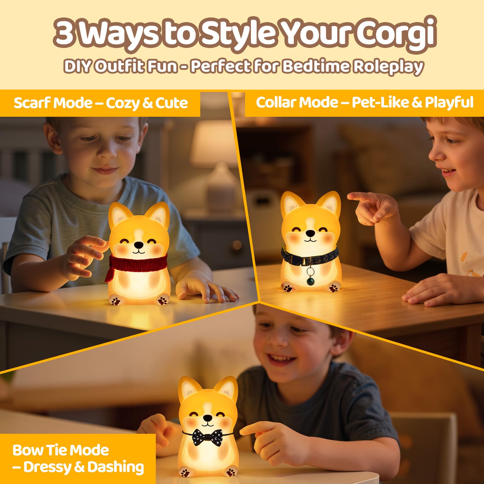 đAdorable DIY accessoriesďźThis corgi night light comes with a cozy scarf, dapper bow tie, and a playful collarâlet little ones dress up their friend for any occasion. Perfect for sparking imagination, kids can swap accessories to match moods: a cozy scarf for storytime snuggles, a polka-dot bow tie for pretend tea parties, or a bright collar for adventure play. The easy-clip designs are toddler-friendly, no tricky buttons or tiesâjust quick snaps to mix and match. These charming add-ons turn the corgi lamp into a personalized companion, making bedtime more fun while encouraging creative expression. Itâs like getting three gifts in one: a corgi dog night light, a DIY craft, and a cuddly pal!