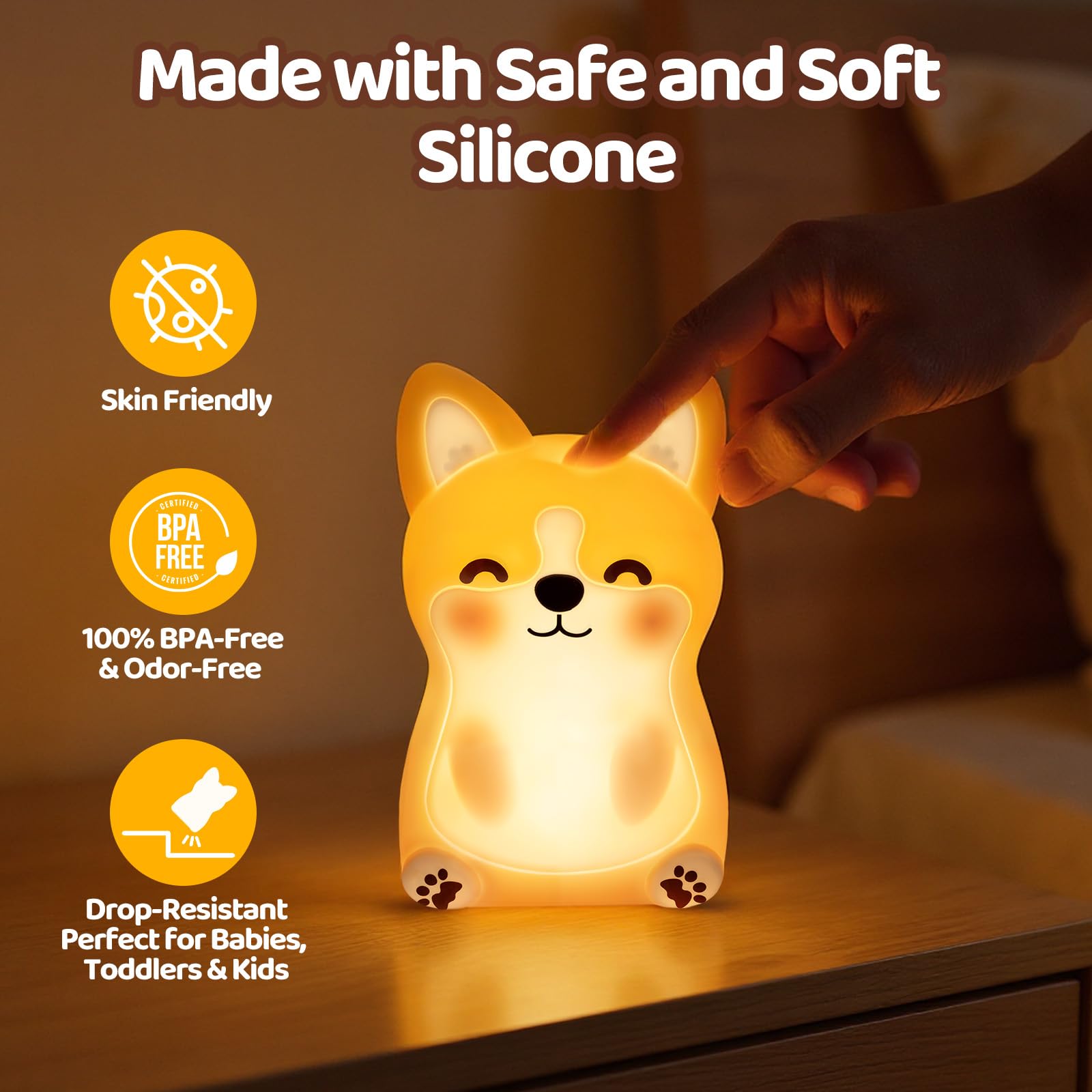 đSoft Corgi Night LightďźFall in love with our Corgi Night Light! This corgi dog night light for kids is irresistibly cute with little ears, a squishy body, and a smiling faceâperfect for kids' bedrooms. Crafted from ultra-soft, high-quality silicone, itâs a delight to touch. The smooth, squishy texture of the corgi dog lamp is perfect for little hands, and its soft silicone material means the corgi dog lamp can handle accidental drops. Let little ones (and grown-ups!) unwind by squishing the soft siliconeâso soft, itâs impossible to put down! âThis charming corgi puppy lamp will quickly become a bedtime favorite, lighting up any kidsâ bedroom with its cuteness and squishy goodness!
