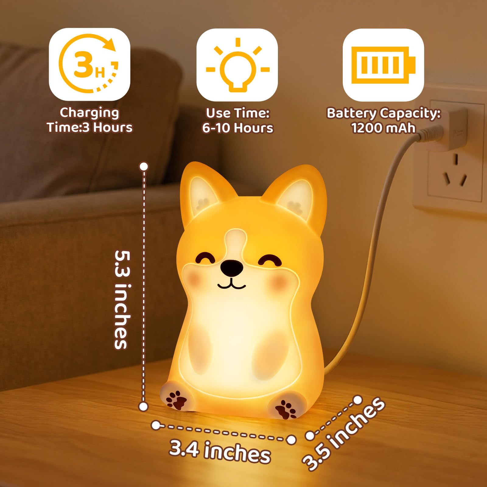 đRechargeable & Long-Lasting Dog LightďźThis adorable puppy night light lamp features a 1200mAh rechargeable battery that lasts up to 10 hoursâperfect for all-night sleep or late-night diaper changes. No cords needed, with USB-C charging for convenience. Portable and lightweight, itâs ideal for bedside, crib, or travel. Charging is a breeze with USB-Câ No more mid-night battery panics. This trusty corgi pup lamp will stay lit through even the longest nights.â The dog light is easy to carry, itâs great for bedside, cribs, or on-the-go. Toss it in your diaper bag for road trips and sleepovers. Say hello to hassle-free, always-ready light with our rechargeable corgi night light!