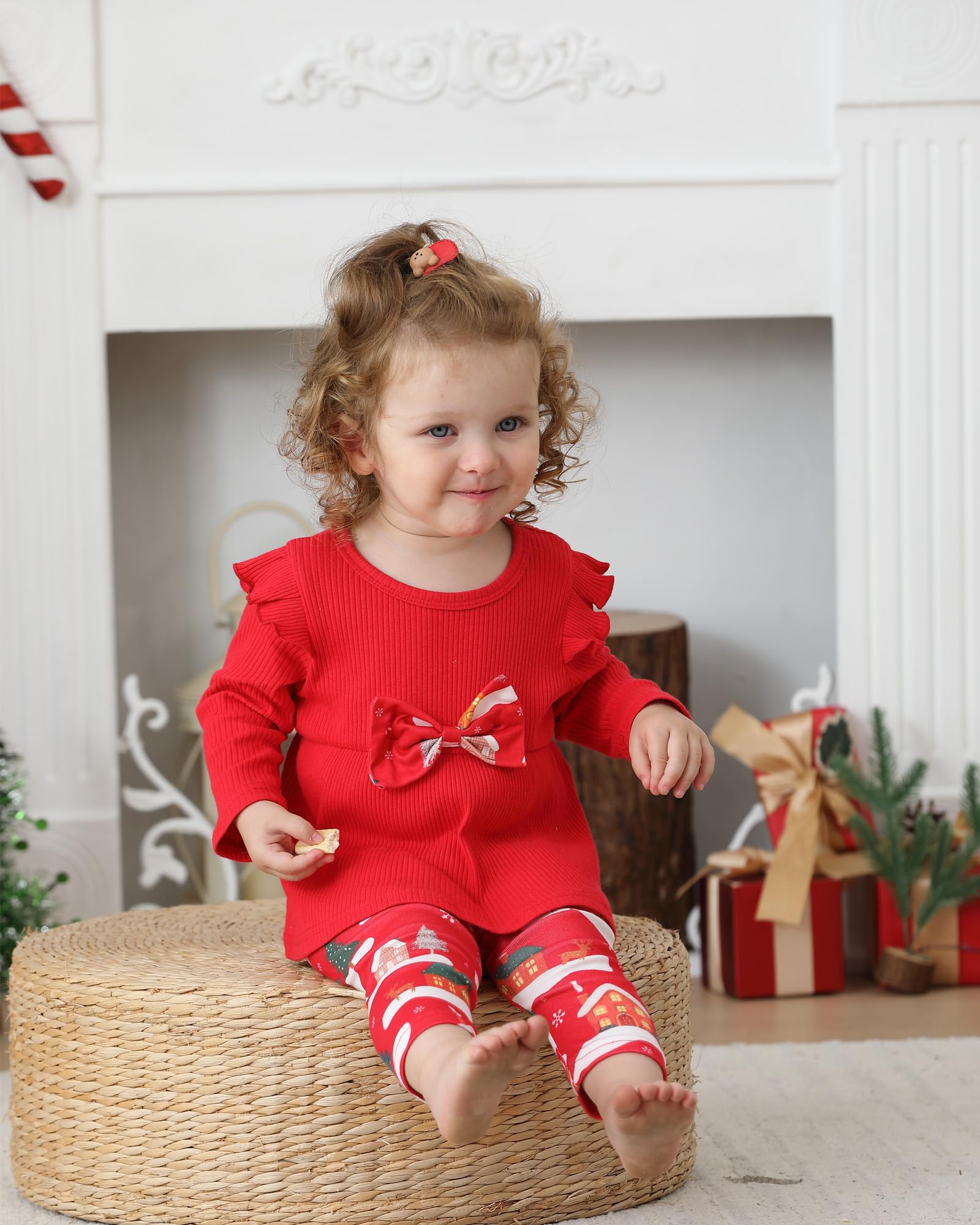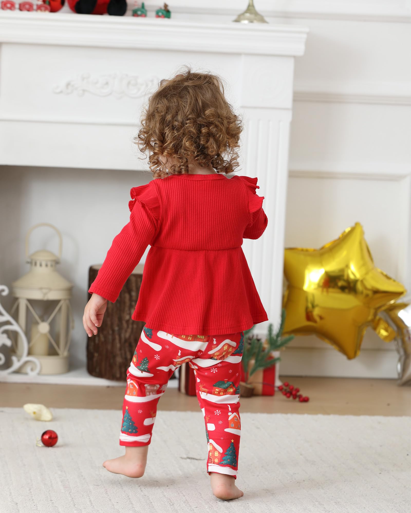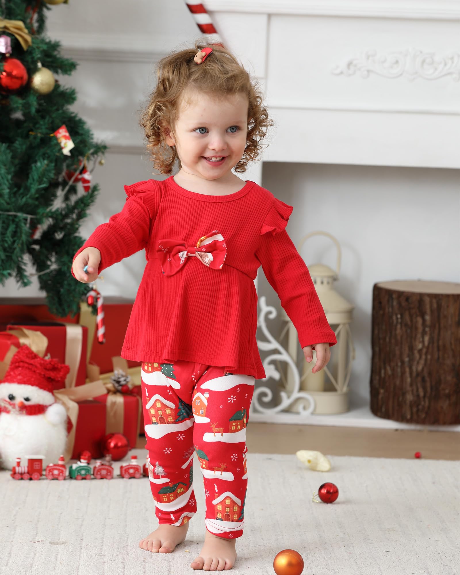 Material: baby girl Christmas outfit features ultra-soft ribbed cotton fabric, both ruffle sleeve tops and stretch leggings of baby girl clothes are lightweight, breathable and skin-friendly