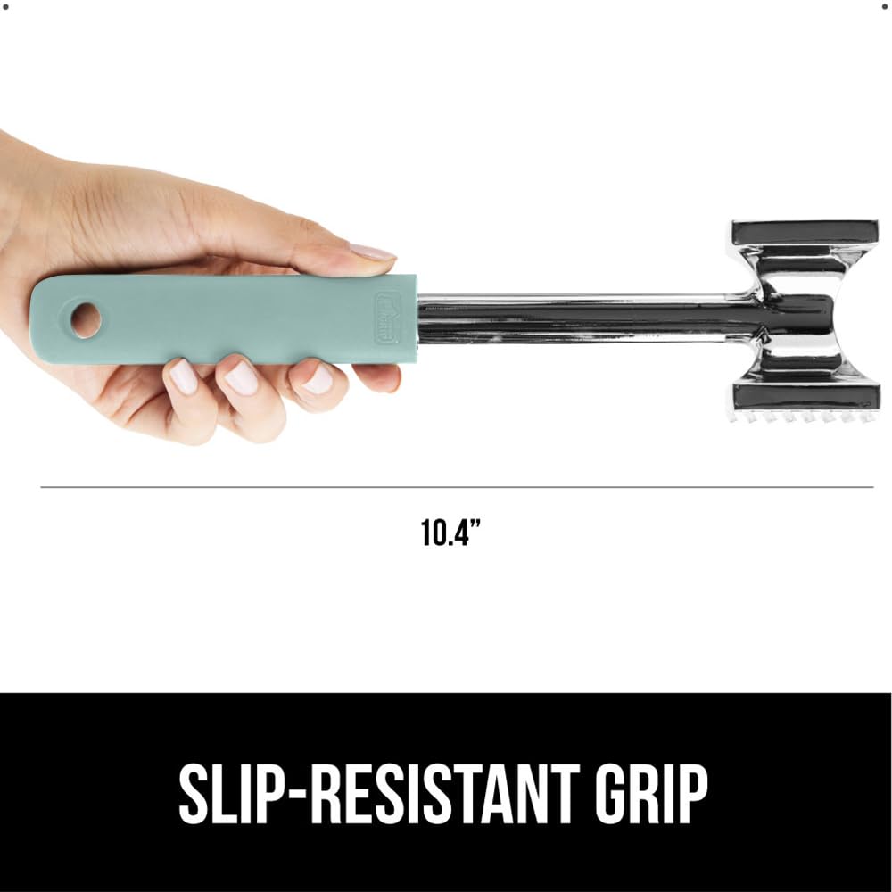 SLIP RESISTANT AND SOFT TOUCH: features a patented design soft touch rubber handle that helps provide slip resistance; comfortable and ergonomic grip makes the meat mallet easy to use; at 10.4 inches long, meat tenderizer is an ideal size and weight to maximize your force without wearing you out; oversized design for maximum comfort