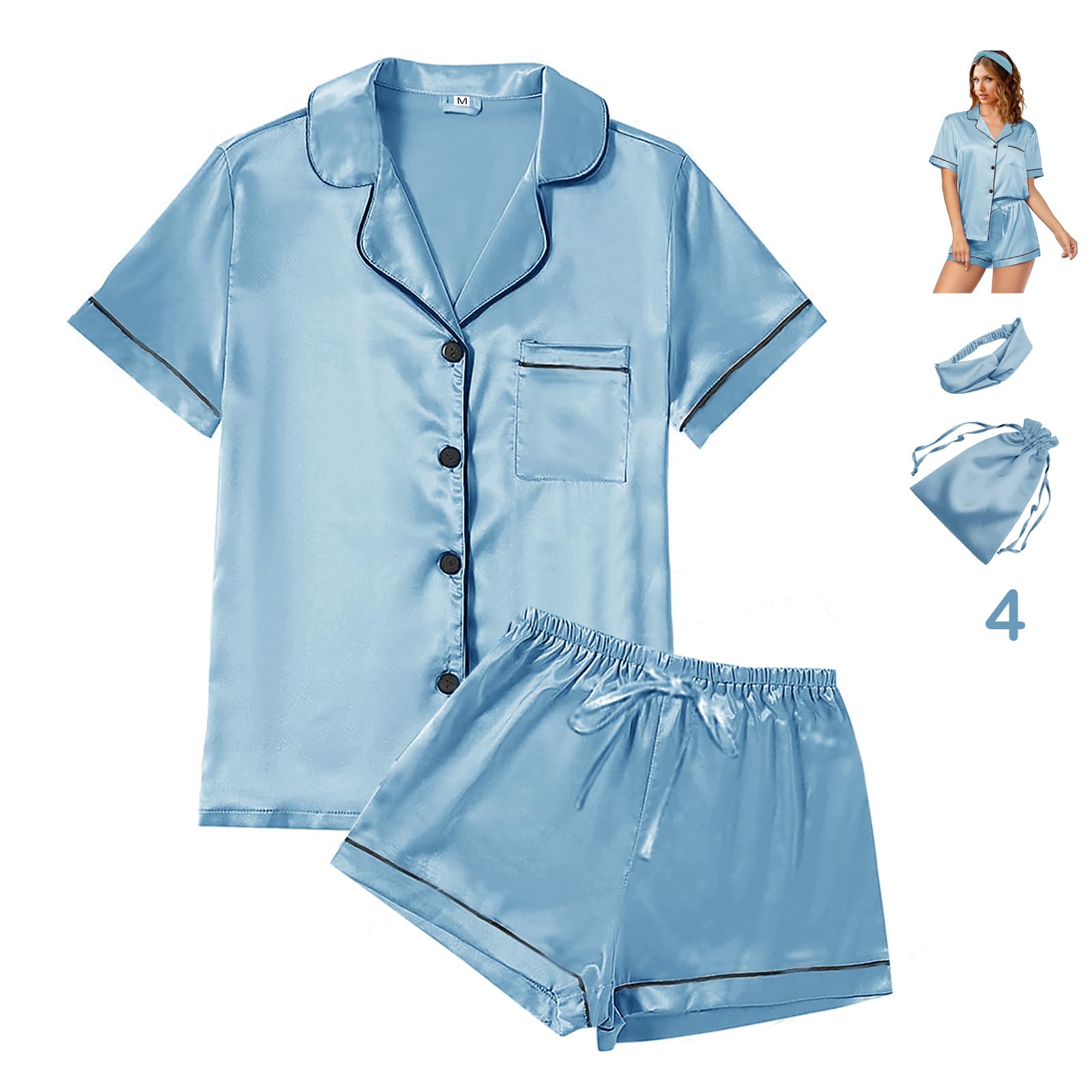 Product Features:Two Piece Pajama Set featuring classic sleepwear style.Short sleeve sleepwear top and pajama shorts set. Premium ultra soft silk satin material in very high quality and this sleep set with superior stitching and perfectly-lined hems. Breathable and Comfy sleepwear set. Wash Care: Hand wash separately in cold water is recommended.