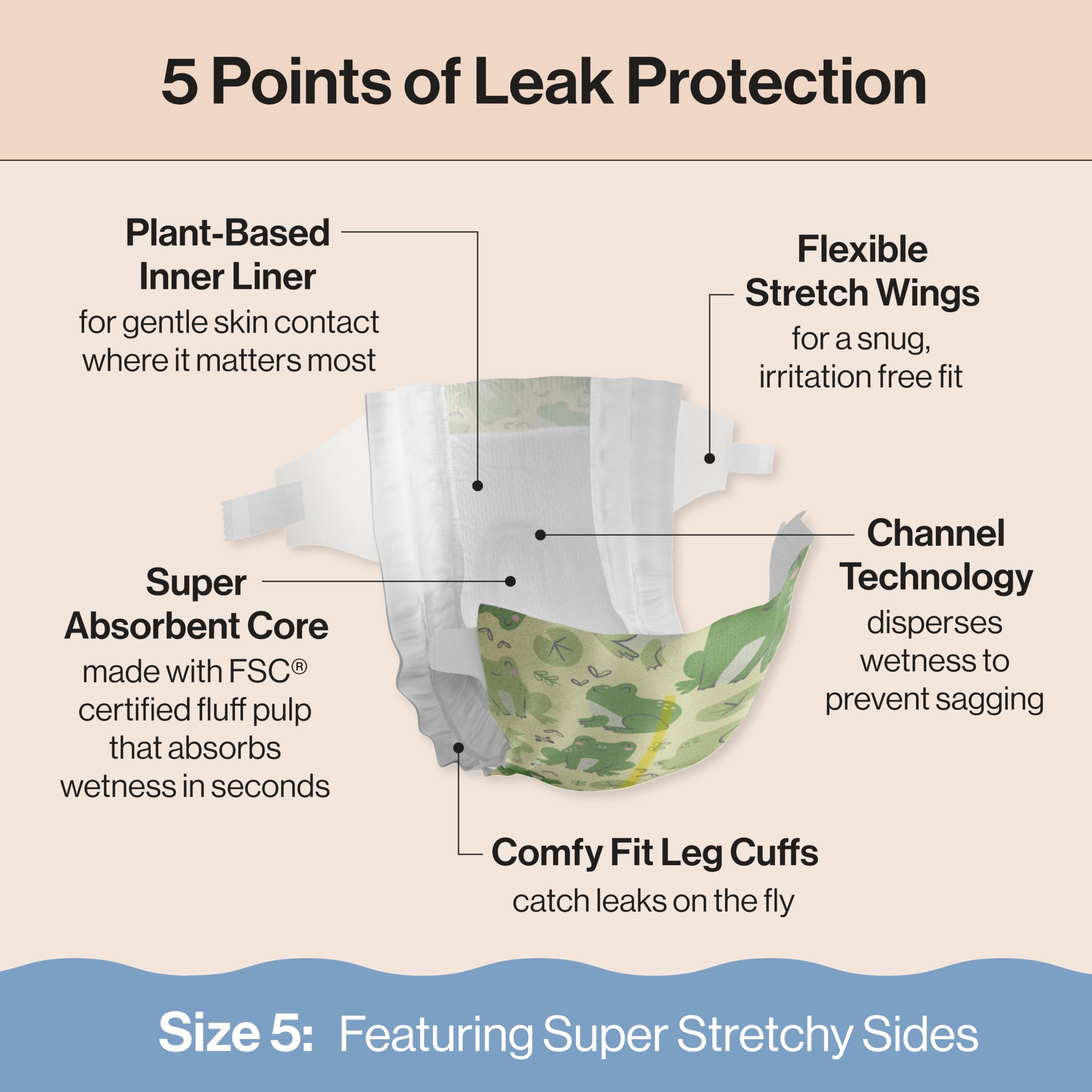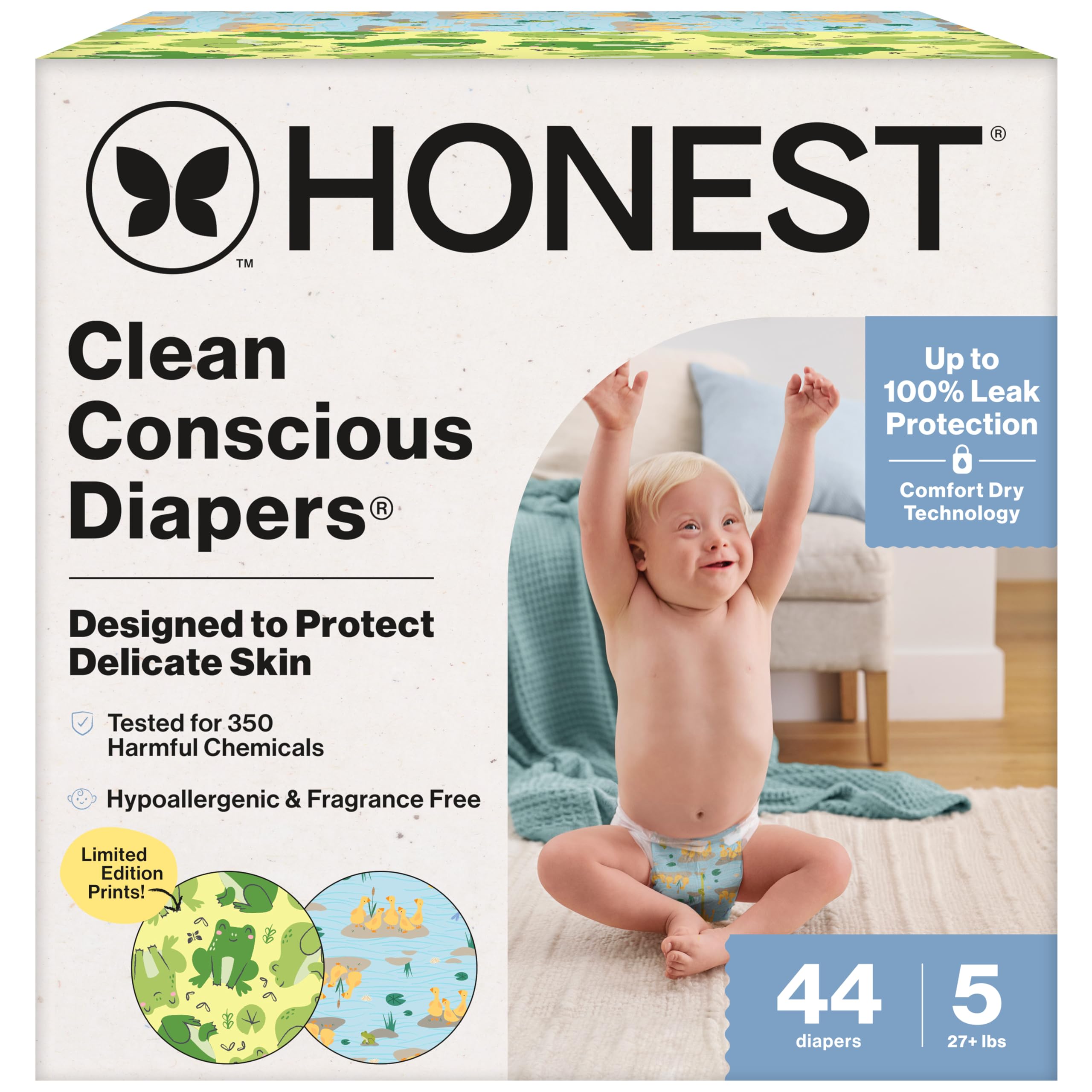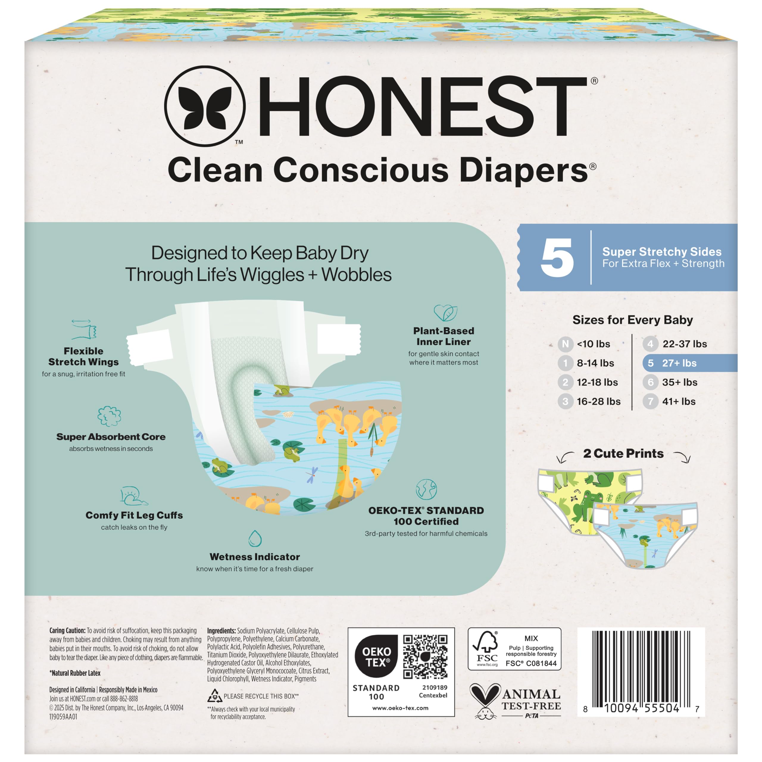 Designed to protect delicate skin, our Clean Conscious Diapers® keep baby comfortable and dry through all the wiggles + wobbles! They deliver up to 100% leak protection with Comfort Dry Technology, a super absorbent core and hypoallergenic, plant-based inner liner for gentle skin contact. Our softest diaper yet features comfy leg cuffs and flexible stretchy wings for a cozy snug, irritation-free fit. And because safety is our top priority, they're made without elemental chlorine, parabens, fragrance and natural rubber latex, and OEKO-TEX® STANDARD 100 certified –3rd party tested for 350 harmful chemicals. For cuteness overload, each diaper features a super cute print and wetness indicator so you know when it's time for a fresh one. How to Use: Lie your baby down on their back, on a safe, flat surface. Lift them gently to place the diaper under them. Bring the diaper front over and up to your baby’s stomach, and use the adhesive diaper tabs to fasten securely. To minimize leaks, make sure the diaper’s leg cuffs are pulled out, rather than tucked in. Materials: Absorbent Bio-Core [Elemental Chlorine Free (ECF) Wood Pulp From Responsibly Managed Forests and other controlled sources], Sodium Polyacrylate containing plant derived odor Inhibitors including Citrus Extract & Liquid Chlorophyll, Outer Layer (Polypropylene), Inner Layer (Plant-Based PLA & Polyethylene), Leg/Waist System (Polymer Spandex & Polypropylene), Polyolefin Adhesives in the Seams & Joints, Wetness Indicator, Super-Cute Design on Backsheet (Inks) Caution: To avoid risk of suffocation, keep this packaging away from babies and children. Choking may result from anything babies put in their mouths. To avoid risk of choking, do not allow baby to tear the diaper. Like any piece of clothing, diapers are flammable.