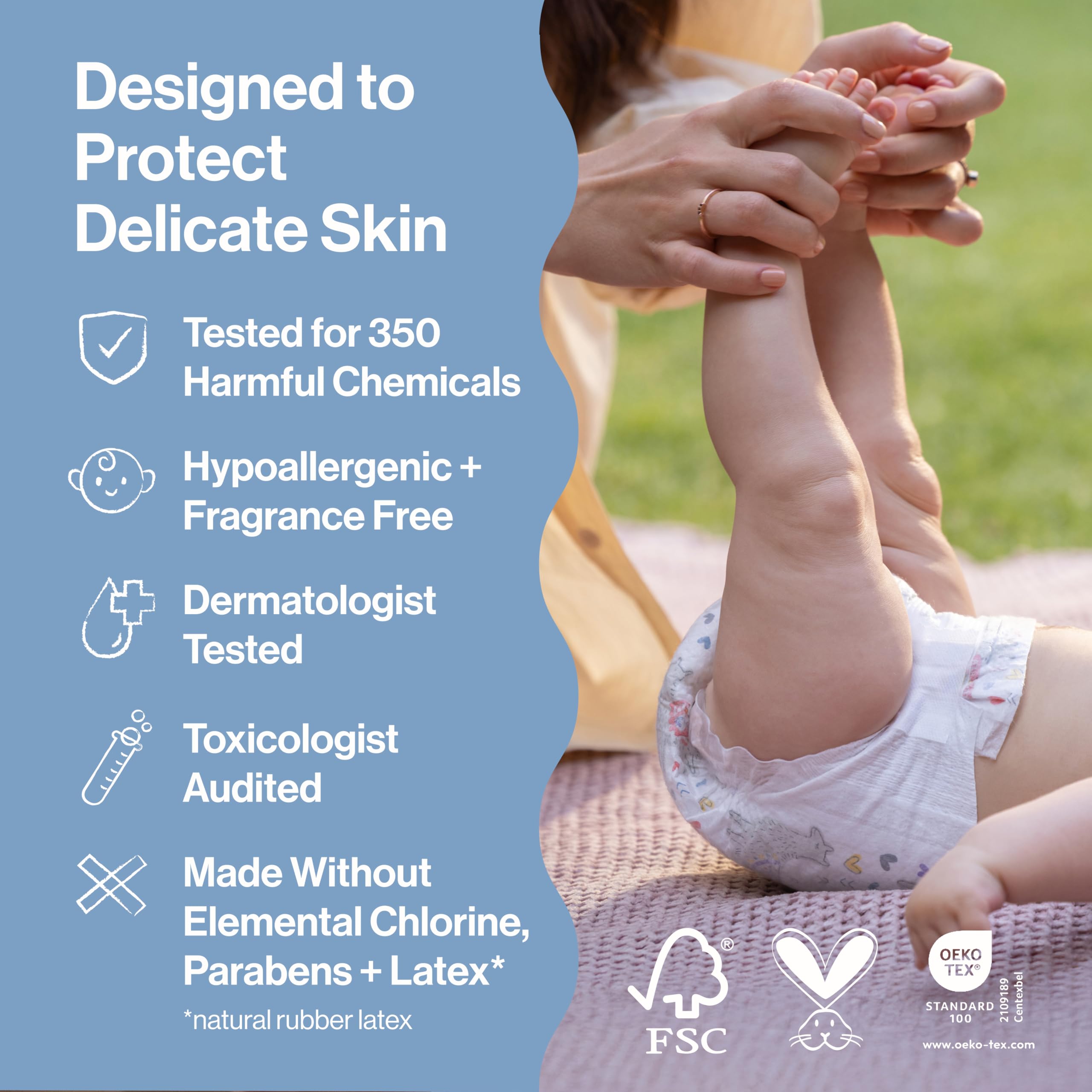 DESIGNED FOR DELICATE SKIN: Hypoallergenic, fragrance free diapers with a plant-based inner liner for gentle skin contact