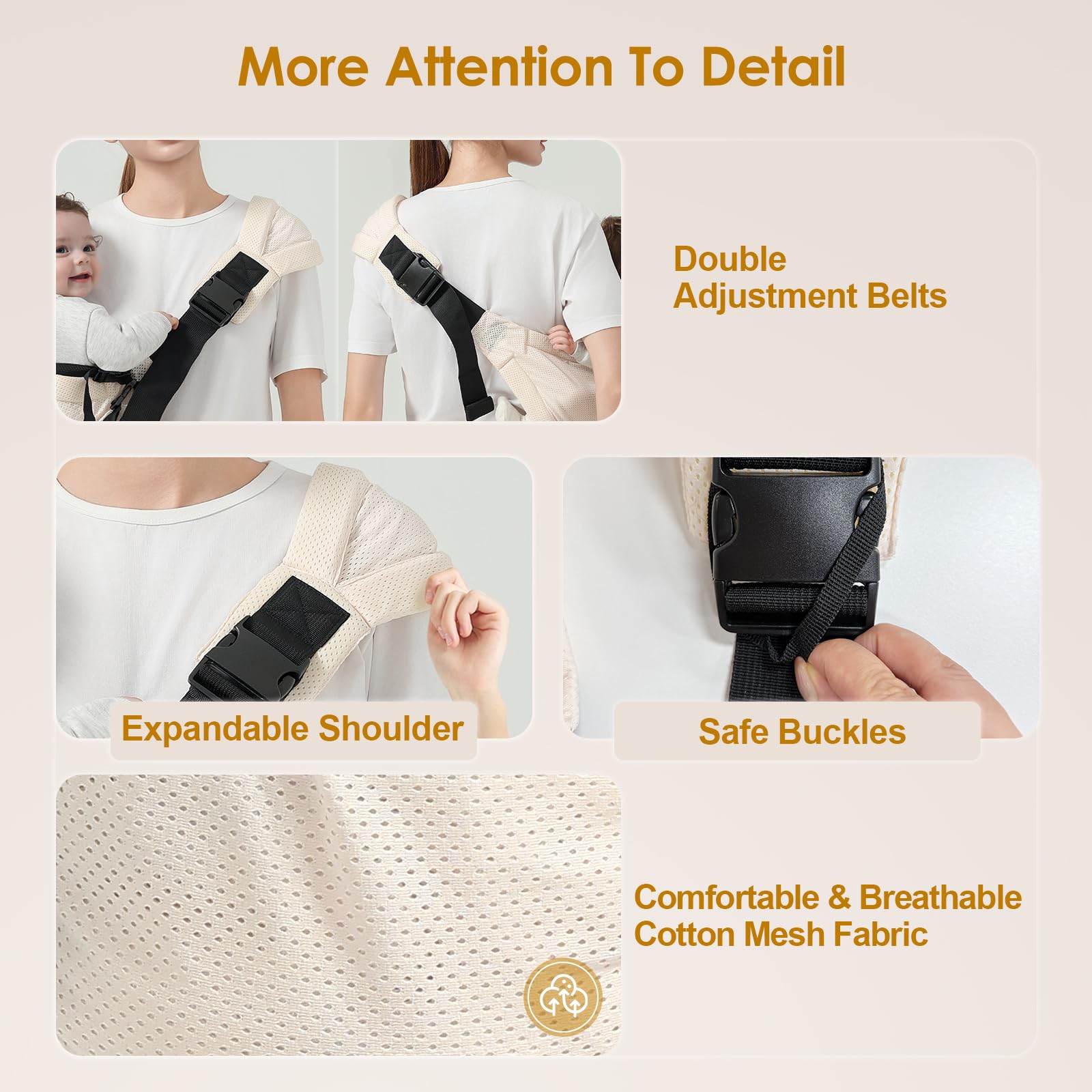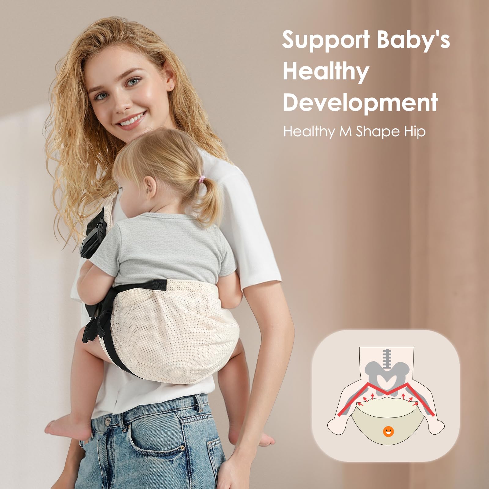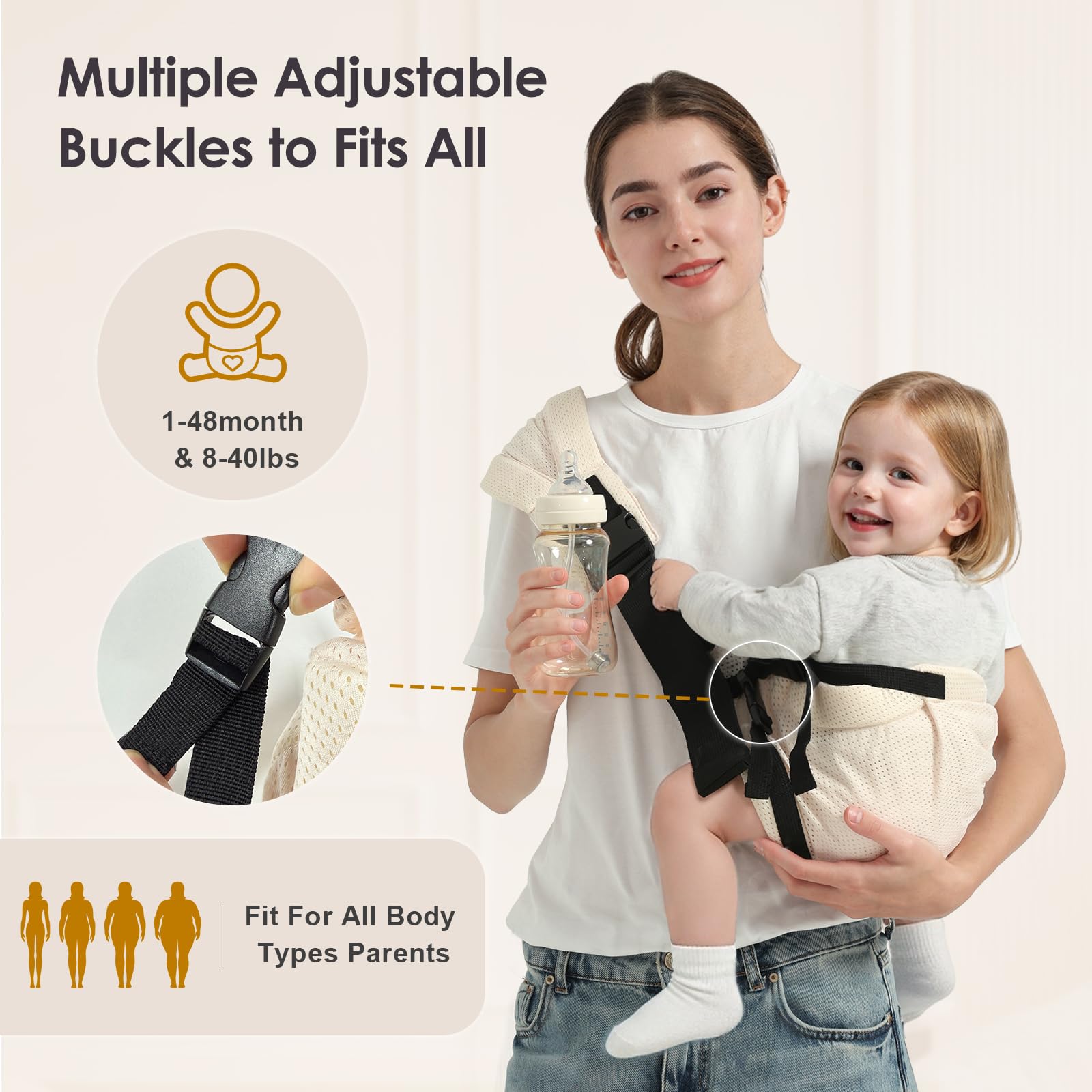 Scientific Support: This baby sling carrier has passed the CPSC safety certification, adopts an ergonomic M-shaped sitting position design, and fits the natural curve of the baby's spine. It is suitable for development needs from 1 to 48 months.