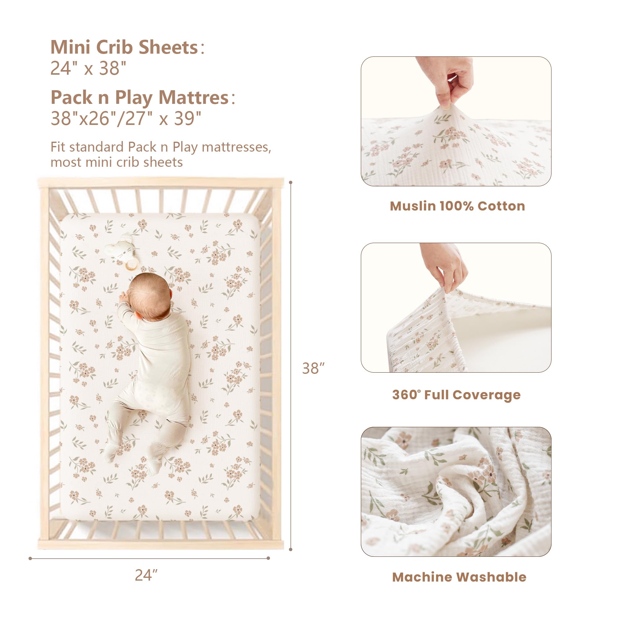 Perfect Fit for Playards & Mini Cribs: Measuring 38 ''x 24 '', Designed to fit most pack n play mattresses, these muslin pack and play sheets fitted stay in place, ensuring a snug and secure fit for your baby’s safety and comfort during rest or playtime