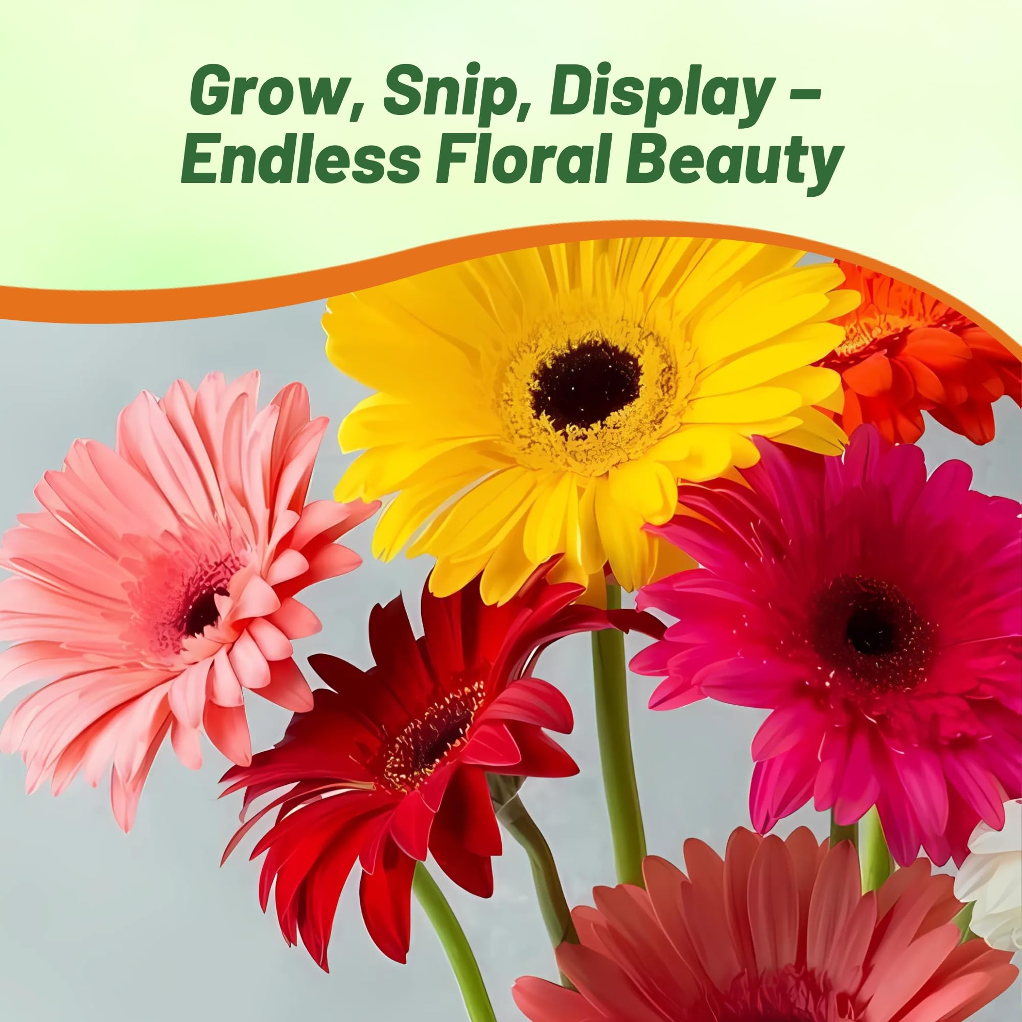 VIBRANT MIXED BLOOMS: Brighten your garden with the stunning colors of Colorbloom Mix Gerbera Daisy Seeds in vibrant mixed shades. With deep green foliage, our large dazzling flowers add a pop of charm and elegance, transforming any indoor and outdoor space into a colorful oasis. Perfect for garden beds, pots, or as cut flowers, their bold, eye-catching appeal is sure to impress.