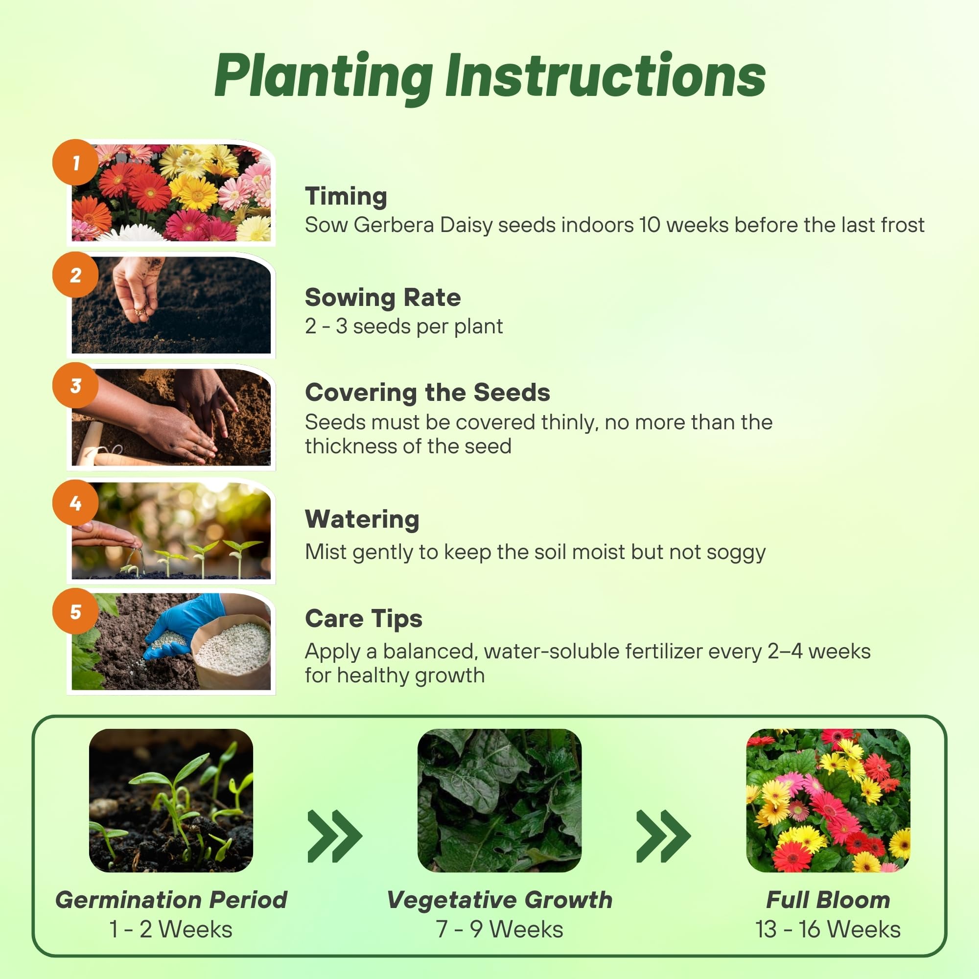 LOW-MAINTENANCE & VERSATILE: Thriving in full sun to partial shade, our hardy plants only require a sow rate of 2-3 seeds per plant in a well-drained soil (pH 6.1-7.5) with 8-10 inch spacing, then cover thinly under 70F degrees while allowing a germination time of 10-21 days for optimal results. Their versatility makes them ideal for landscaping, cutting gardens, pots, and indoor arrangements.