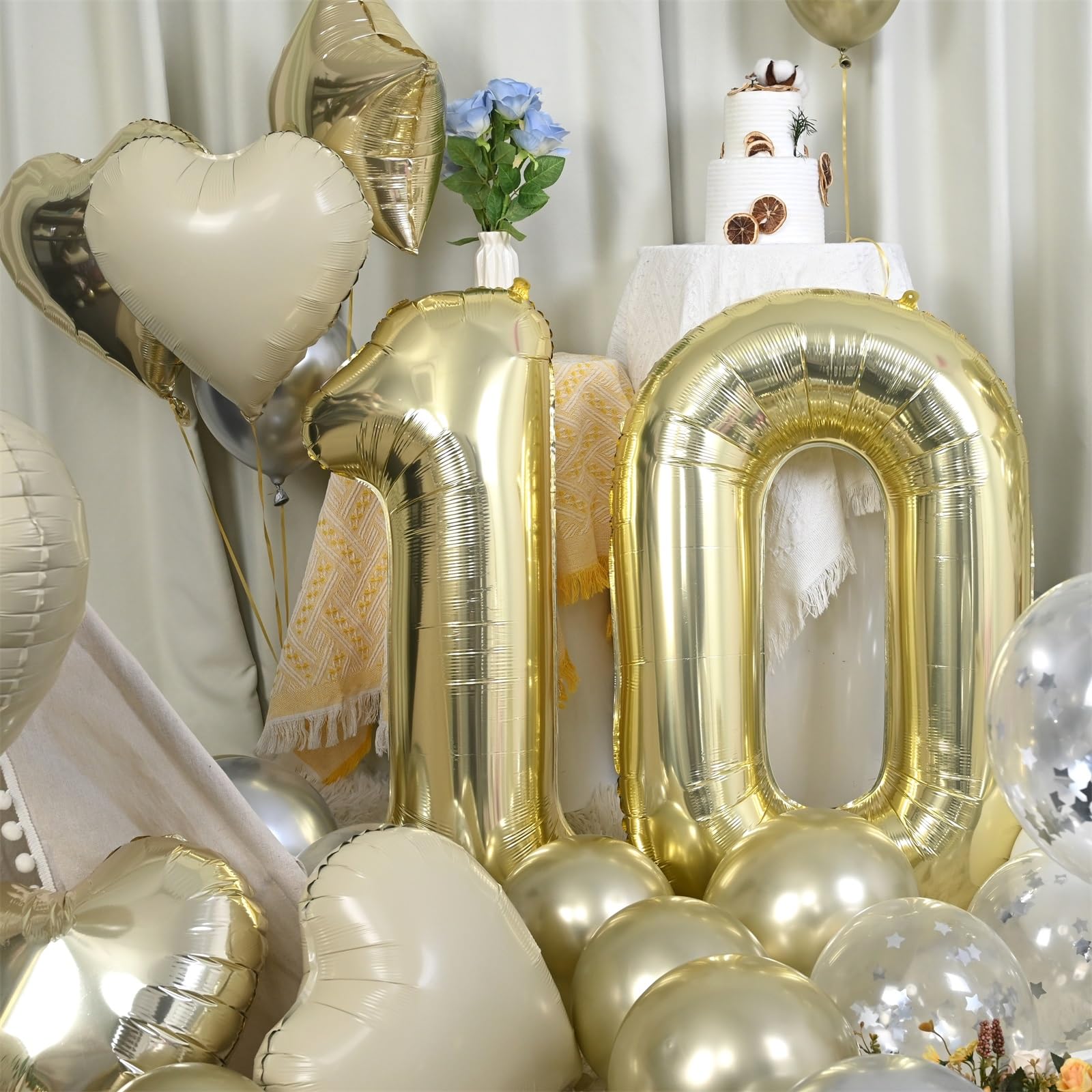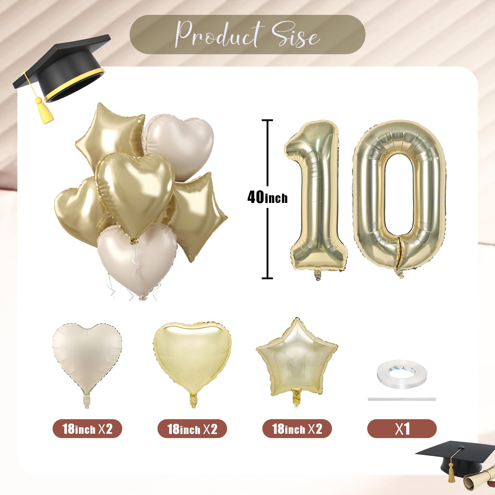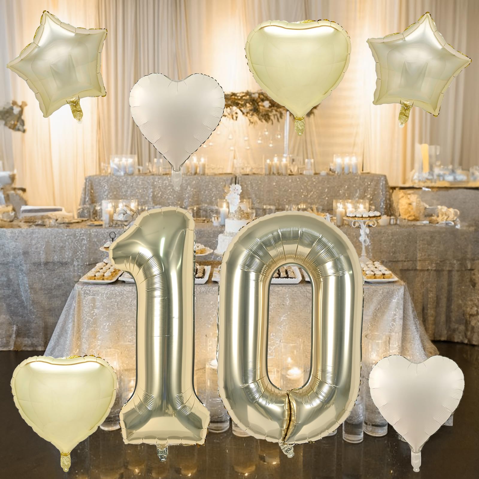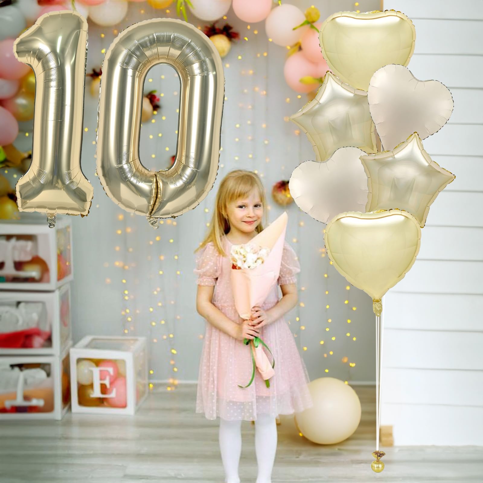 🎉 Champagne Gold Number 10 Balloon Set: Our foil balloons package include 40 inch light gold number 10 balloons (2pcs), 18 inch champagne gold heart balloons (2pcs), 18 inch cream heart balloons (2pcs), 18 inch light gold star balloons (2pcs), 10m ribbon(1 roll). With their colors and charming heart star shape, they can add love and joy to birthday party, weddings, anniversary and so on.